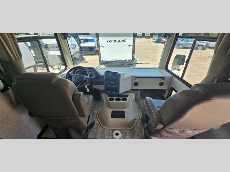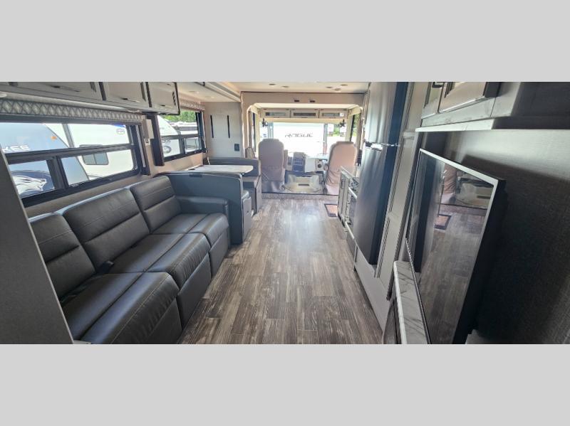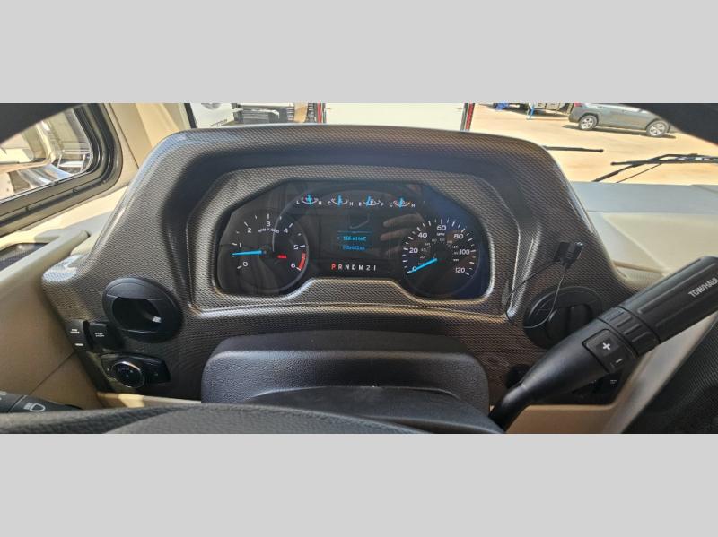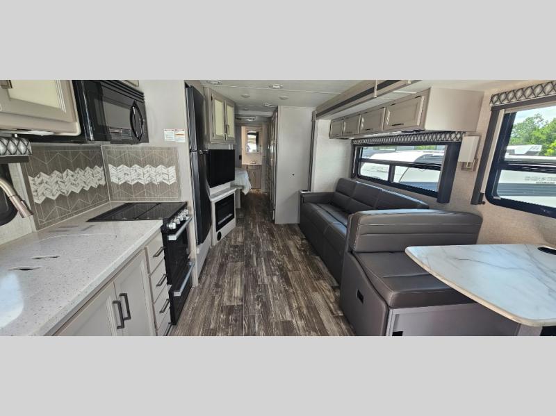 With any Hurricane Class A gas motorhome by Thor Motor Coach you will appreciate solid construction materials, like the welded tubular steel floor and the Vacu-Bond laminated roof, walls, and floor with block foam insulation. Each model sits on a Ford F-53 chassis with a 7.3L Triton V8 engine for power you can feel, plus there is an 8,000 lb. trailer hitch with a 7-pin round connector to pull your car along. The Rapid Camp+ multiplex system with Bluetooth will allow you to easily set up camp from the convenient 7" touchscreen provided, and the Winegard ConnecT WiFi extender +4G will let you catch up on work if needed. The Hurricane includes pressed laminated countertops inside, as well as residential vinyl flooring, decorative glass and tile backsplash in the kitchen, and many more at-home comforts.