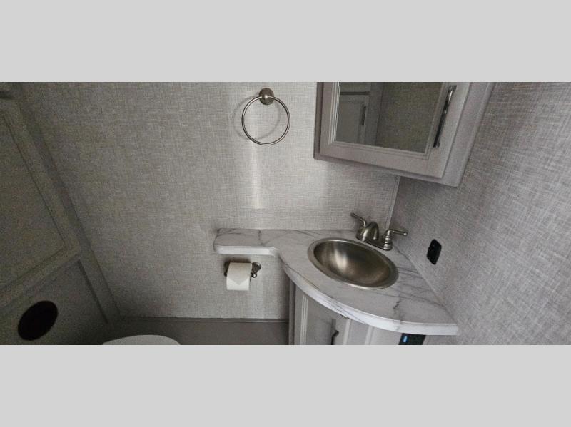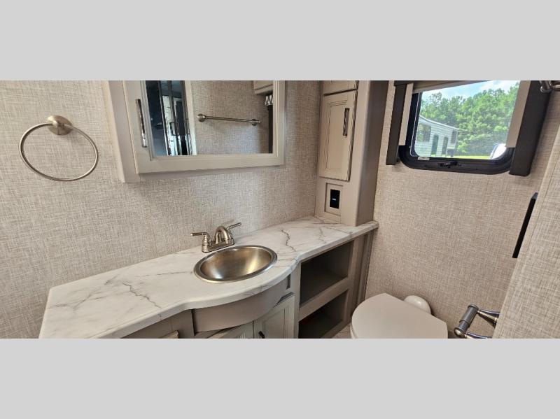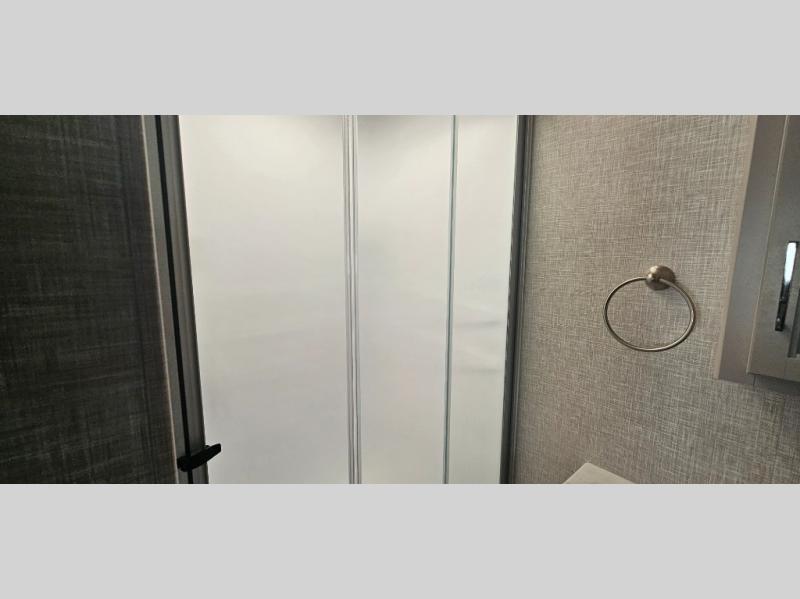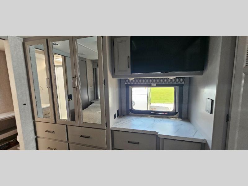 A bath and a half in this coach make it perfect for trips with friends and family. You will have tons of space provided by the two slide outs, plus a sleeping capacity of six to seven people each night. The expanding sofa bed has a great view of the 39" TV, and the Dream Dinette will be great for meal times and game night. Whip up a hearty meal on the three burner gas cooktop, or use the convenient over-the-range microwave oven. There is also a 12 cu. ft. residential refrigerator and a pantry for food storage. You'll be very pleased with the master bedroom that includes a king bed, a 32" TV, and a closet to keep your clothes wrinkle-free. There is even a second closet with stackable washer and dryer prep to make life on the road easier than ever.