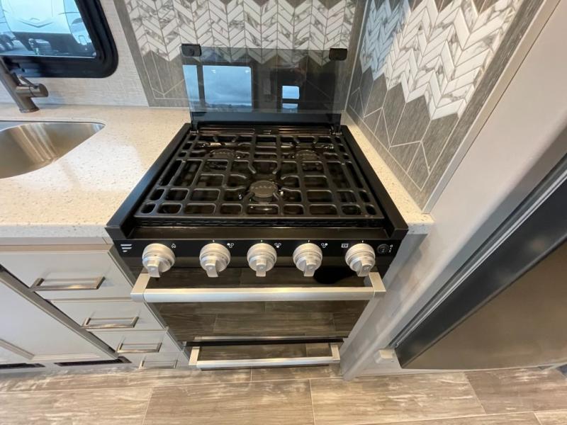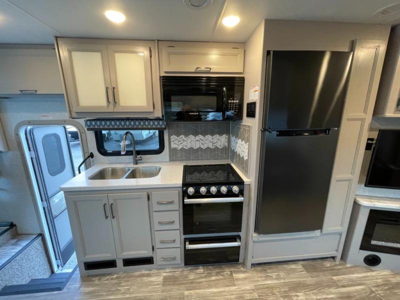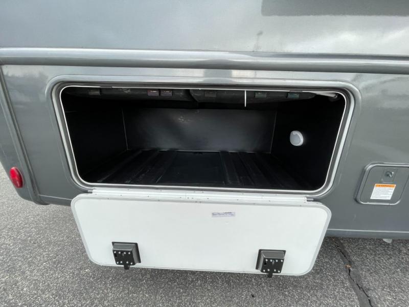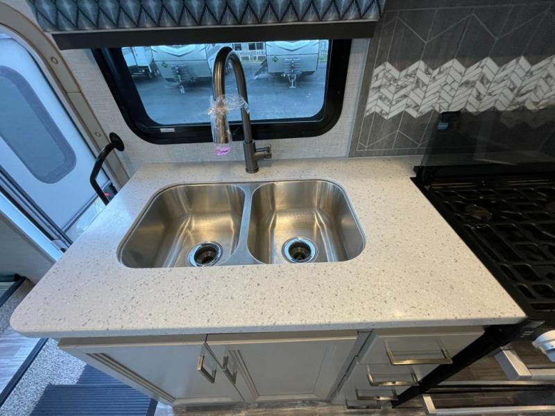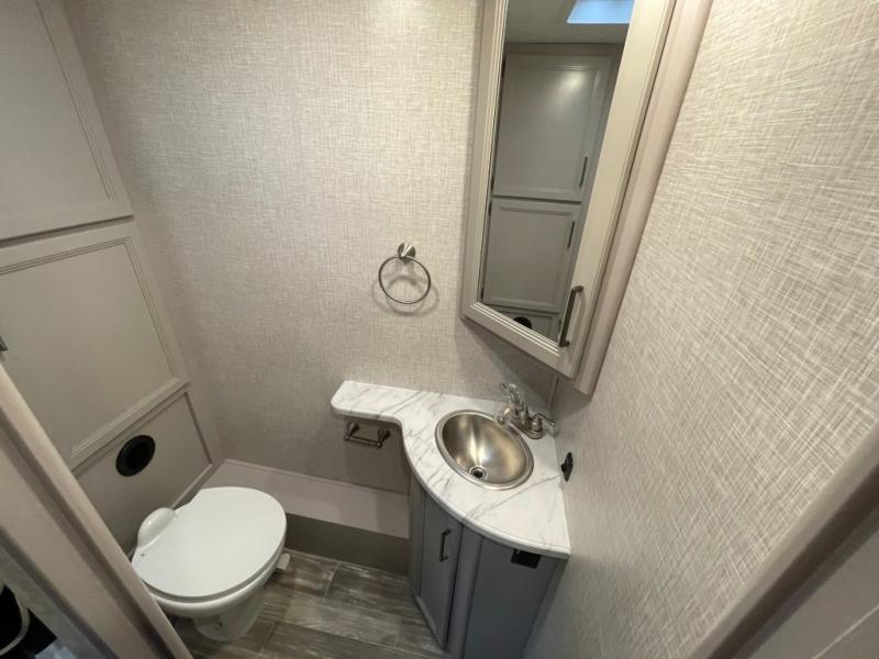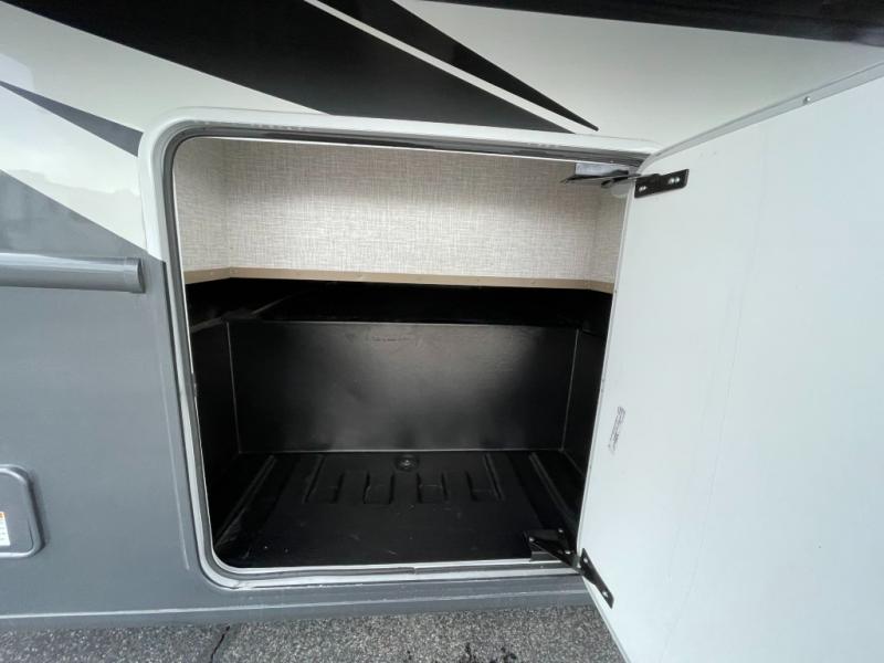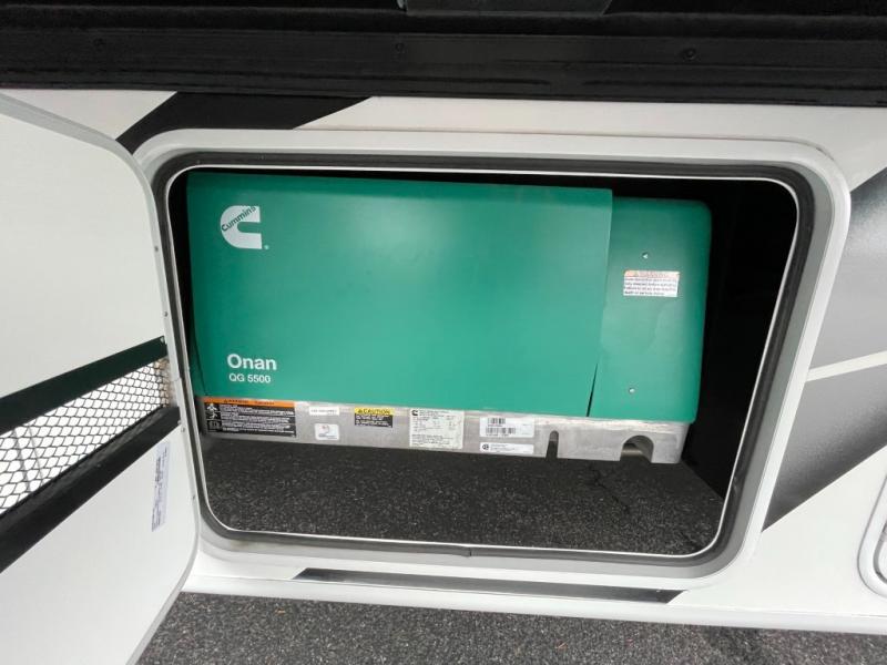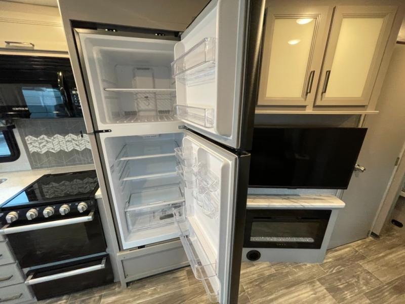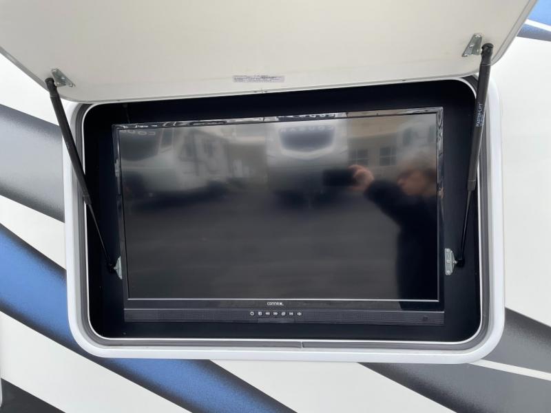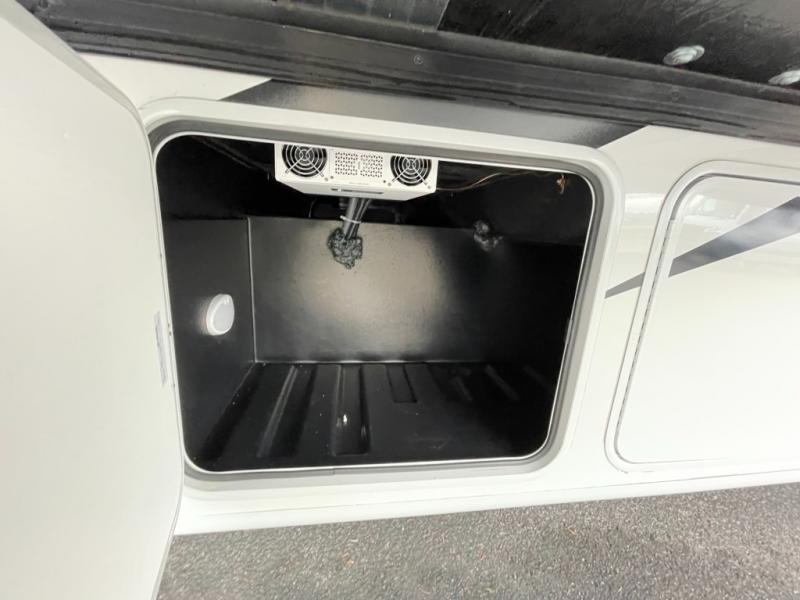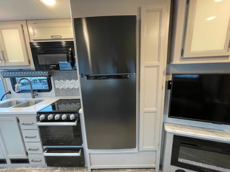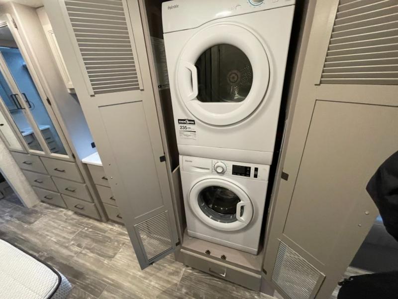A bath and a half in this coach make it perfect for trips with friends and family. You will have tons of space provided by the two slide outs, plus a sleeping capacity of six to seven people each night. The expanding sofa bed has a great view of the 39" TV, and the Dream Dinette will be great for meal times and game night. Whip up a hearty meal on the three burner gas cooktop, or use the convenient over-the-range microwave oven. There is also a 12 cu. ft. residential refrigerator and a pantry for food storage. You'll be very pleased with the master bedroom that includes a king bed, a 32" TV, and a closet to keep your clothes wrinkle-free. There is even a second closet with stackable washer and dryer prep to make life on the road easier than ever.