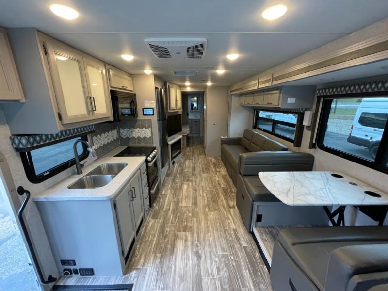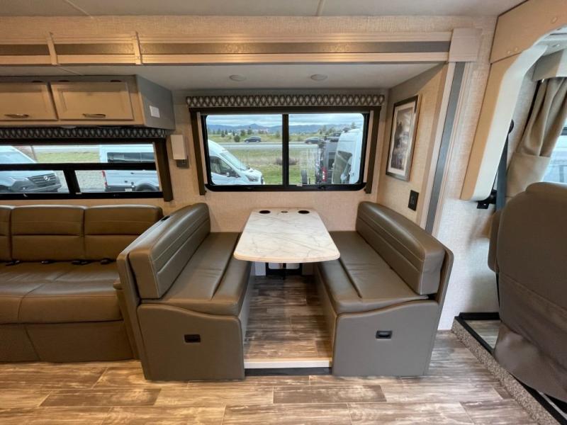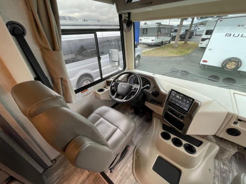 With any Hurricane Class A gas motorhome by Thor Motor Coach you will appreciate solid construction materials, like the welded tubular steel floor and the Vacu-Bond laminated roof, walls, and floor with block foam insulation. Each model sits on a Ford F-53 chassis with a 7.3L Triton V8 engine for power you can feel, plus there is an 8,000 lb. trailer hitch with a 7-pin round connector to pull your car along. The Rapid Camp+ multiplex system with Bluetooth will allow you to easily set up camp from the convenient 7" touchscreen provided, and the Winegard ConnecT WiFi extender +4G will let you catch up on work if needed. The Hurricane includes pressed laminated countertops inside, as well as residential vinyl flooring, decorative glass and tile backsplash in the kitchen, and many more at-home comforts.
