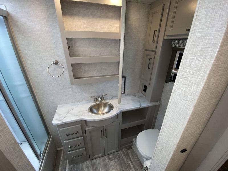 A bath and a half in this coach make it perfect for trips with friends and family. You will have tons of space provided by the two slide outs, plus a sleeping capacity of six to seven people each night. The expanding sofa bed has a great view of the 39" TV, and the Dream Dinette will be great for meal times and game night. Whip up a hearty meal on the three burner gas cooktop, or use the convenient over-the-range microwave oven. There is also a 12 cu. ft. residential refrigerator and a pantry for food storage. You'll be very pleased with the master bedroom that includes a king bed, a 32" TV, and a closet to keep your clothes wrinkle-free. There is even a second closet with stackable washer and dryer prep to make life on the road easier than ever.