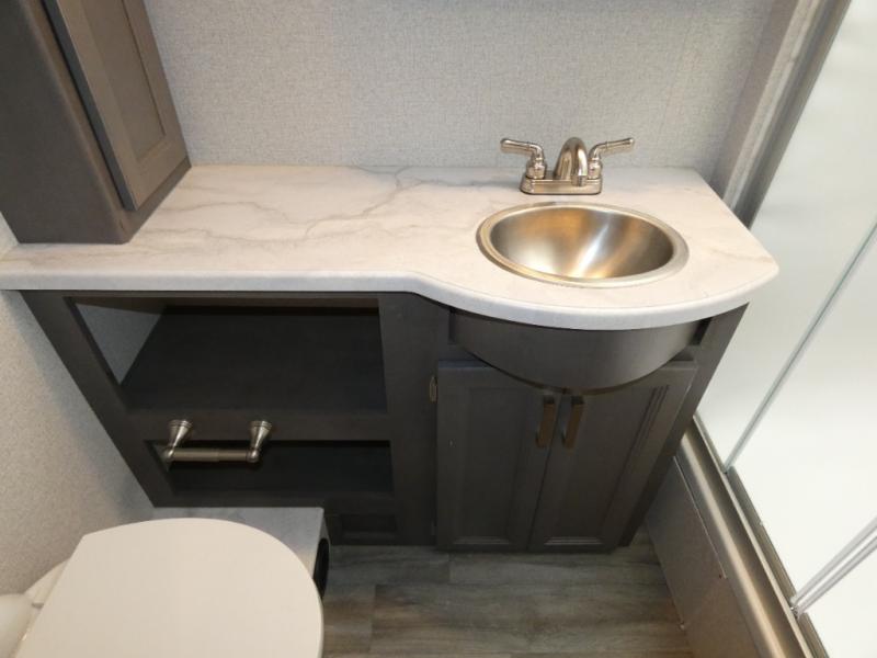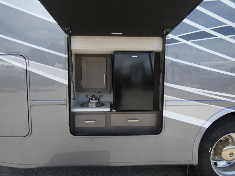 The Luminate BB35 Class A gas motorhome is super spacious featuring a full wall slide along the roadside and with the added pair of bunk beds increases the sleeping capacity to ten! A drop-down bunk over the cab has a 48" x 74" sleeping area, plus there's the dream dinette and a sofa bed in the living area. You will also love the rear master bedroom which features a spacious king bed and plenty of storage, plus a 32" TV above the dresser. A sliding door to the master conserves floor space so there's room to walk around the entire bed as well as having the closet and dresser as part of the full slide giving you a nice space to get away from it all. If you're thinking about feeding all those guests, no worries! Choose from the fully equipped kitchen with three-burner gas cooktop and oven, convection microwave and residential refrigerator, or step outside and cook in the fresh air at the exterior kitchen. You can even enjoy the 32" exterior TV while you're out there!