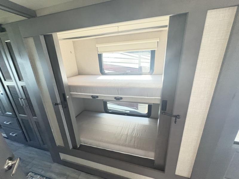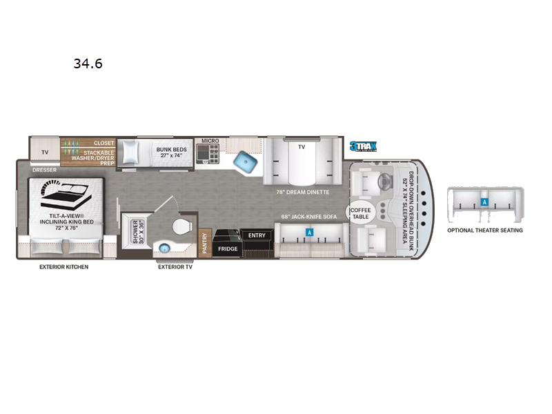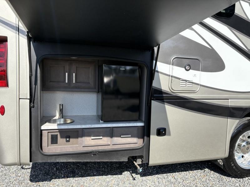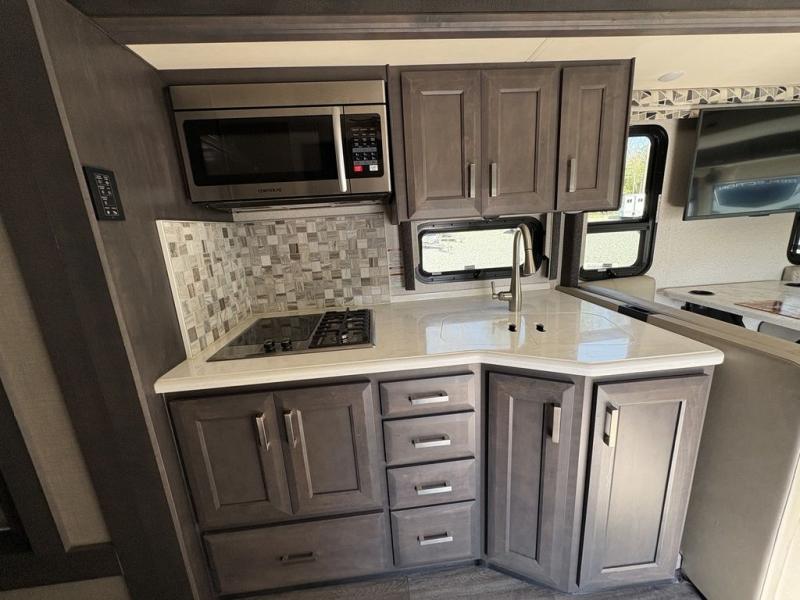 If you're wanting to upgrade from a travel trailer to a motorhome, your search is over with this Miramar! You can comfortably sleep nine people between the bunk beds, the drop-down overhead bunk, the Tilt-A-View inclining king bed, plus the furniture in the living area. And don't worry about space because this model features a full-wall slide that will open up the whole coach. You can choose between three LED TV's to watch a movie on; a 40" in the living area, a 32" in the bedroom, plus a 40" exterior TV! The kitchen is fully-equipped to cook meals each day, including a two burner single induction cooktop, a stainless steel convection microwave, plus a residential refrigerator for perishables. This model also includes an exterior kitchen with a refrigerator and a sink for snacks outdoors!