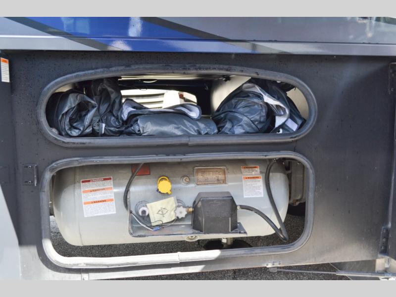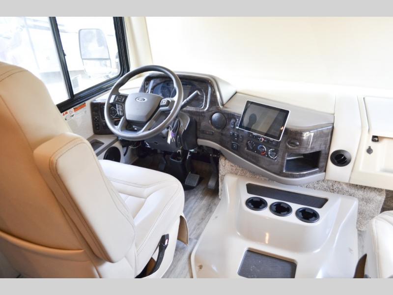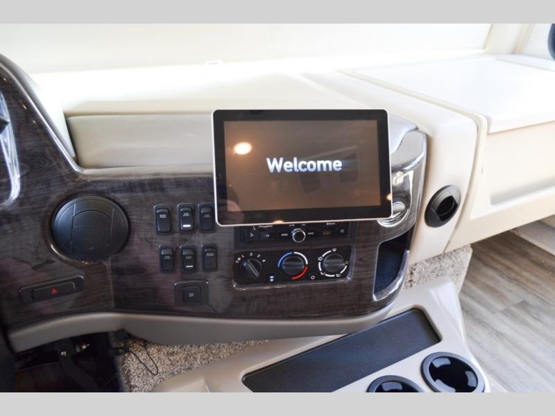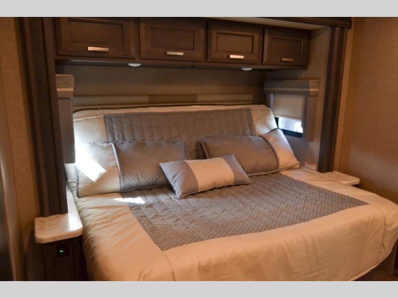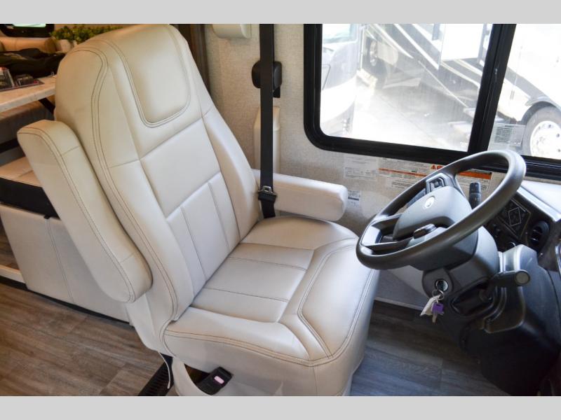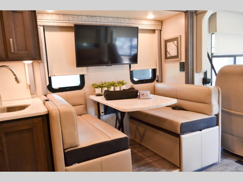 With any Miramar Class A gas motorhome by Thor Motor Coach you will find a durable welded tubular aluminum roof and sidewall cage construction, rotocast storage compartments, and frameless windows for a more sleek look. The 100-watt solar charging system with a power controller will allow you to do some off-grid camping, and you'll have an Onan RV QG 5500 gas generator on board for all your power needs. Each model includes the Rapid Camp+ multiplex wiring control system for quick and easy set up, and the Winegard ConnecT WiFi extender +4G will be perfect if you need to telecommute. Inside you'll find residential vinyl flooring, leatherette furniture, plus satin finish cabinetry with solid wood flat panel cabinet doors and nickel finish hardware for a truly luxurious coach!