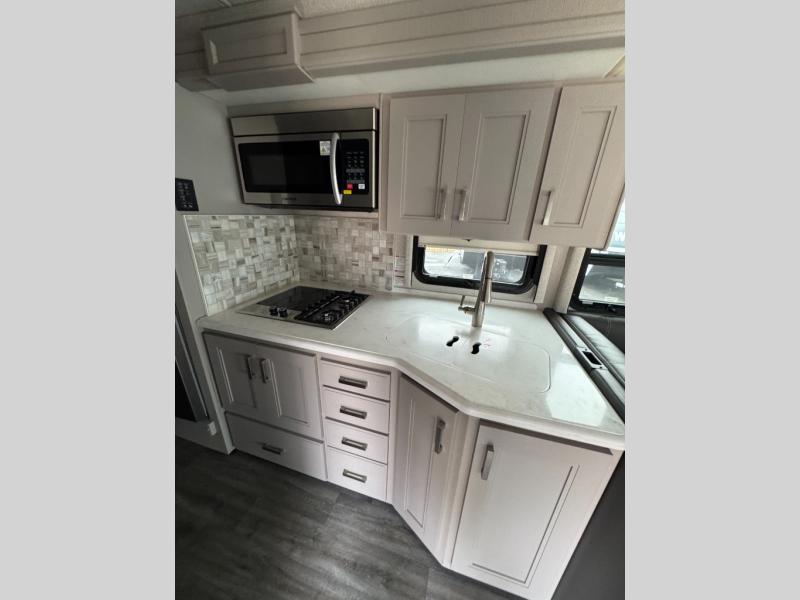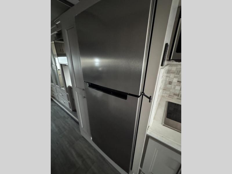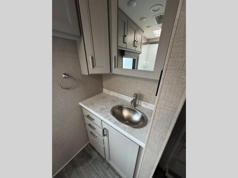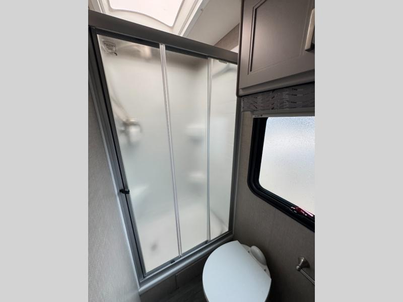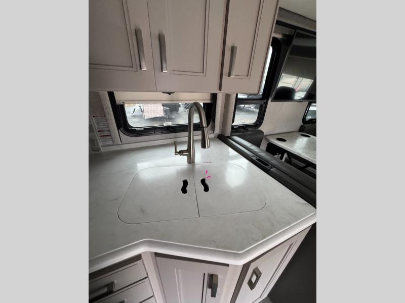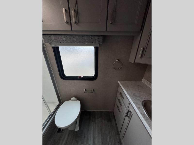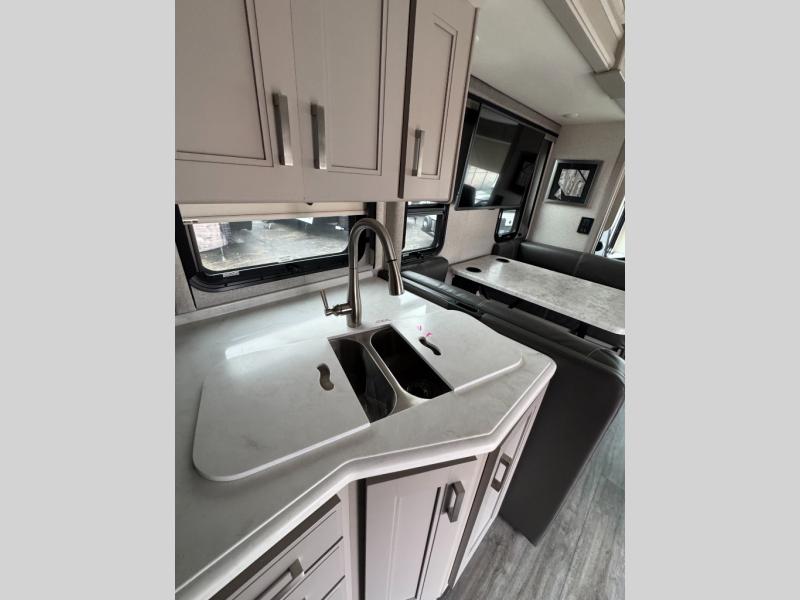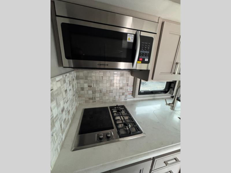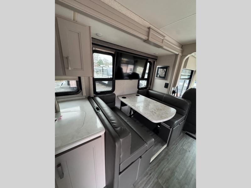 Head out on your greatest of adventures with this motorhome! You will feel right at home in the master suite with the Tilt-A-View inclining 72" x 76" king bed slide across from a closet with a dresser and a 32" TV, plus you have access to the full rear bathroom which has a 30" x 36" shower to get squeaky clean each morning. If you add the optional stackable washer and dryer to the prepped area then you can extend your trips with clean clothes. The two burner high output gas range top with a single induction cooktop will be easy to cook your favorite meals on and the 72" Dream Dinette offers a comfortable place to enjoy them. The drop-down 52" x 74" bunk over cab can not only be used for sleeping, but also for storage space. You also have a 68" jackknife sofa to read a book on during the day and transform into an extra sleeping space at night or you can switch it out for the optional theater seating!