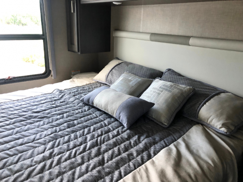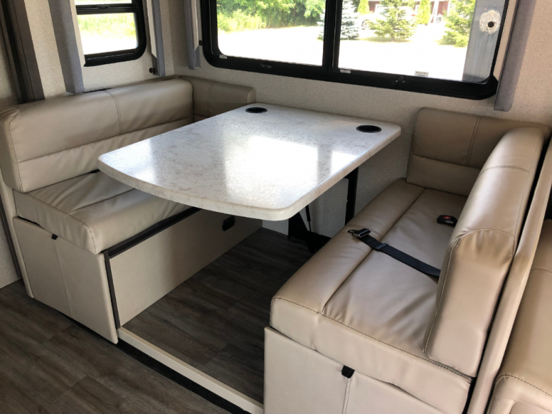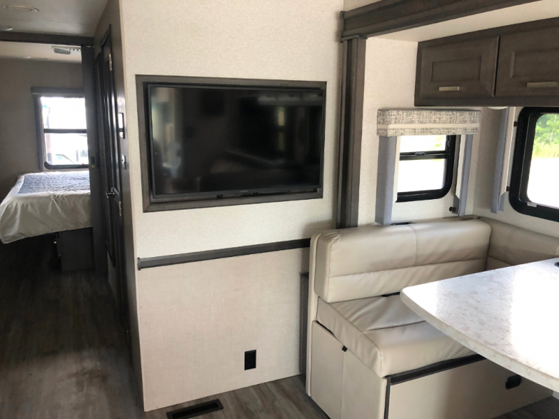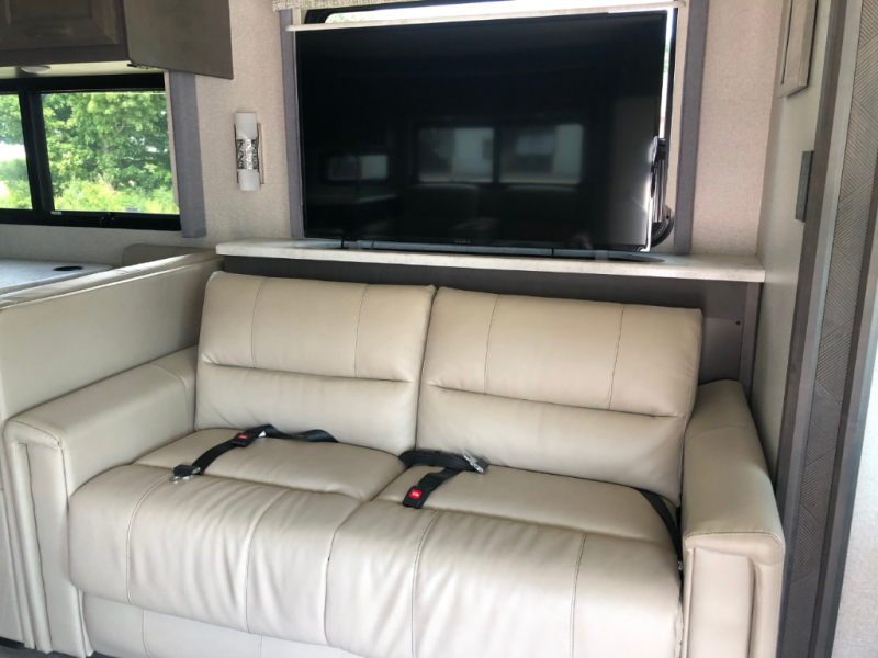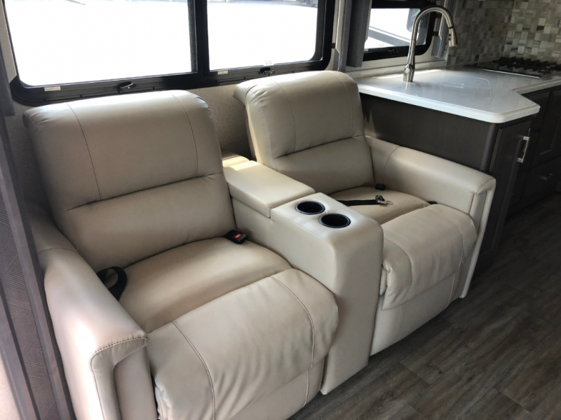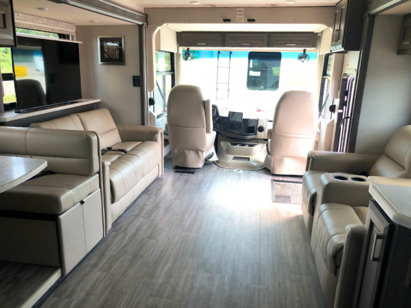 With any Miramar Class A gas motorhome by Thor Motor Coach you will find a durable welded tubular aluminum roof and sidewall cage construction, rotocast storage compartments, and frameless windows for a more sleek look. The 100-watt solar charging system with a power controller will allow you to do some off-grid camping, and you'll have an Onan RV QG 5500 gas generator on board for all your power needs. Each model includes the Rapid Camp+ multiplex wiring control system for quick and easy set up, and the Winegard ConnecT WiFi extender +4G will be perfect if you need to telecommute. Inside you'll find residential vinyl flooring, leatherette furniture, plus satin finish cabinetry with solid wood flat panel cabinet doors and nickel finish hardware for a truly luxurious coach!