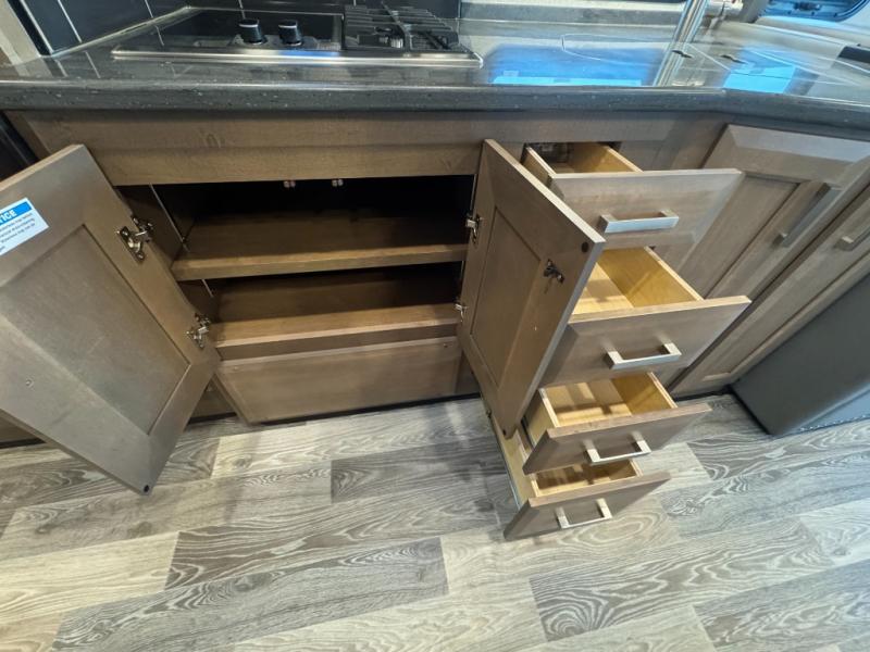 Load up the side-by-side and invite your friends along for the trip in this spacious toy hauler coach. During the day you can set up the patio deck that includes three seasons patio doors with a screen and privacy panels. You'll find the main living area cozy with its Dream dinette and sofa bed, plus there is a 40" LED TV here. The chef can prepare dinner on the two burner gas cooktop, or use the stainless steel convection microwave, and check out the residential refrigerator for all your perishables. The queen bed slide out in the private bedroom will provide a great night's rest, and you'll enjoy your own 32" LED and a wardrobe for your clothes. This model also includes a 40" LED exterior TV; that makes four TV's for all your entertainment needs!