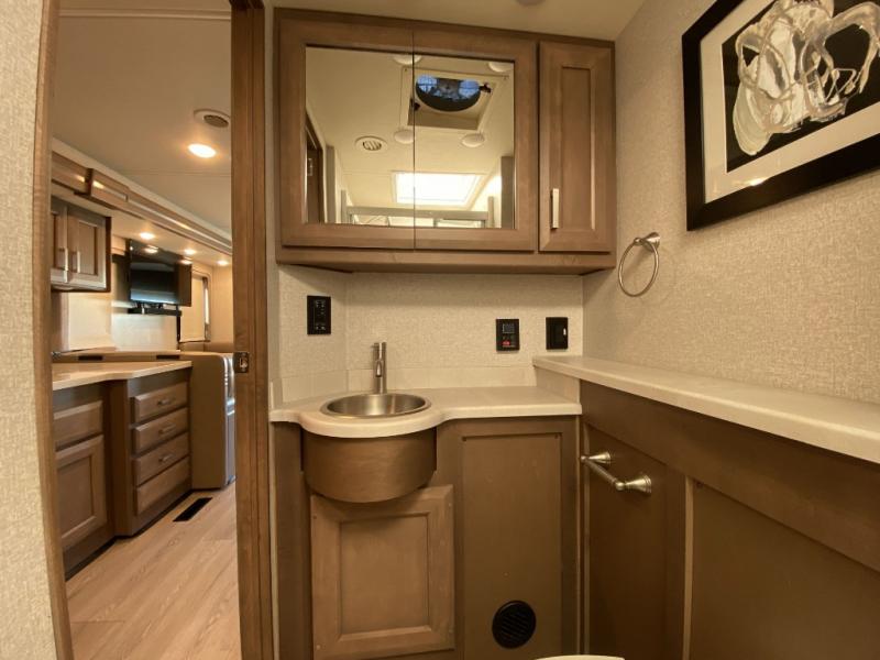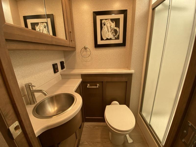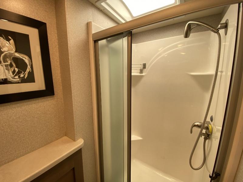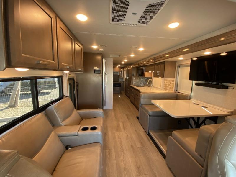 Make your trip across the country comfortable in this Class A diesel motorhome. Once you park, the swivel captain's seats can become a part of the living area, plus there are 68" inclining theater seats across from the 40" LED TV for your comfort. Once lunch is prepared on the electric induction cooktop, you can dine together at the Dream Dinette. You'll be pleased to find a residential refrigerator in the kitchen, along with a pantry and a large double bowl stainless steel sink. The full bath includes everything you need to stay fresh each day, and the rear bedroom will feel just like home. Here, you'll enjoy a Tilt-A-View inclining queen bed, a slide out wardrobe, plus a second wardrobe, and a 32" TV. If you love spending time outdoors, then this model has you covered with an 18' power awning with LED lights and an exterior 39" TV!