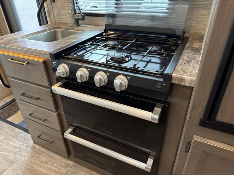You will love the versatility that traveling in this Quantum SE coach offers. Your family of four or five will be quite at-home anywhere you go. You can easily jump in and drive until you reach your destination, or until you are tired and need a break from the road. The backup monitor will make parking off the road a breeze. Once you are settled in your spot, you can enjoy your surroundings. There is a power awning with LED lighting so a campfire and s'mores for the kids will be an easy task where you can monitor them and enjoy the night air. Inside, you will find complete kitchen amenities for cooking inside with a three burner cooktop, microwave oven, and refrigerator. At night, snuggle the kids up on the cab-over bunk that is 52" x 96", or on the 76" Dream Dinette once folded down. In back, a 54" x 80" queen-size bed with storage on two sides awaits two more tired travelers for a great night's rest. And there are options to add including an exterior 32" TV.