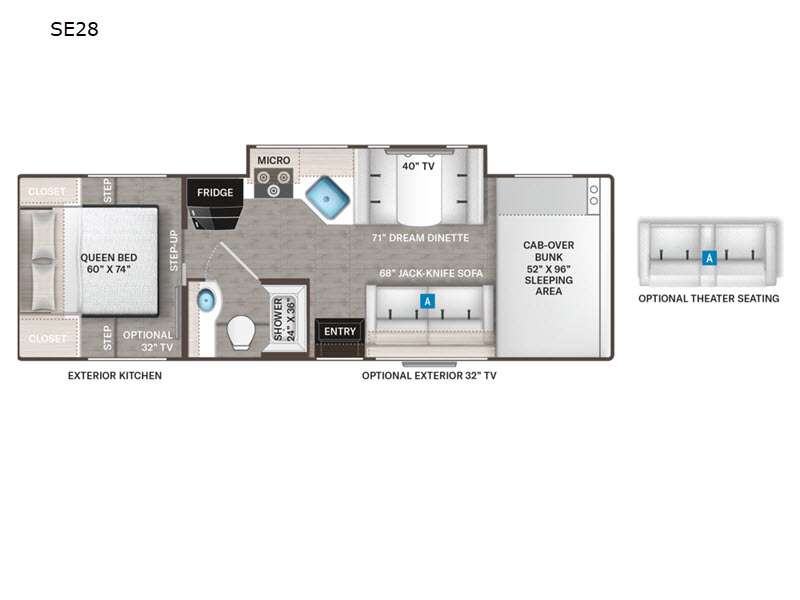 Seating and sleeping for seven family members or friends will make this a great choice for traveling both near and far. This unit features a large slide out for added interior space, plus plenty of storage both inside and out. The kids will love the cab-over bunk for sleeping and relaxing. You will also find sleeping space for three more up front with the 68" jack-knife sofa and 71" Dream Dinette. You can easily transform each of these into comfortable sleeping spaces at night. A private bedroom just one step up beyond the kitchen and bath area provides a bit of privacy from the rest of the coach, and there are two nice closets for your things. You can even add an optional 32" TV here if you like. You will find plenty of overhead storage throughout, and the MEGA-Storage outside is great for outdoor games, toys, and other camping equipment that you can keep neat and organized until you need them. The optional exterior kitchen gives the cook more choices too! You might even like to add the optional exterior 32" TV to watch while relaxing under the power awning.