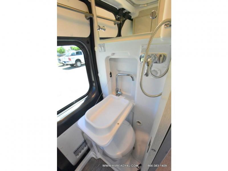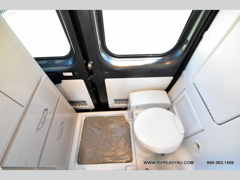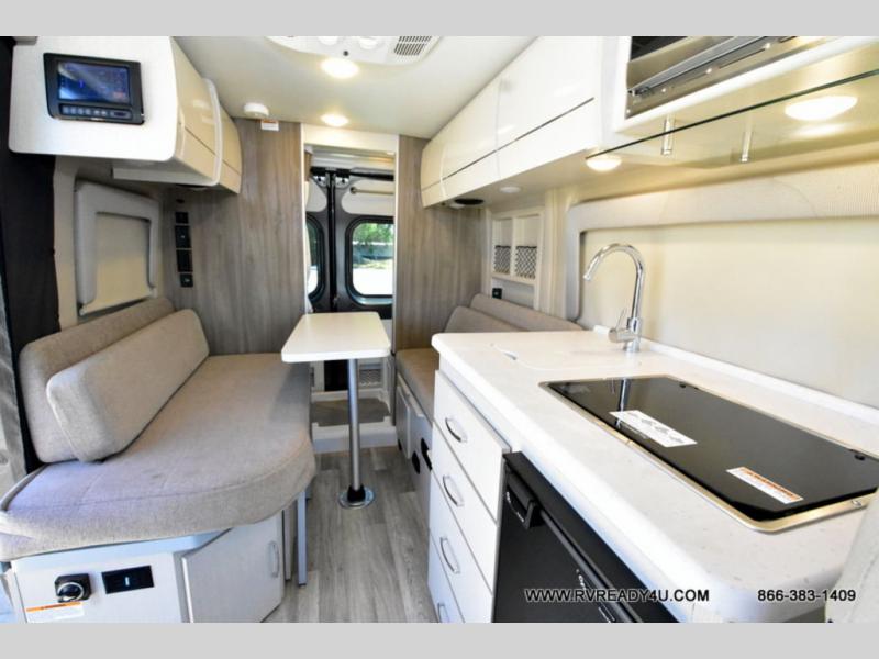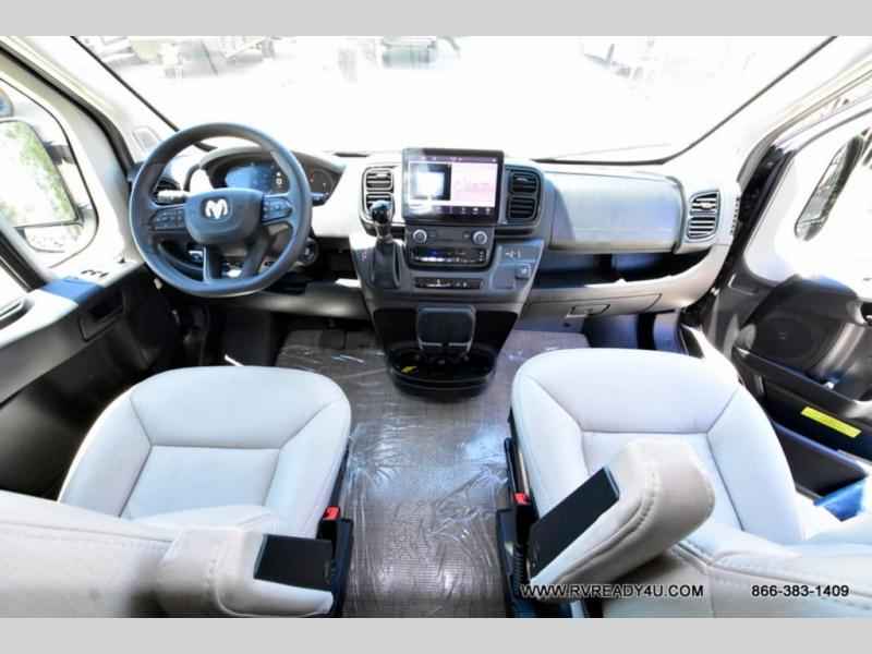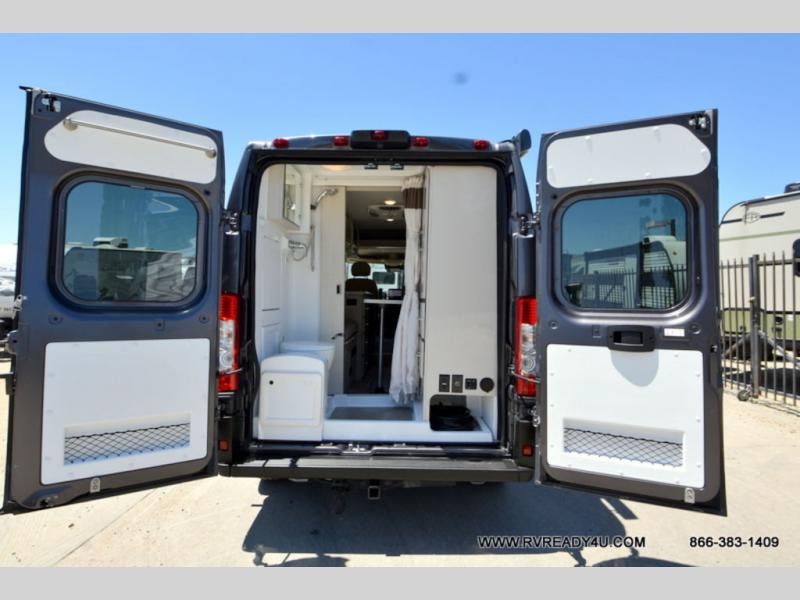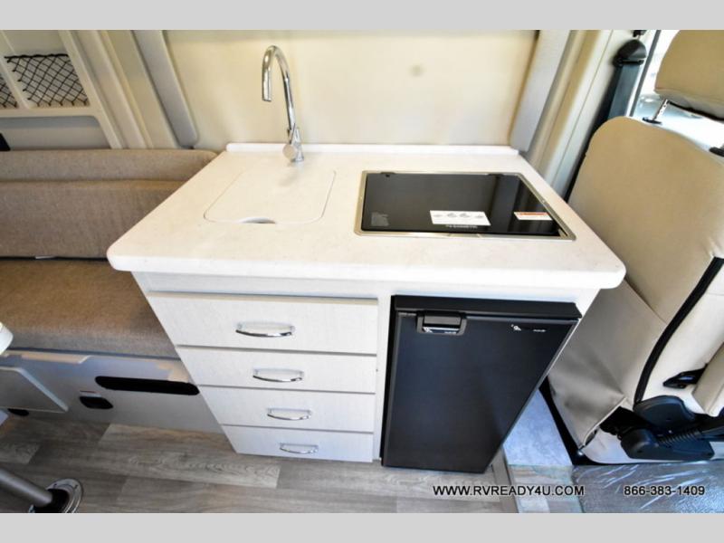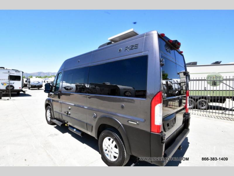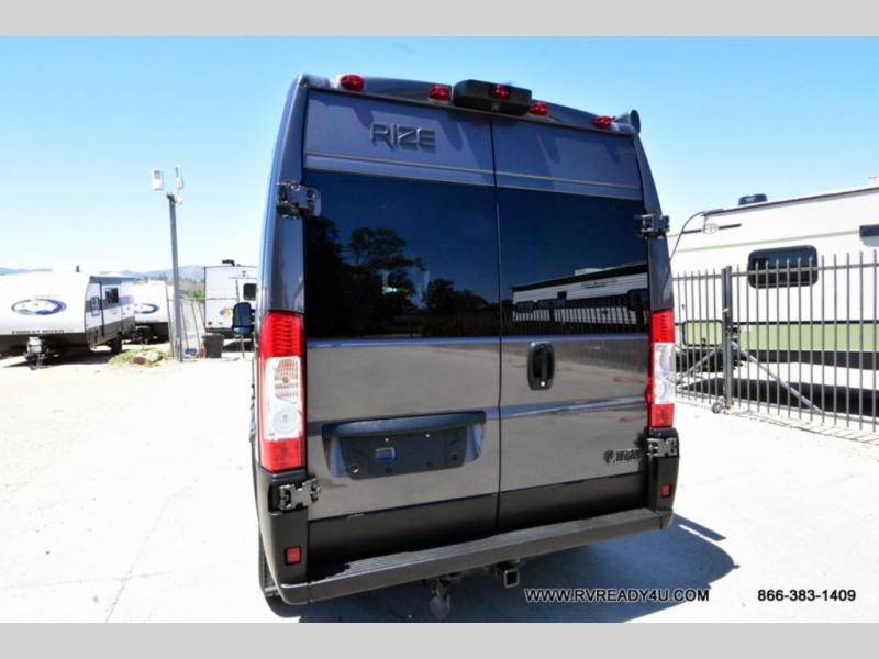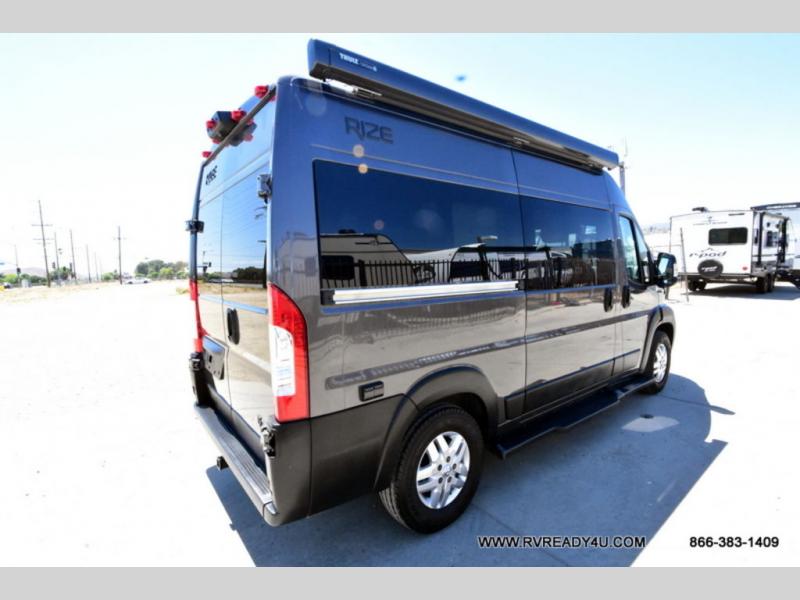 The Rize Class B gas motorhome by Thor Motor Coach allows you to experience the camping lifestyle in a compact RV packed with convenient features. There is a 3.6L Pentastar V6 engine and 276 HP to power your excursions, and the outdoor enthusiast will love the 190W solar panel and solar charge controller. Each model includes residential vinyl flooring, TechnoForm Euro-style upper cabinet doors, and premium window privacy shades. You'll find pressed countertops in the kitchen and a glass protective cover and task lighting above the cooktop to easily cook meals each day. The keyless entry system adds to the convenience found throughout these models, plus there is an exterior LP connection if you want to hook up your own grill and a rear water sprayer to wash off your hiking boots.