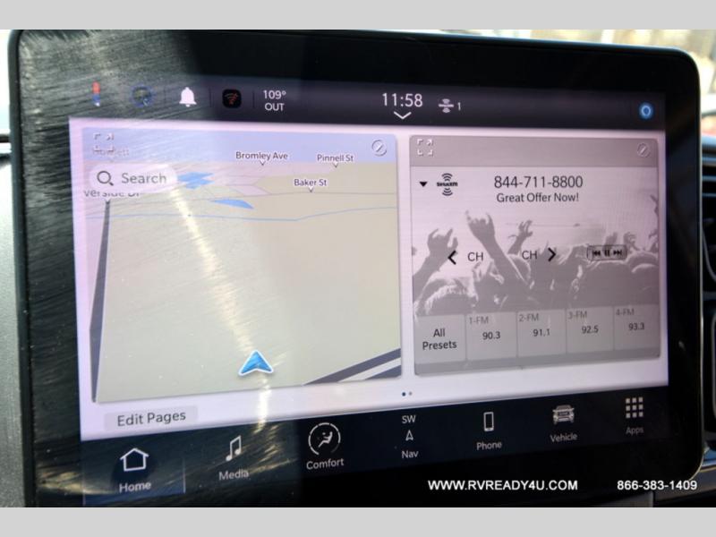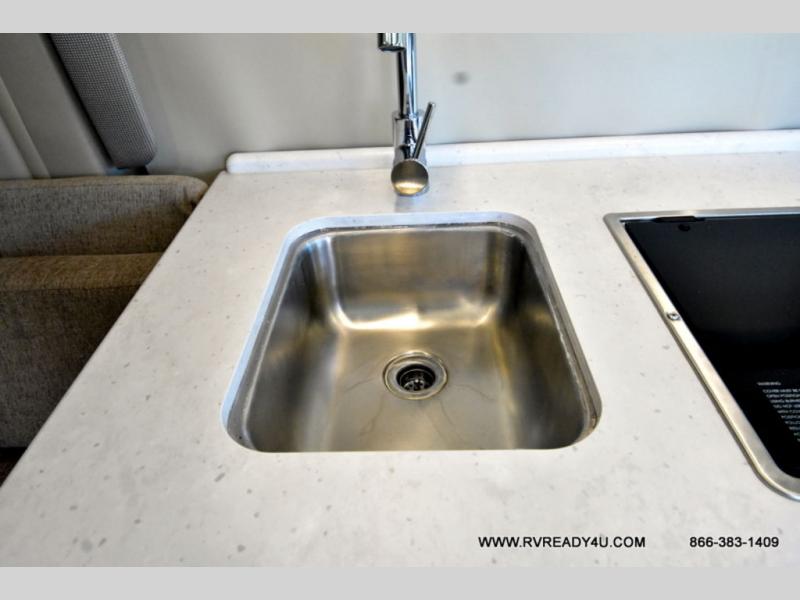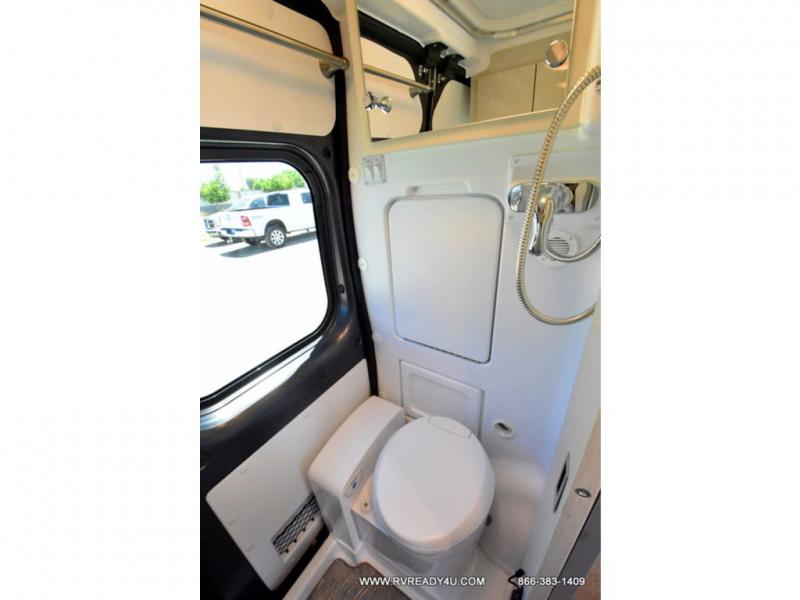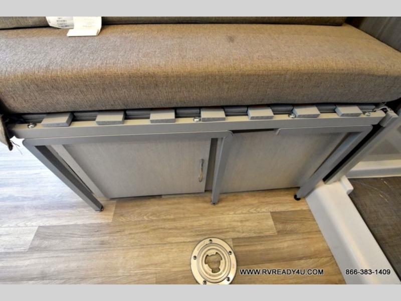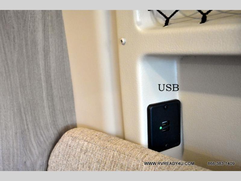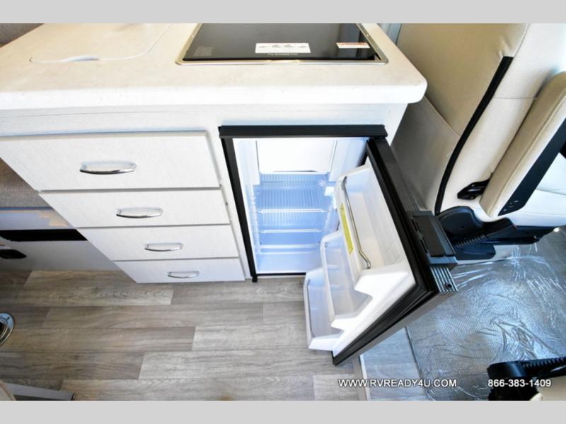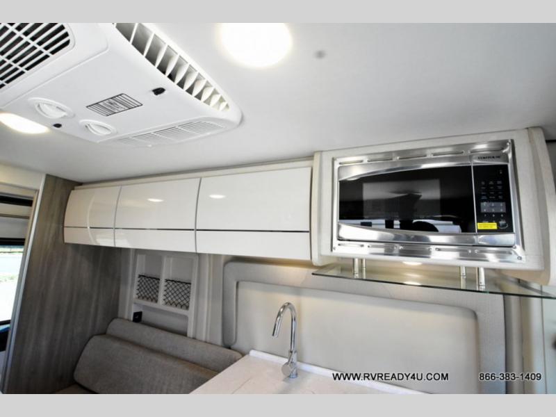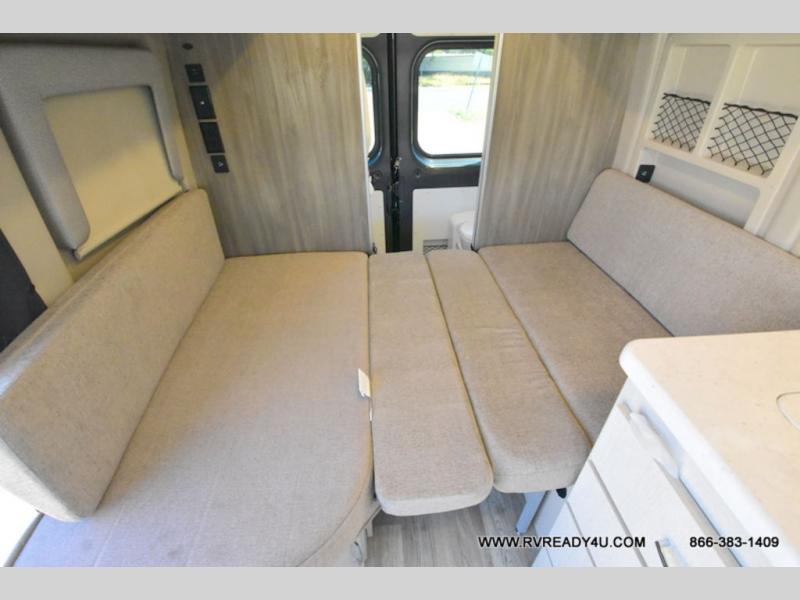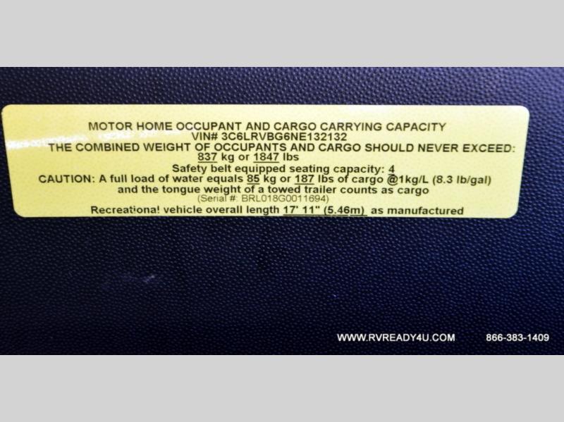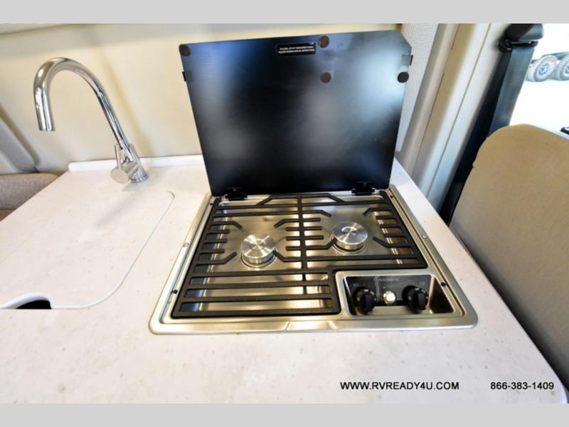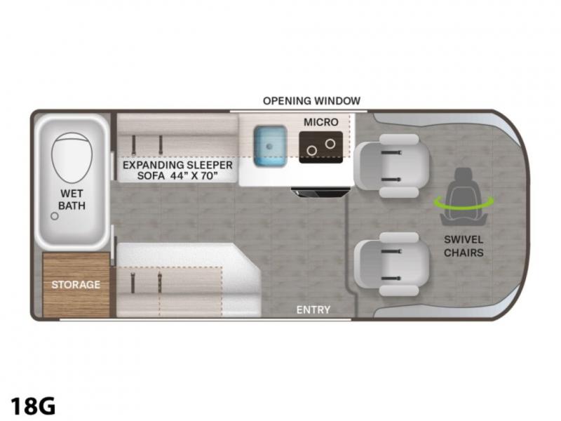 Travel easily in this Rize 18G motorhome. When you are ready to get off the road for a few hours or several days you will have plenty of comforts to enjoy before you head to your next location. The expanding sleeper sofa offers plenty of seating during the day and additional seating can be found opposite with each seating area offering one set of seat belts for two rear travelers. Create meals on the go with a two-burner gas cooktop and microwave oven, you can dine while seated in one of the captain's chairs that swivel, or from the seating in back. Create a 44" x 70" sleeping space at night with the expanding sofa along the curbside. The large opening window above the sink and stove will provide plenty of fresh air throughout, and the wet bath in back is a convenience that you just can't beat while on the road or in camp!