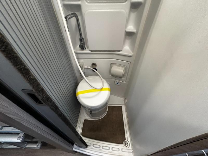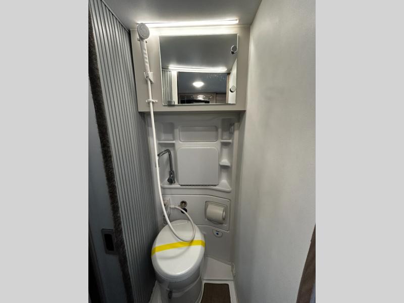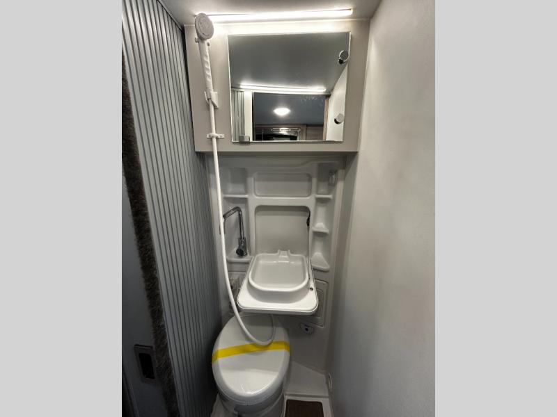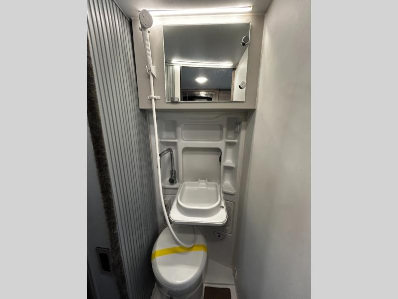 Start traveling the right way with this motorhome! It features a rear 72" x 66" pull out bed with under bed storage for extra blankets or other necessities, plus there are large opening side windows at the head and foot of the bed to let in more natural lighting and fresh air. Freshen up each morning in the manual enclosed wet bath with a cassette toilet and a closet next to it to store your towels. Once you have prepared your best home cooked meal with the gas two burner cooktop, you can head to the collapsible dinette table to enjoy them there comfortably and then watch your favorite movie on the 24" TV!