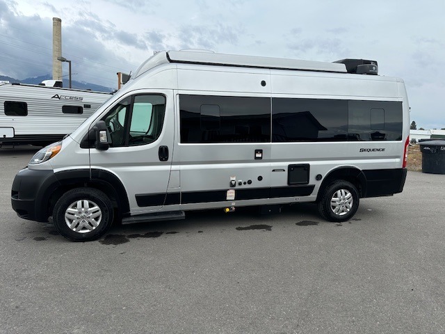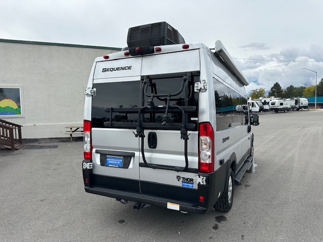 Each one of these Thor Motor Coach Sequence Class B gas motorhomes are built with a RAM Promaster 3500 XT window van chassis and powered by a fuel-efficient V-6 engine for an easy drive, economical explorer van! Their internal storage capacity is increased by the driveshaft not running to the rear making it possible for the holding tanks, electrical components, and LP systems hidden underneath. They are Thule equipped with a roof ladder to view your destination in a different perspective, a bike rack for two adult bikes, and a lateral arm patio awning with integrated LED lighting. Modern living and convenience is what you will find throughout the interiors with a premium touchscreen dash radio, Apple Car Play and Android Auto that connects your favorite music and podcasts through USB or Bluetooth, and TecnoForm S.P.A. Euro-style cabinetry. Plus, there is residential vinyl flooring so you can bring your furry friend along and not worry about messes becoming stains!