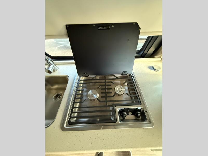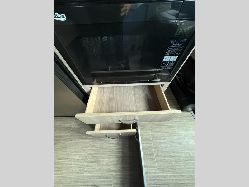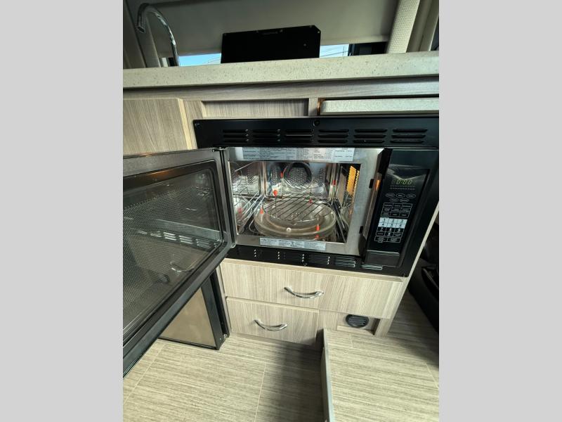 Travel the country with your favorite person in this motorhome! You can freshen up after a long day of traveling in the rear enclosed wet bath with a power vent fan to eliminate unwanted steam and a wardrobe with drawers to store your clothes and towels. Enjoy a good night's rest on the 74" x 80" expanding sleeper sofa once converted with removable tables in between them to eat your meals. The kitchen not only has a gas two burner cooktop, single door stainless refrigerator, and convection microwave, but also a pull-out cutting board and flip-up countertop. There are even large opening side windows to let in some fresh air and natural lighting!