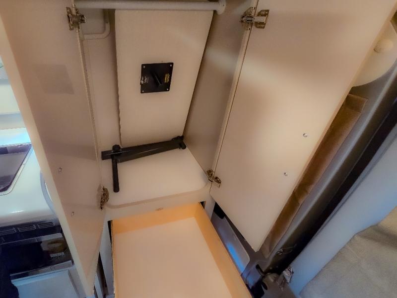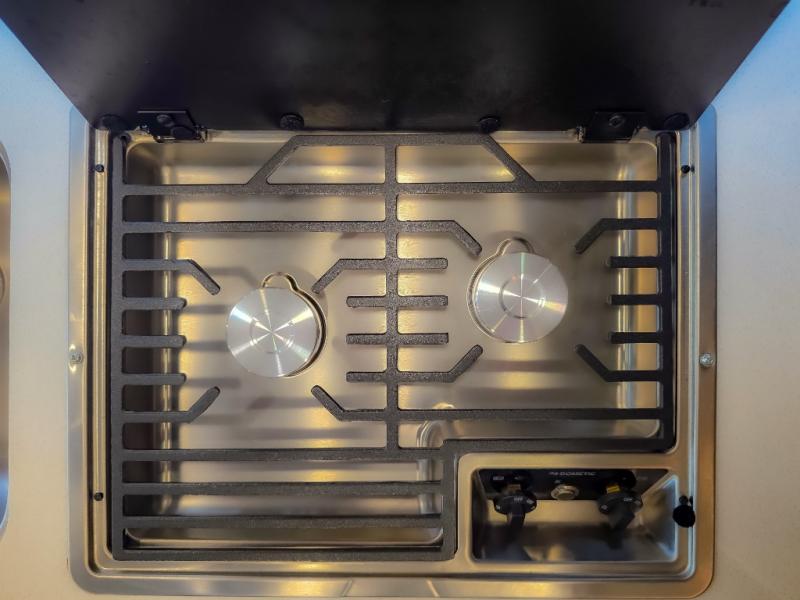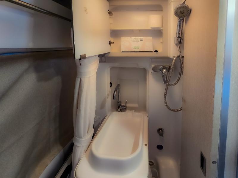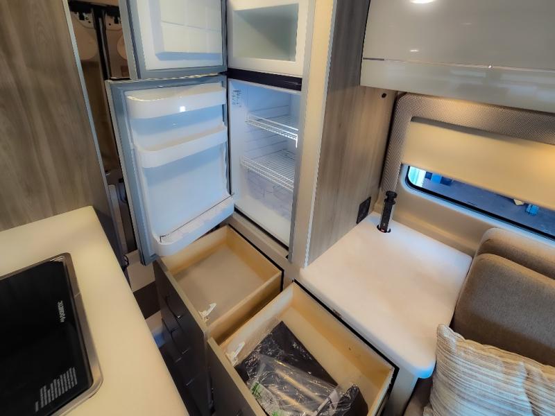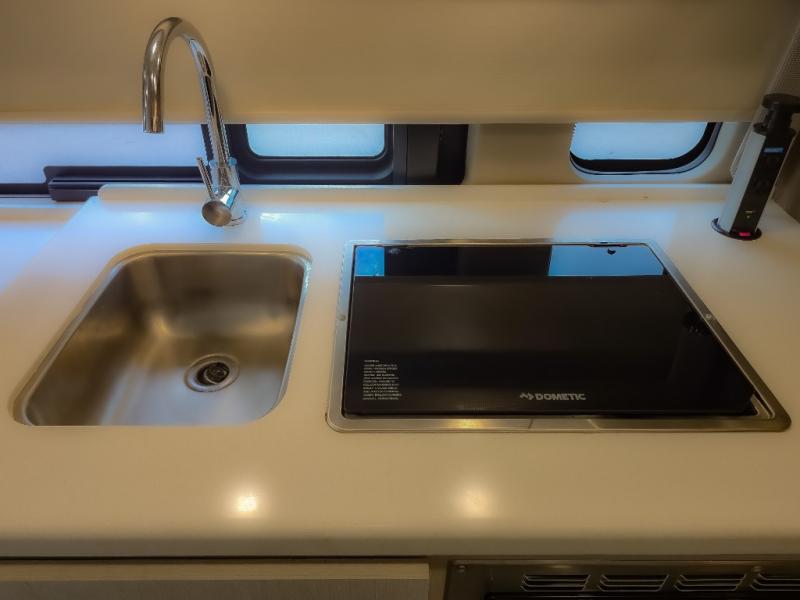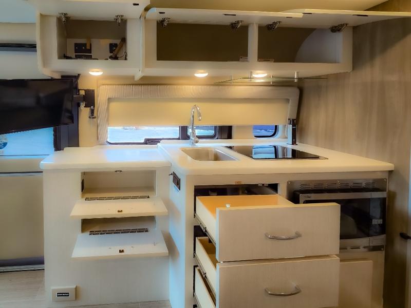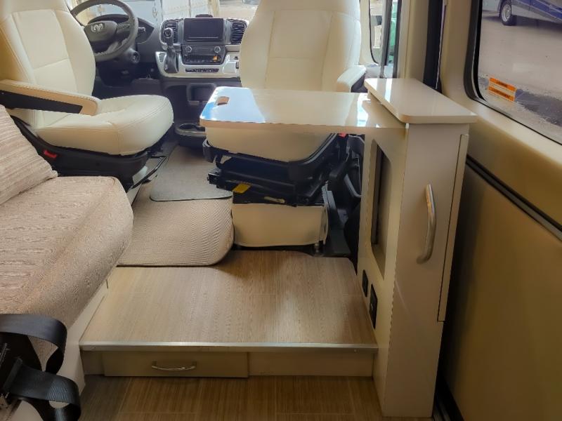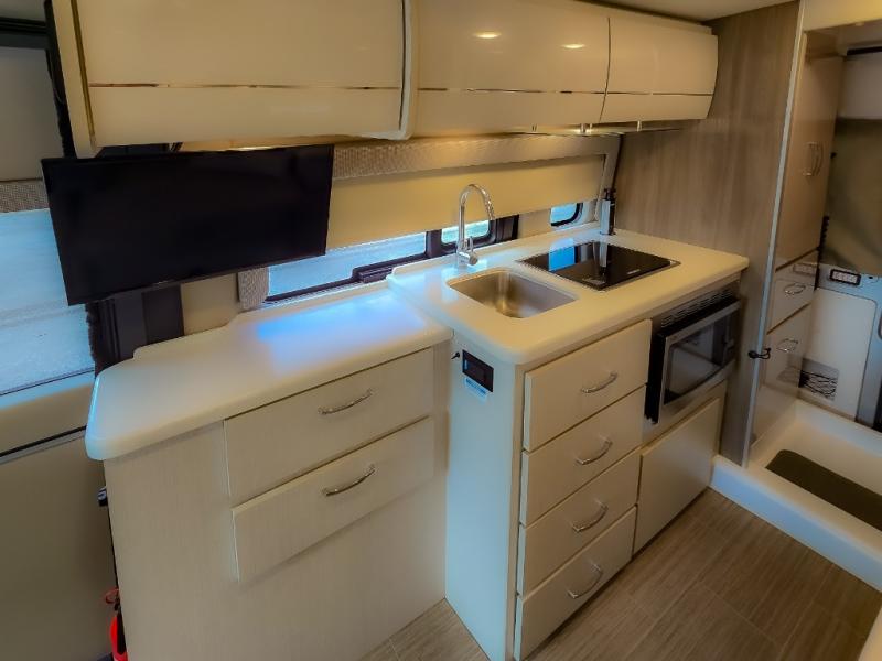 If you want to tour the country while working on the road, you must check out this Tellaro Class B gas motorhome! Whether it's for business or pleasure, this Tellaro is equipped to help you make the most of your off-grid adventures. It has a flip-up countertop located behind the passenger swivel cab seat, so you can use this space as a work desk. It can also serve as an additional dining location if needed. There is a removable table on a swing arm in between the cab seats and the expanding sleeper sofa, so you have a second place to dine with friends. You'll also find it quite easy to prepare meals because the kitchen has a convection microwave, a two-burner gas cooktop, and a single-door stainless refrigerator.