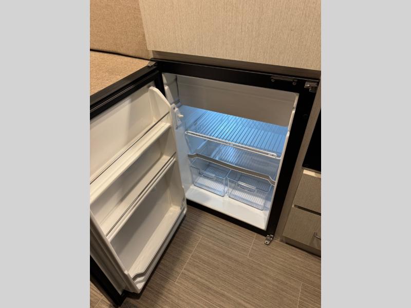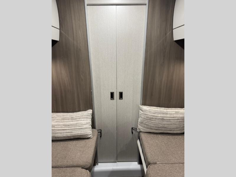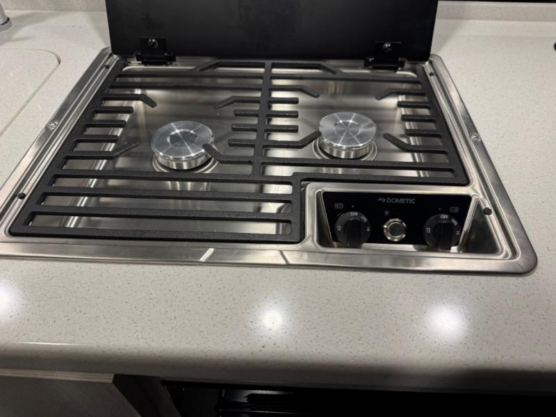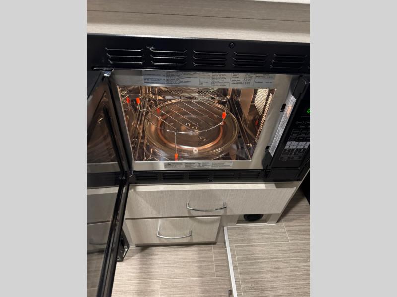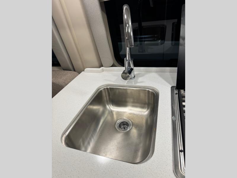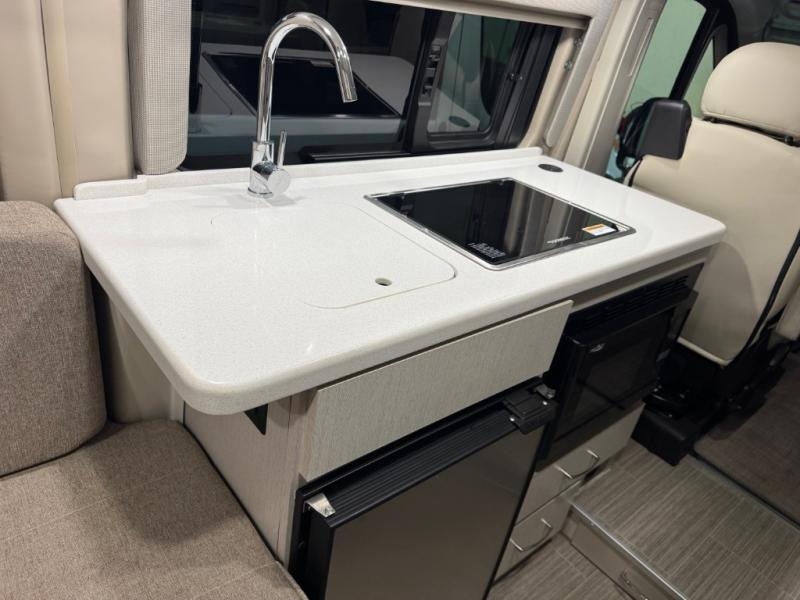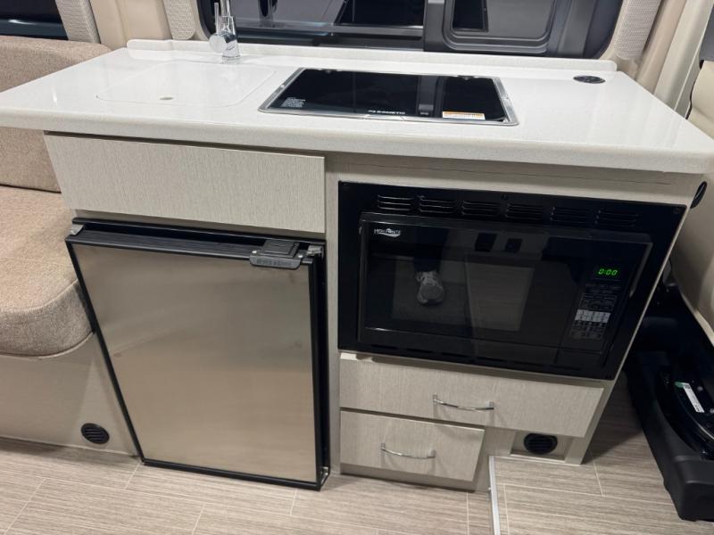 This Tellaro Class B gas motorhome has a very helpful kitchen with a pull-out cutting board, a flip-up countertop, and a convection microwave! All of these added to the standard kitchen features will make you look forward to preparing meals. There is a removable sofa table so that you can combine the two beds together to create one large 74" x 80" expanding sleeper sofa bed. There are pocket doors at the wet bath's entrance to utilize space well, and inside the bathroom you will find a wardrobe and drawers to keep your linens and toiletries safely tucked away. Once you're done adventuring for the day, you can sit back, rest, and enjoy a show on the 24" TV with outdoor viewing capability.