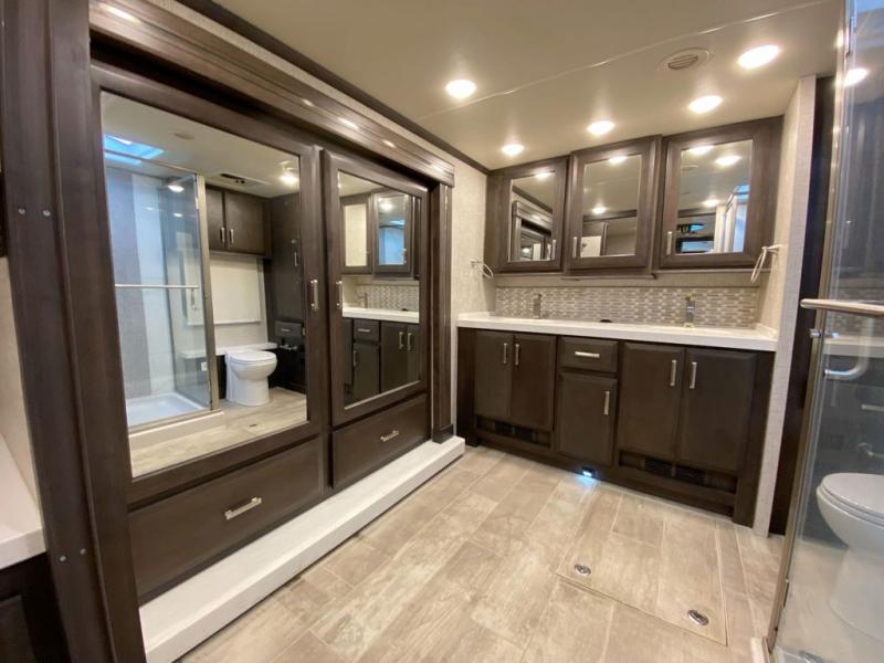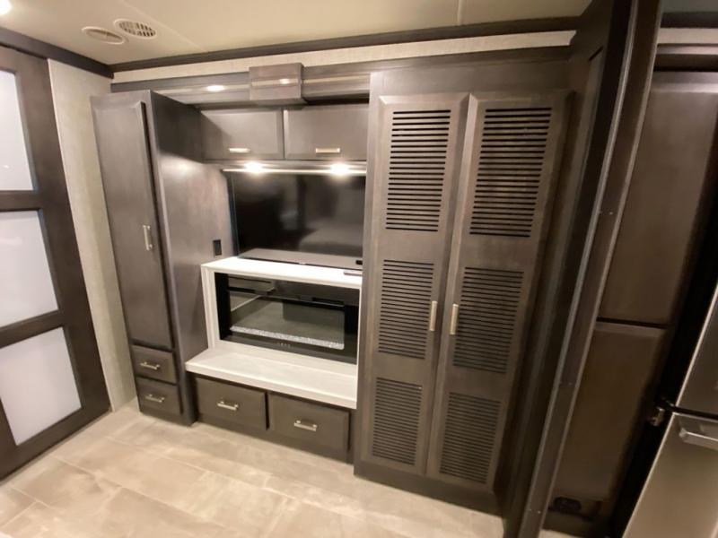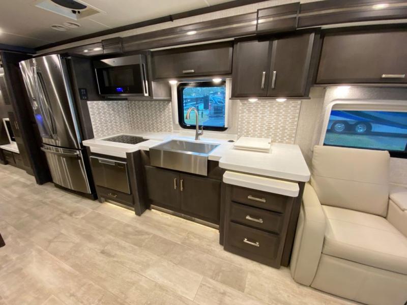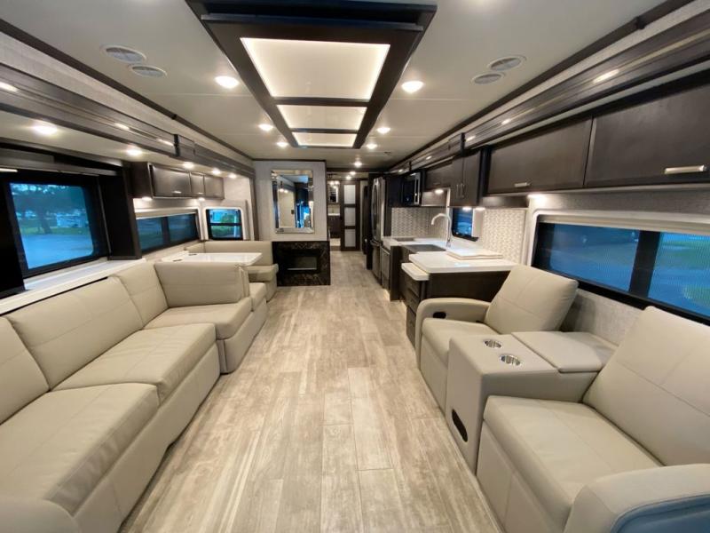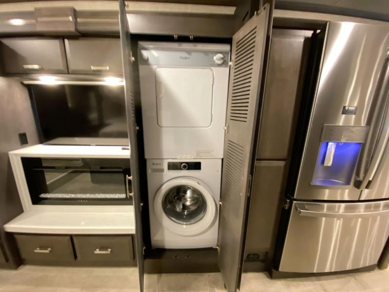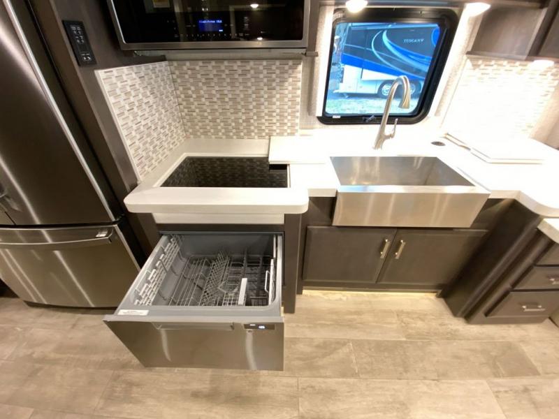 Spend some more time visiting family or seeing the nation's sites in this Tuscany Class A diesel motorhome! You will be very comfortable as you rest on the 74" reclining theater seating with footrests or on the sofa ensemble which includes a 74" Dream Dinette and a 92" sofa with bed. For sleeping, you'll have a 48" x 74" drop-down bunk above the cab and an inclining king bed back in the master suite. The master suite also includes the second fireplace, a closet, and the stackable washer/dryer bath plus the bathroom is a step away with a dual-sink vanity, a large closet for your hanging clothes and a linen closet for towels and toiletries. The kitchen offers you great convenience with its pop-up outlets, residential refrigerator, and residential dishwasher drawer-style. And there are many options to choose from to switch out the furniture to your specific wants.