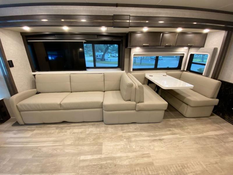 If you are ready to step up your travel game to the highest level, choose the Thor Motor Coach Tuscany Class A diesel motorhome! Nothing else compares to the amount of luxury and class you'll find on the Tuscany. The electrical and plumbing features are top notch with the GoldHeat® electronic heated flooring throughout the coach, the triple low-profile roof-ducted air conditioners, the Aqua-Hot® 400D hydronic furnace and water heating system, the energy management system, the six auxiliary house batteries, and the 200W solar charging system with power controller. Use the stackable washer/dryer to wash your clothes and extend your stays, and keep the floors clean with the central vacuum with toe-kick dustpan. You'll have an outside shower to rinse off any camping gear before putting it away, and you will get so much use out of the Winegard® ConnecT 2.0 Wi-Fi/4G/TV antenna and the Winegard™ TRAV''LER HD satellite dish.