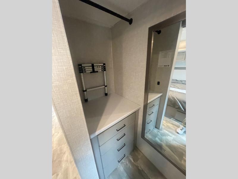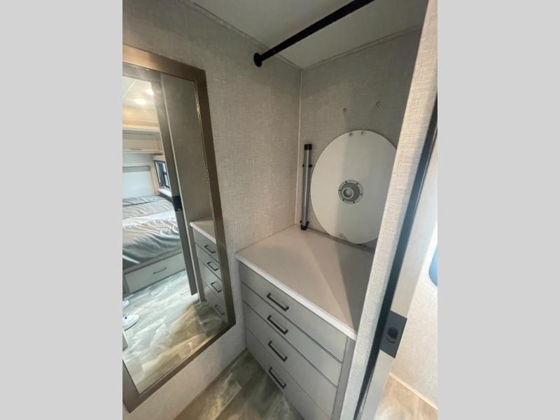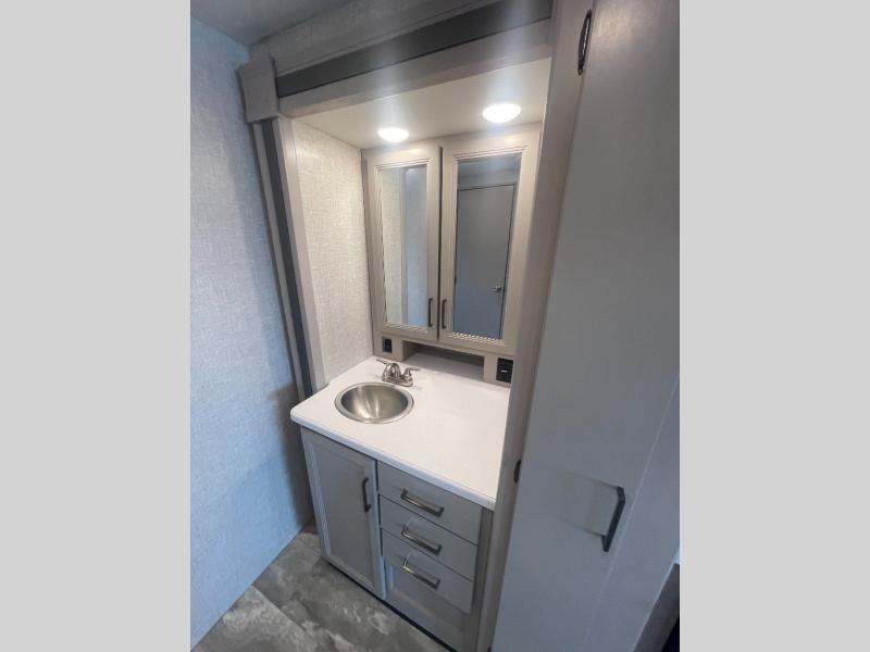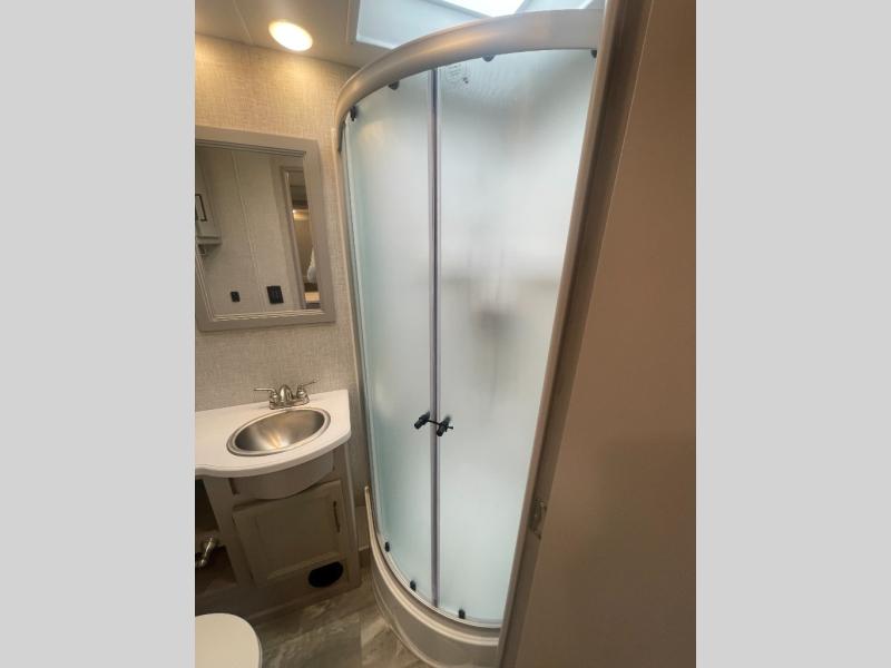 Have a luxurious week of vacation in this Windsport Class A gas motorhome! The bedroom is full of residential comfort with its king bed, 32" LED TV, and walk-in closet. The closet has also been prepped for a stackable washer/dryer. Another good place to sleep at night is the 54" x 74" drop-down overhead bunk, and additionally you have a 70" Dream Dinette and 68" sofa bed that can turn into beds when you aren't using them for other purposes. As soon as you enter this coach you will notice a broom closet to your left, and next to that closet is the residential refrigerator. The bathroom is fully equipped with a 32" x 32" radius shower, skylight, toilet, and vanity, and you will find a second vanity outside the bathroom which serves as a "getting ready" area.