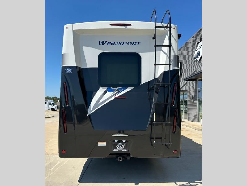 Traveling with those you love will be a breeze in this Windsport dual slide motorhome for weekend getaways or full-time RV living. The slides offer more interior moving around space and there is ample storage both inside and out with 140 cu. ft. of exterior storage in the basement. You will love the expanding sofa bed for daily seating and nighttime sleeping, as well as the 70" Dream Dinette which can also accommodate a couple of tired guests. Both are found within the living/kitchen combined slide. Or, you can choose the theater seat option in place of the sofa bed if you like. The kitchen amenities will have no complaints from the chef in the bunch as you will have everything you need to prepare meals and snacks just like home. When you are ready for a quiet night's rest, head to the king bed in the rear of the coach which also slides out to offer more walking about space. The bedroom features a large closet, dresser, and has been prepped for an optional washer and dryer if you choose to add this convenience. And, the nearby bath features a 30" x 36" shower, toilet, and vanity with sink, plus linen storage. If you need added sleeping beyond the bedroom and furniture conversions you can use the drop-down overhead bunk above the cab which features a 54" x 74" sleeping space.
