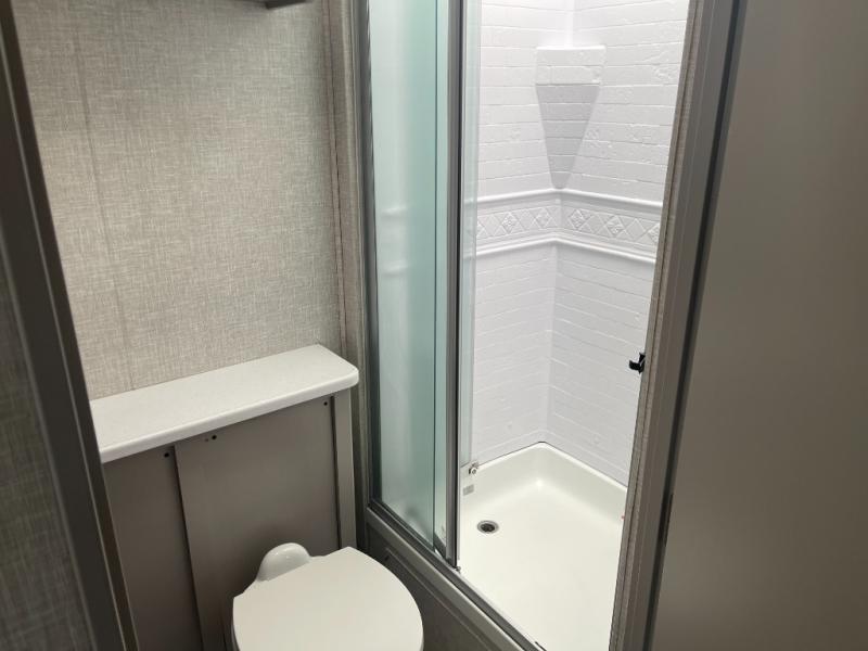 This Windsport Class A gas motorhome gives you a great relaxation area with a 70" Dream Dinette, 68" sofa bed, LED TV, and USB charging ports. This coach also offers you lots of sleeping space with the king bed back in the private bedroom, the 27" x 74" bunk beds on the full-wall slide, and the drop-down overhead bunk above the cab. You can also create more sleeping space when you turn the dinette and sofa into beds. The full bathroom offers you a 30" x 36" shower with skylight and glass door, and you will love how convenient the kitchen will be with its residential refrigerator, pantry, three-burner gas cooktop, microwave, and double-bowl sink.