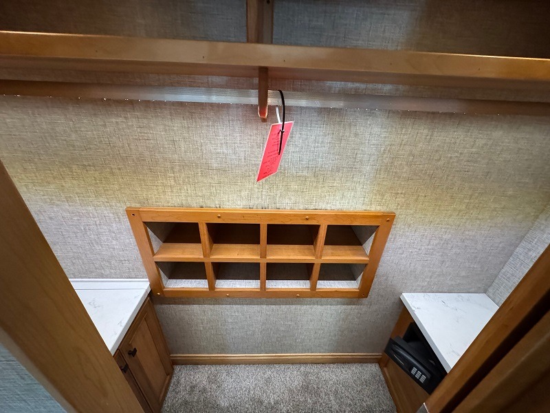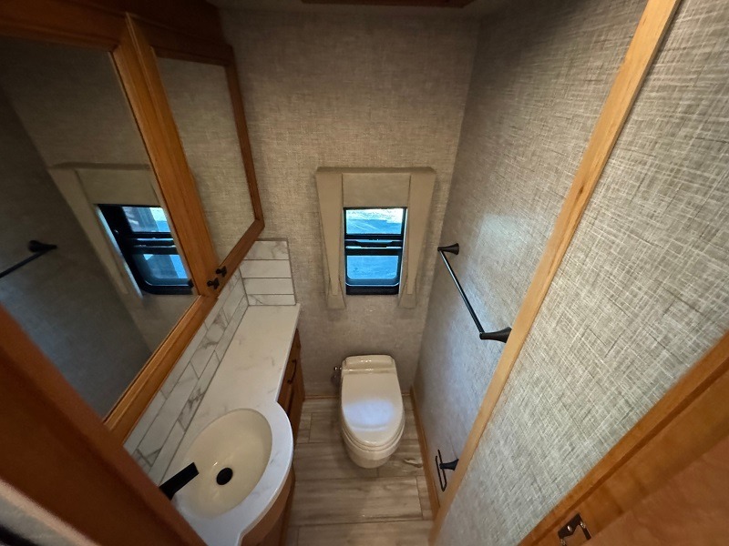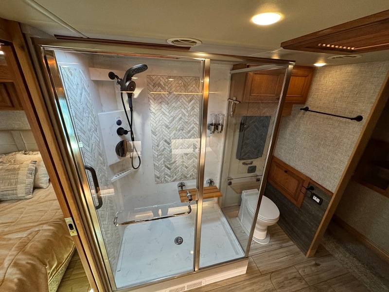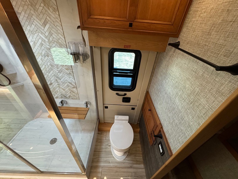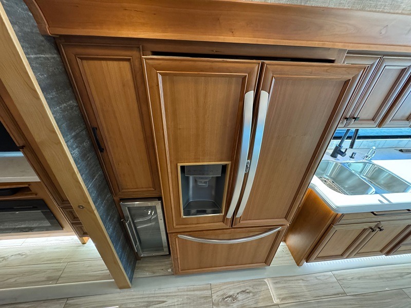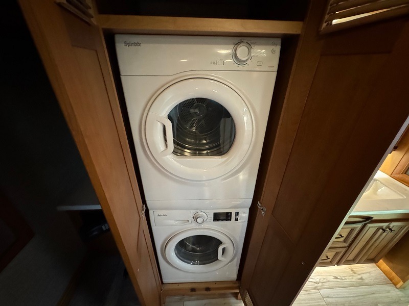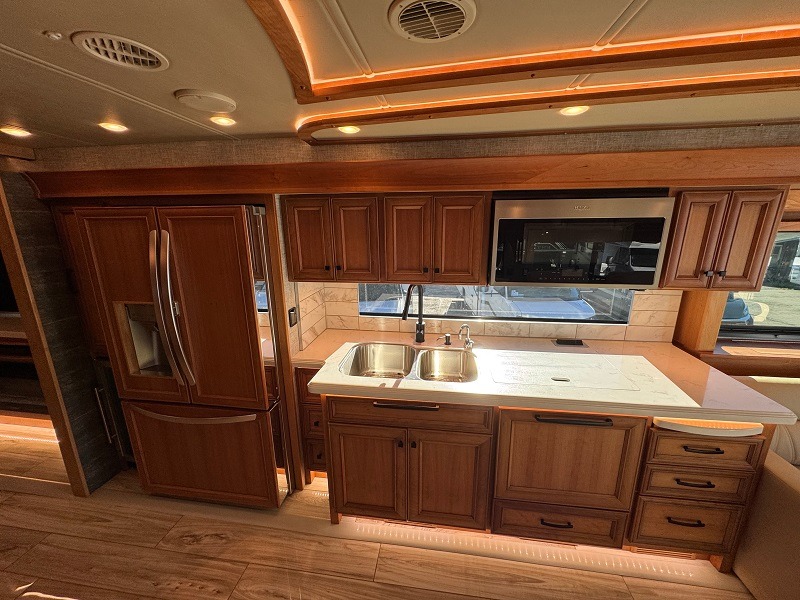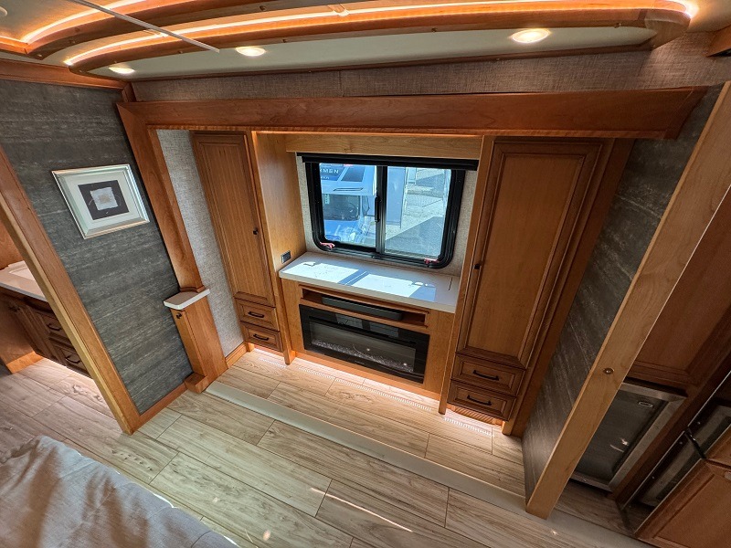 Enjoy luxury at every turn in this spacious motorhome. Once you stop for a break, enjoy lunch at the dinette that will double as a desk since it includes a computer workstation. The full-wall slide will open up the whole coach to make you feel more at home, and you'll have plenty of space to prepare meals in the kitchen. There is also a pantry to store paper goods and snacks, and the half bath is right off of the kitchen for convenience. You and your spouse will love the master bedroom that includes an optional bedroom fireplace, drawers and shelves for your belongings, plus a king bed with dual nightstands. The full rear bath is both spacious and beaming with features. There are dual bath sinks with a tri-view mirror above, a floor-to-ceiling closet with a safe, and a space to add an optional washer and dryer. There is even an egress rear exit for emergencies!