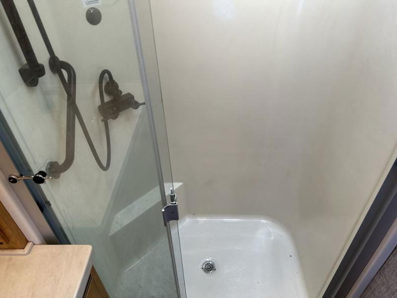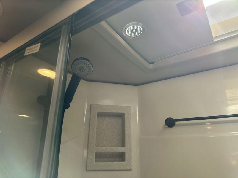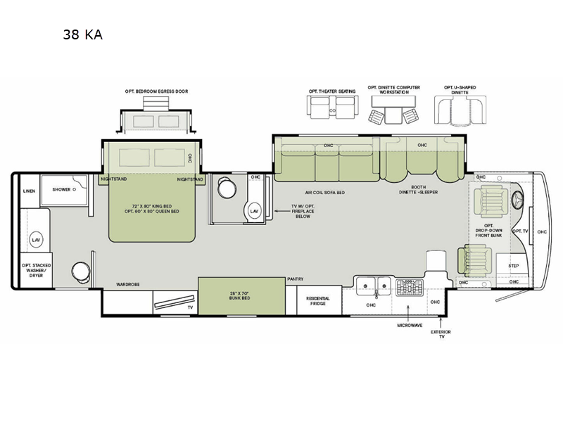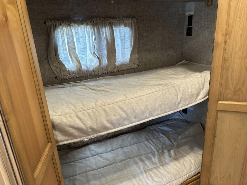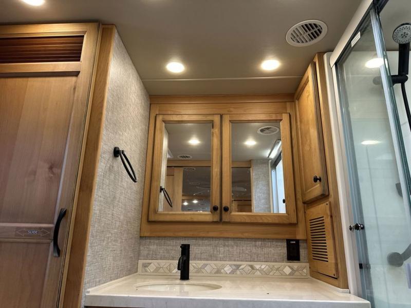 Don't be surprised if you never want to leave this Allegro RED 360 Class A diesel motorhome! You have an excellent amount of sleeping space with the king bed slide, Ultraleather air coil sofa, booth dinette, and bunk beds, but if you would like to have even more sleeping space, you can also add the optional drop-down bunk above the cab. The other thing you have quite a lot of is entertainment. There are three flat-panel TVs, a centralized entertainment center with Blu-Ray player, and a sound bar sound system with the living area TV. The kitchen has all of the tools needed to prepare delicious meals while you're out and about, and you will be able to store all of those meal ingredients in the pantry and residential refrigerator. Another feature that makes this coach comfortable is the full and half bathroom. The half bath is located out in the main living area for all, and the full bathroom rests inside the master suite in the back.