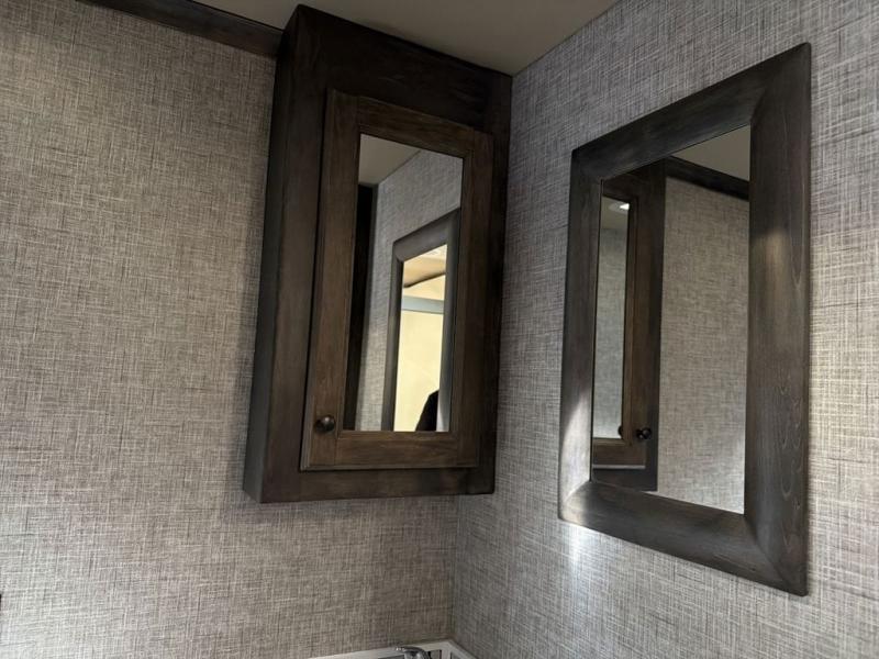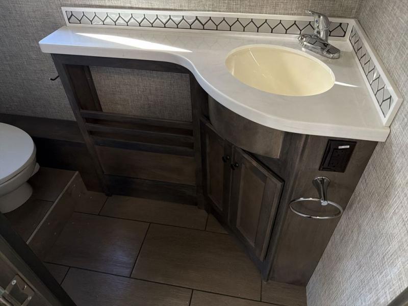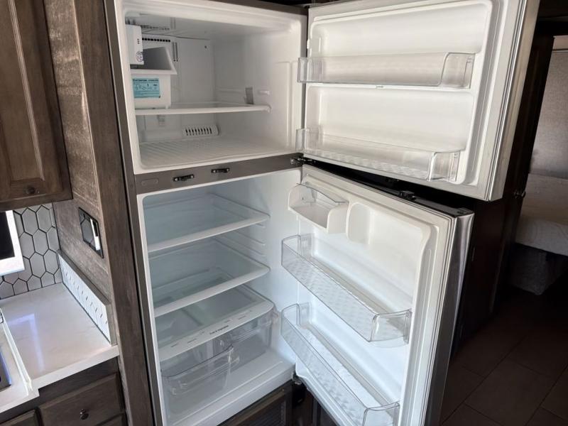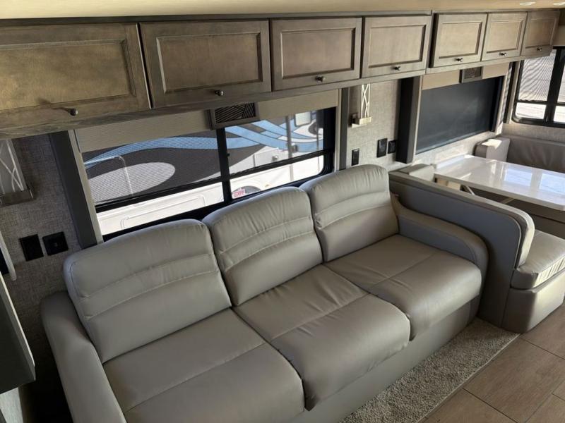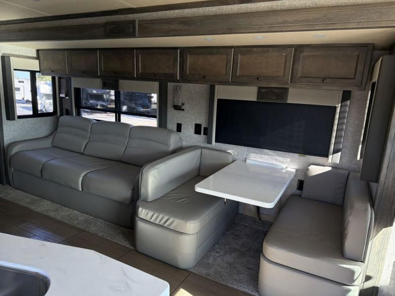 You will feel right at home in this motorhome! It features a rear private bedroom with a king bed slide that has an egress window behind it, a single cabinet with a flat panel TV, bank of drawers below it, and a wardrobe with drawers below, plus an area prepped to add an optional washer and dryer. Just outside the bedroom is the separated bathroom where one person can freshen up in the shower while another uses the private toilet and lav sink. After you have prepared a delicious meal with the three burner cooktop, you can enjoy it at the booth dinette and play a card game or relax on the ultraleather flip and fold sofa bed. The sofa bed can be switched out for an optional ultraleather air coil sofa bed, and the booth dinette can be switched out for an optional dinette with computer work station. You can also choose to add an optional drop-down front bunk for more guests to tag along!
