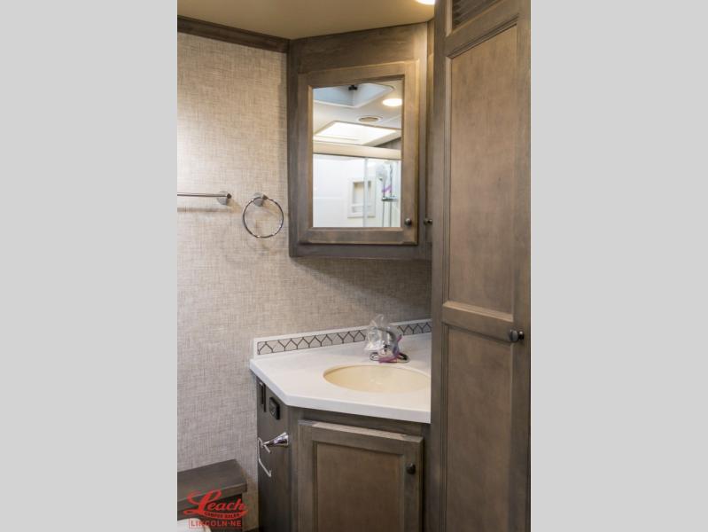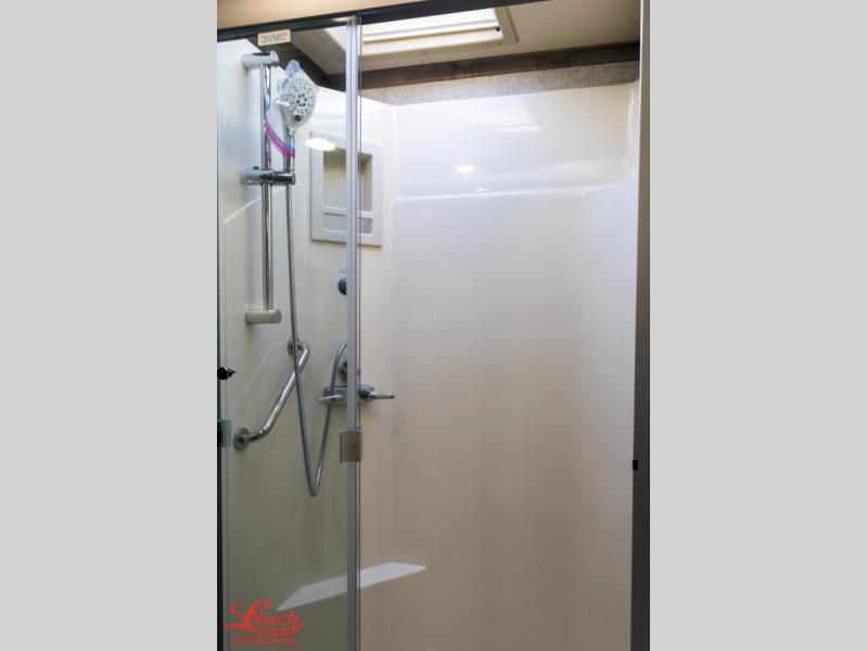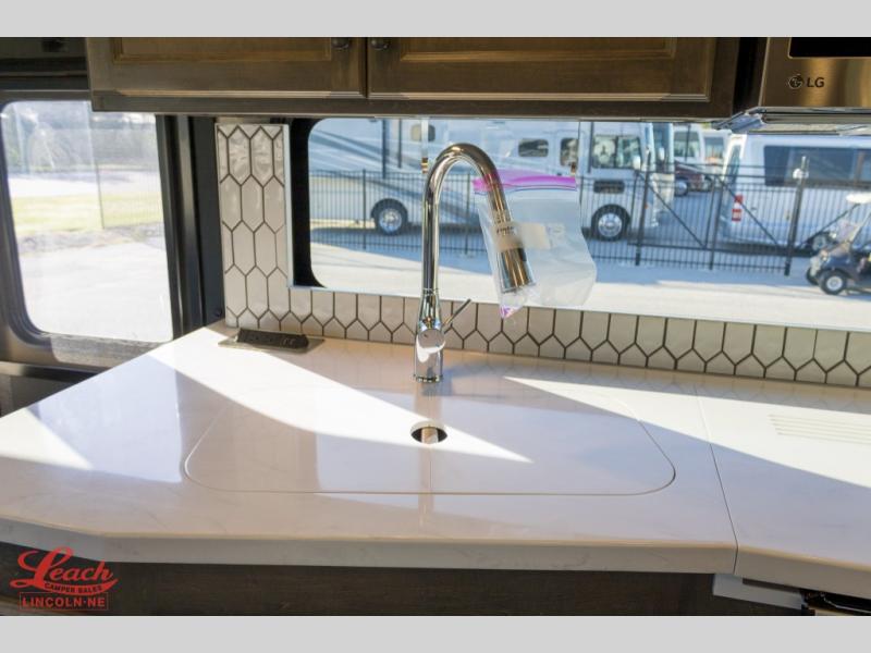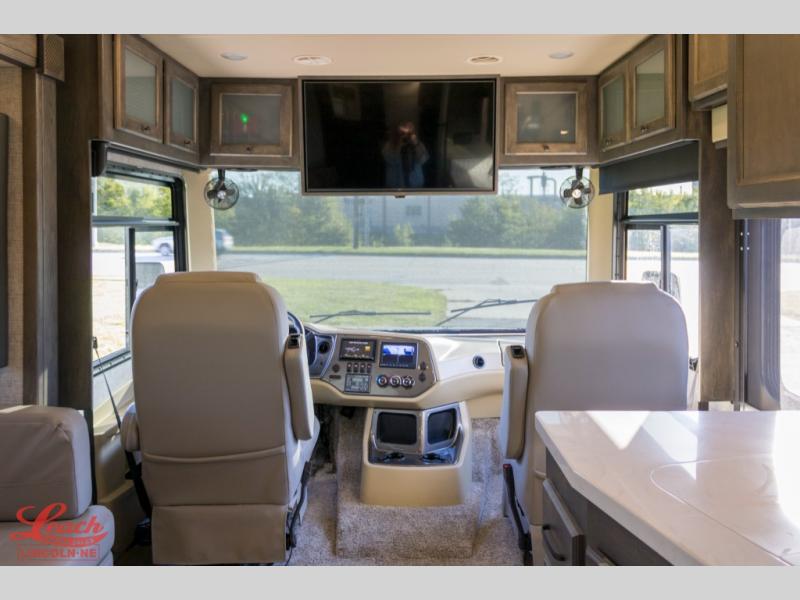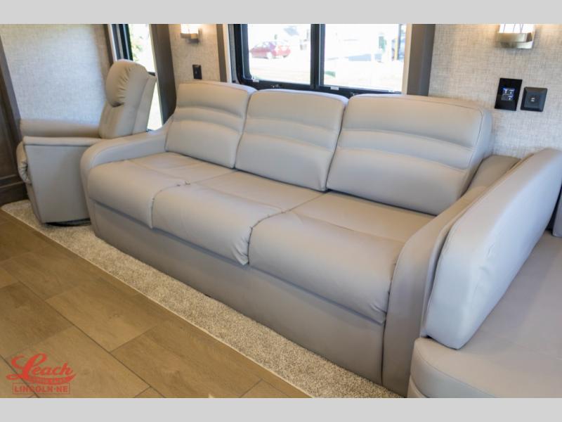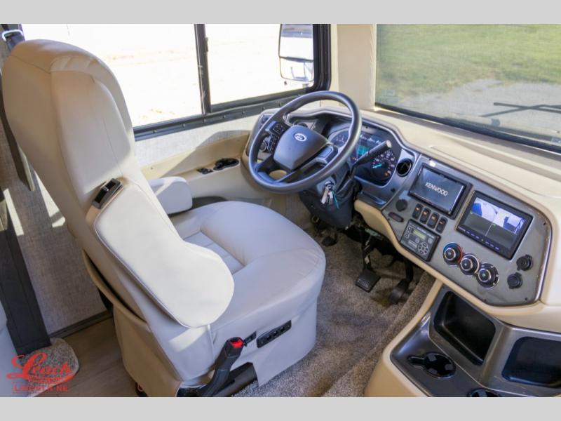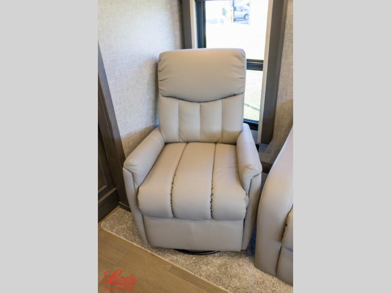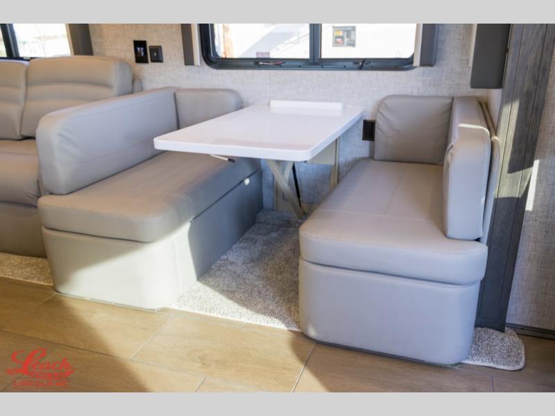 It's a clean decision with a bath and a half to choose this motorhome for your travels! The full rear bathroom has a shower, an overhead cabinet with linen storage, and an area prepped to add an optional washer and dryer so you can extend your trips with clean clothes. After a long day of traveling, you can relax on the recliner or the ultraleather flip and fold sofa bed across from the flat panel TV with an optional fireplace below it. The booth dinette offers a comfortable place to enjoy meals, play games, and even transform into an extra sleeping space or if you need to get some work done while on the road then you can switch it out for the optional dinette with computer work station. The exterior TV lets you breathe in some fresh air without missing the big game!