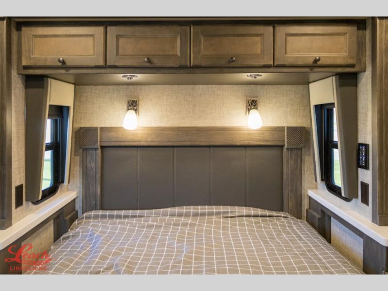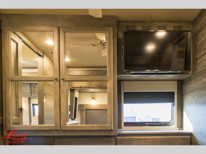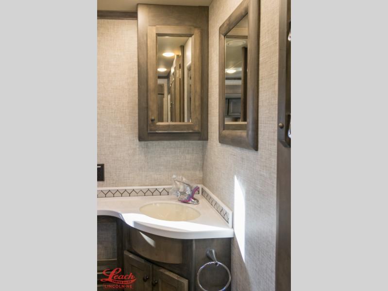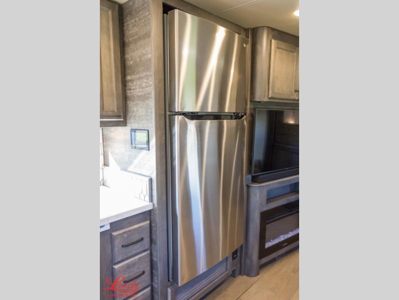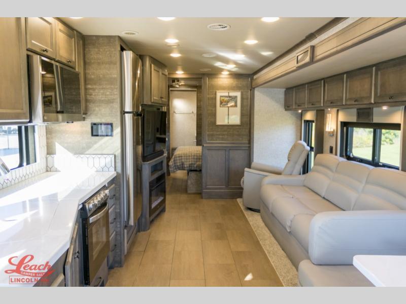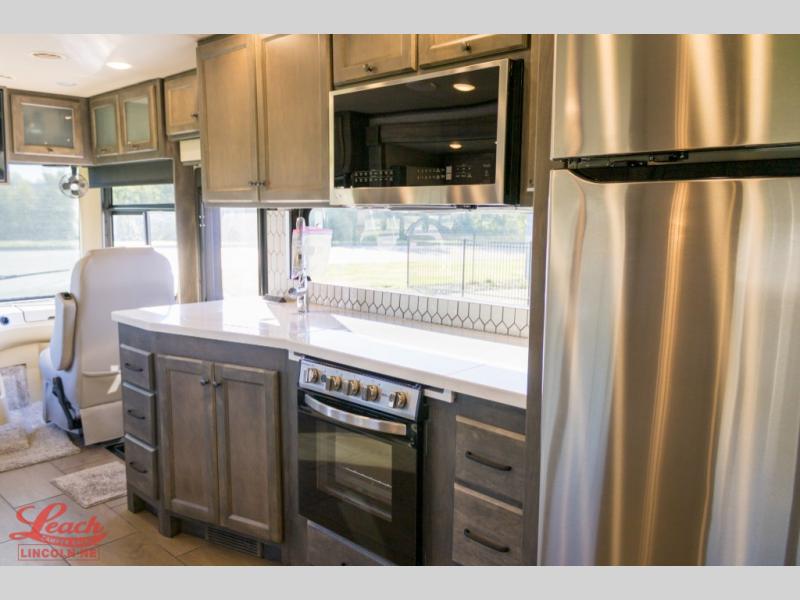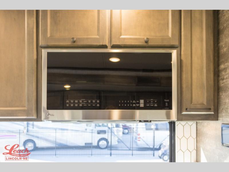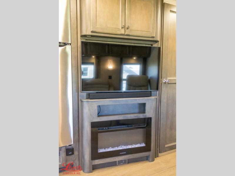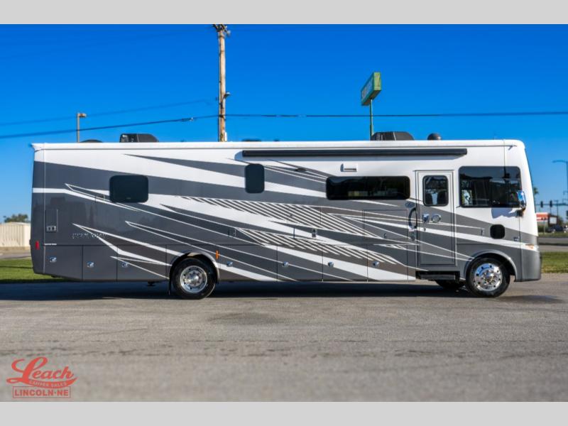 It's a clean decision with a bath and a half to choose this motorhome for your travels! The full rear bathroom has a shower, an overhead cabinet with linen storage, and an area prepped to add an optional washer and dryer so you can extend your trips with clean clothes. After a long day of traveling, you can relax on the recliner or the ultraleather flip and fold sofa bed across from the flat panel TV with an optional fireplace below it. The booth dinette offers a comfortable place to enjoy meals, play games, and even transform into an extra sleeping space or if you need to get some work done while on the road then you can switch it out for the optional dinette with computer work station. The exterior TV lets you breathe in some fresh air without missing the big game!
