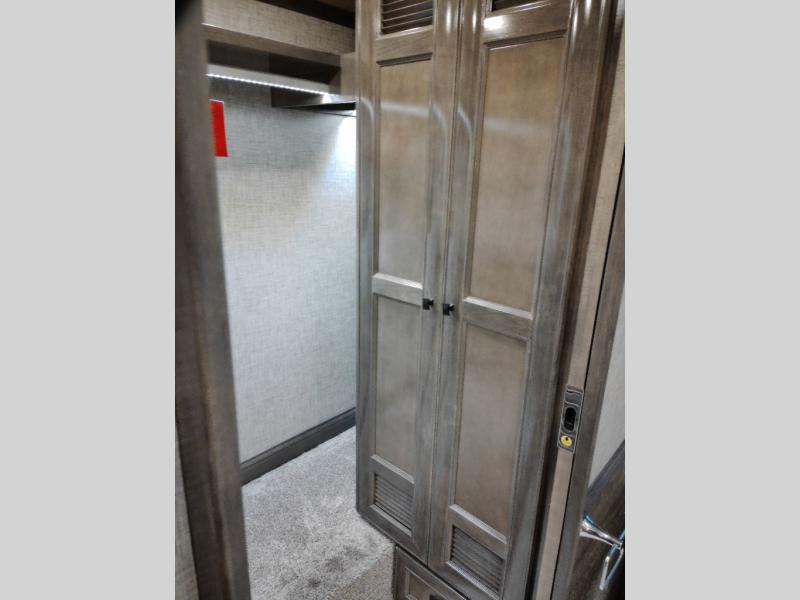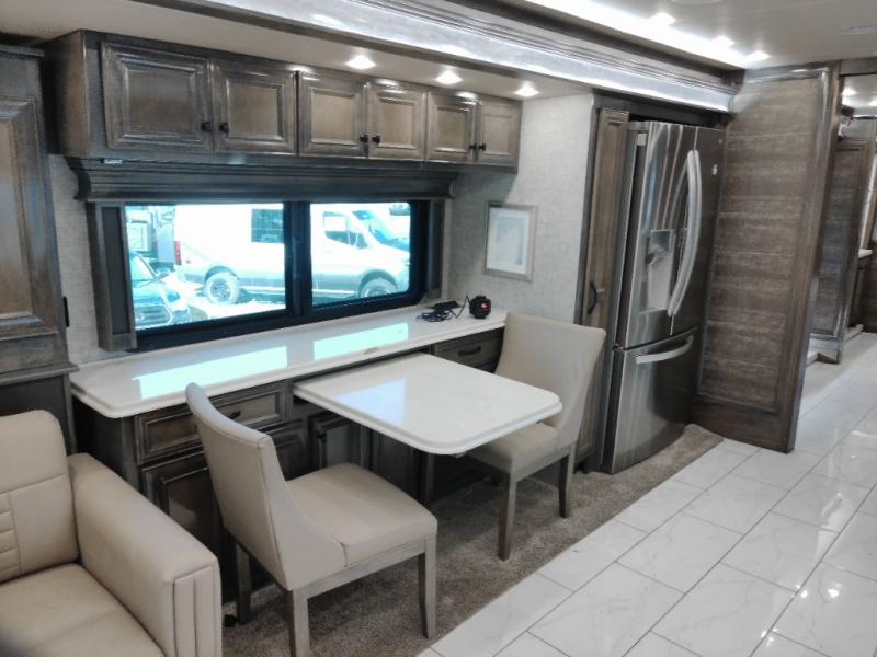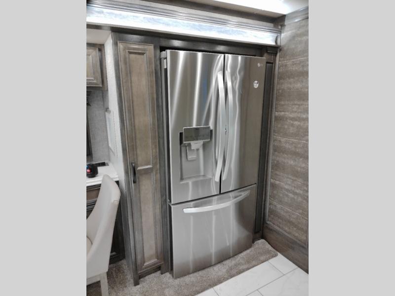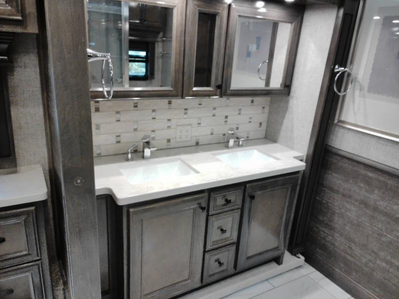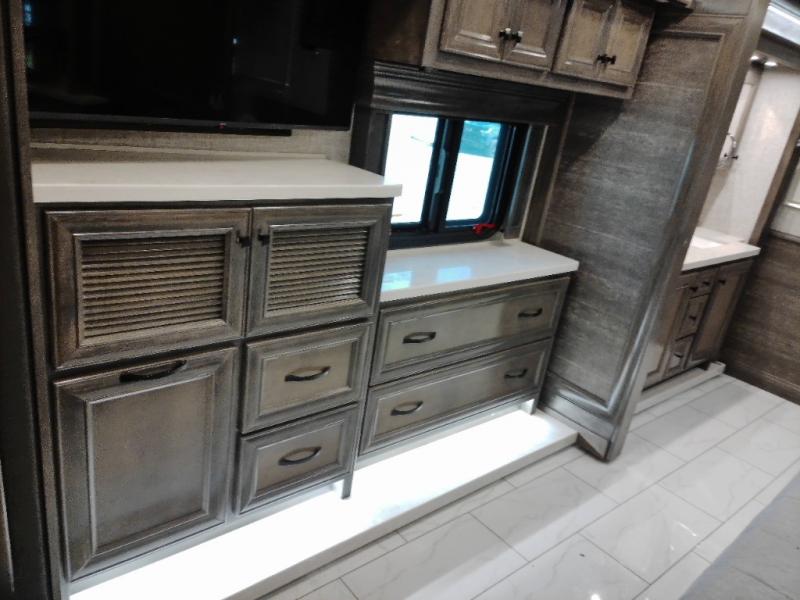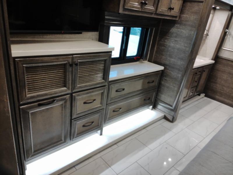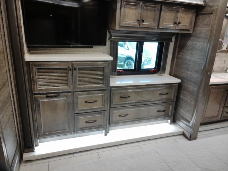 You won't want to travel any other way once you step inside this Phaeton motorhome! The full rear bathroom is decked out in convenient features like the large closet that has a cabinet with drawers below, a safe, and an area prepped to add an optional washer and dryer, plus a shower with a seat and a dual sink vanity with a tri-view mirror. The kitchen has a stainless steel refrigerator to keep your perishables fresh, a countertop extension with cabinet below for more prepping and storage space, and the ability to add an optional drawer-type dishwasher for easy clean up. You can enjoy your meals at the booth dinette then relax on either the ultraleather air coil sofa bed or ultraleather DE sofa bed with a lift TV above it. A few options you might want to add are the optional outdoor grill, the drop-down front bunk, or dinette with computer workstation to get some work done while you are away!