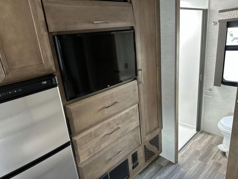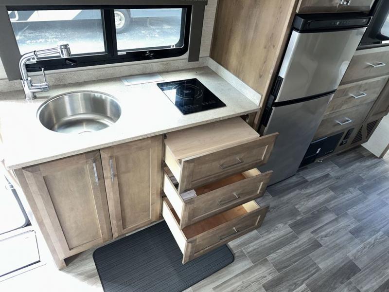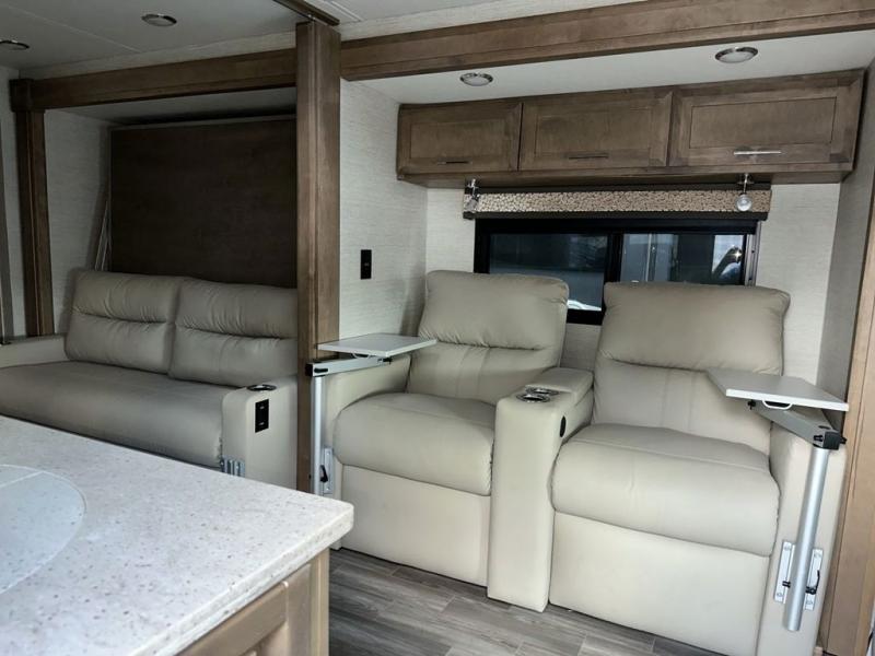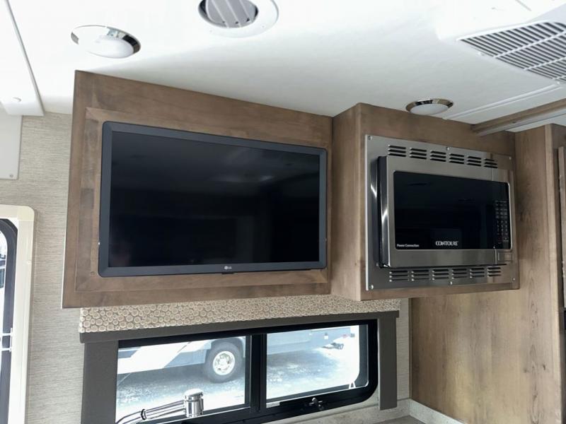 Travel with your favorite person, your family, or a some friends to see nature along the highways, up close and where ever the road takes you! You will find sleeping space for five with the bunk over the cab, the booth dinette, and the versatile queen Murphy bed and sofa combo! You can watch the 32" TV while the cook makes dinner using the convection microwave or cooktop, and the 12V 6.5 cu. ft. refrigerator can hold the cold items. The rear full bathroom gives you privacy and the sliding door saves space. You might like to add a few options to customize your coach such as optional reclining theater seating, or a tri-fold sofa in place of the dinette, a central vacuum system, an overhead entertainment center in place of the bunk, and/or an exterior TV to enjoy under the awning.