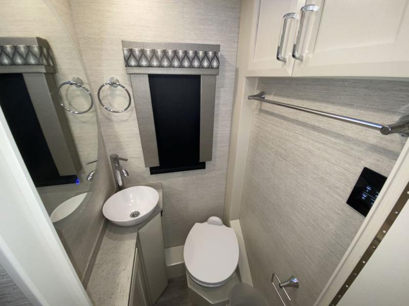 Whether you travel with plans or like to find your way as you move down the road, this coach will give you a comfortable driver and passenger seat, a tray for smartphones with charging ports, and intelligent navigation. The driver will love the heated/electric adjustable mirrors when parking in the cold, plus the side-view cameras option might be a good choice for you. The rear bedroom gives you two twin beds with easy access to the private toilet and sink room across from the shower, or convert the beds into a king bed if you like. The main living and kitchen area is spacious thanks to the slide out, and the cook will love the kitchen amenities including the countertop extension, the convection microwave and more. There are a few more options to choose from if you would like to enhance this coach such as adding an optional exterior TV, a central vacuum system, and/or reclining theater seating in place of the tri-fold sofa.