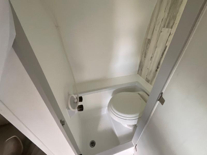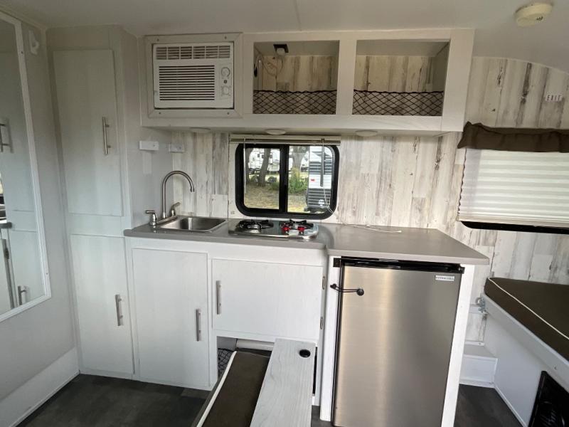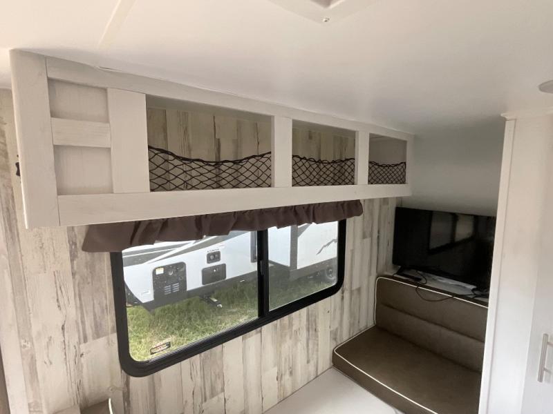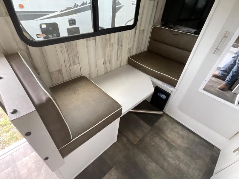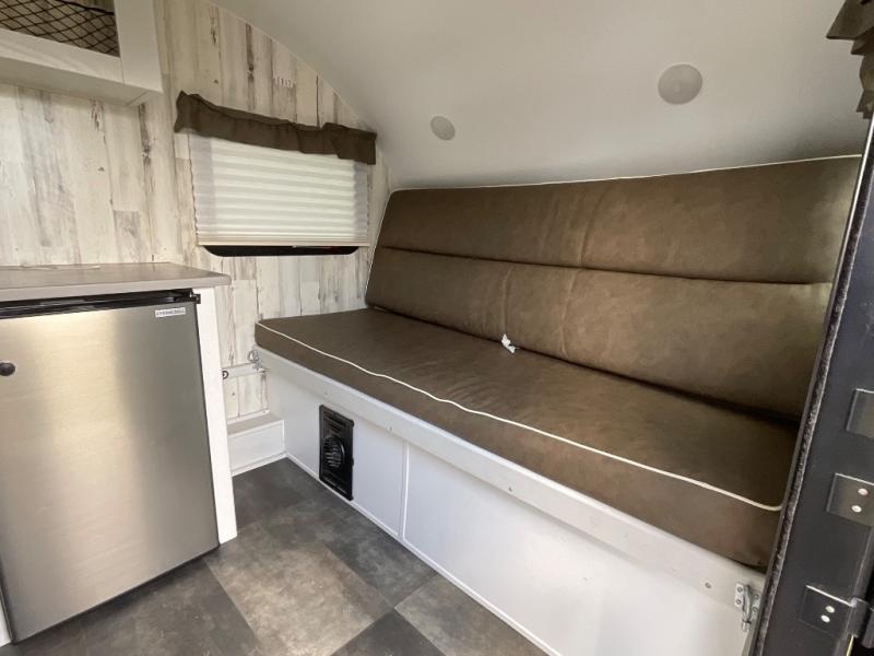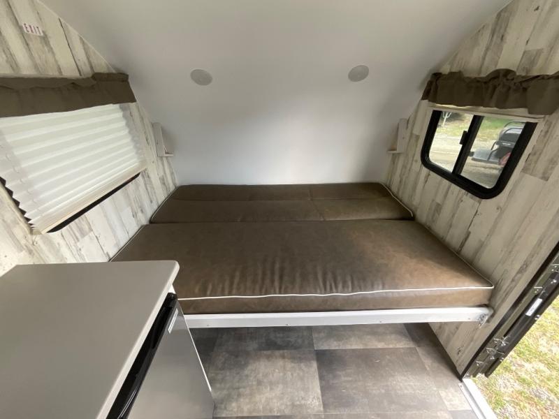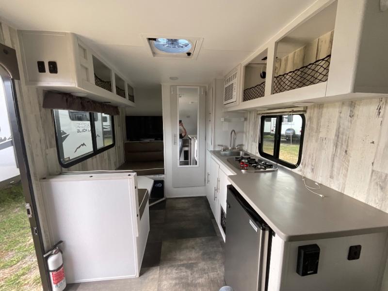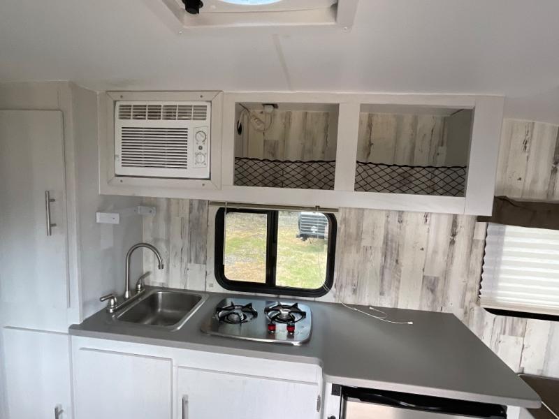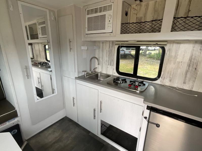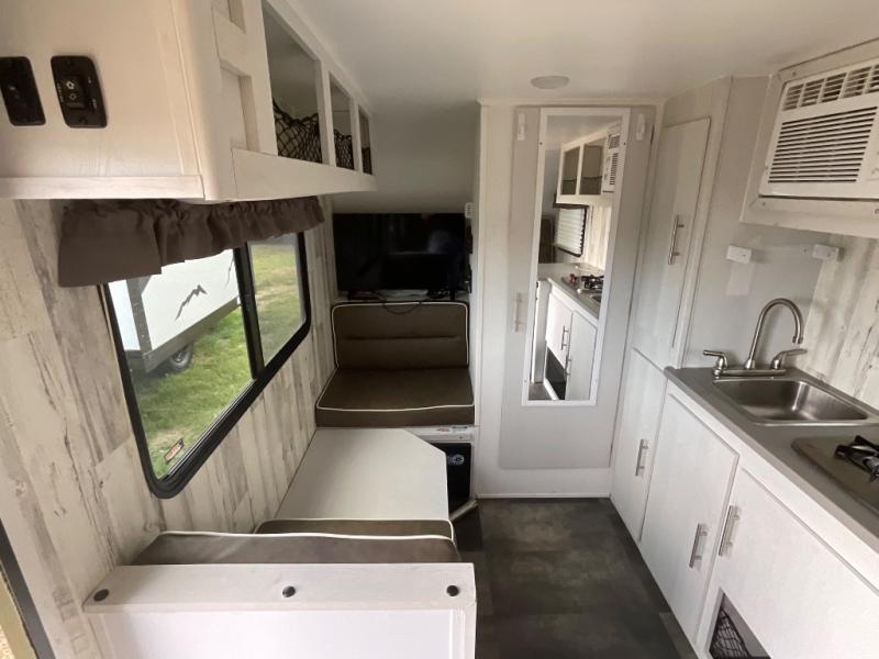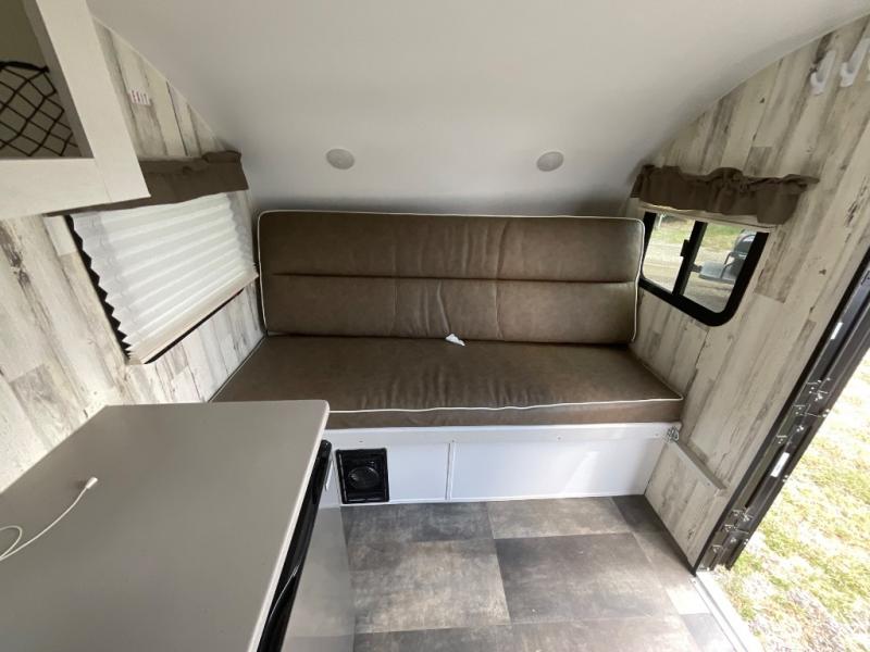 Head to your favorite campgrounds with your favorite person in this travel trailer! Relax each evening in true comfort on the front sofa while enjoying a snack that was stored in the kitchen pantry, and the sofa transforms into a full bed for sleeping at night too. The two person dinette offers a comfortable place to play games and enjoy your meals at that were prepared using the two-burner stovetop, 3.3 cu. ft. 12V refrigerator, and single bowl stainless steel sink. There are shelves and overhead cabinets throughout to store your items, and a rear corner wet bath to freshen up in each morning with a fantastic vent to eliminate any unwanted steam!