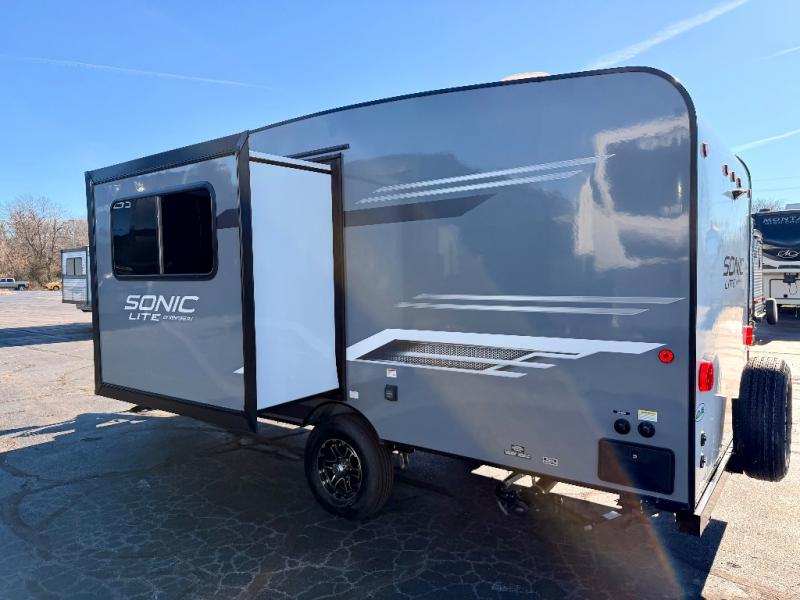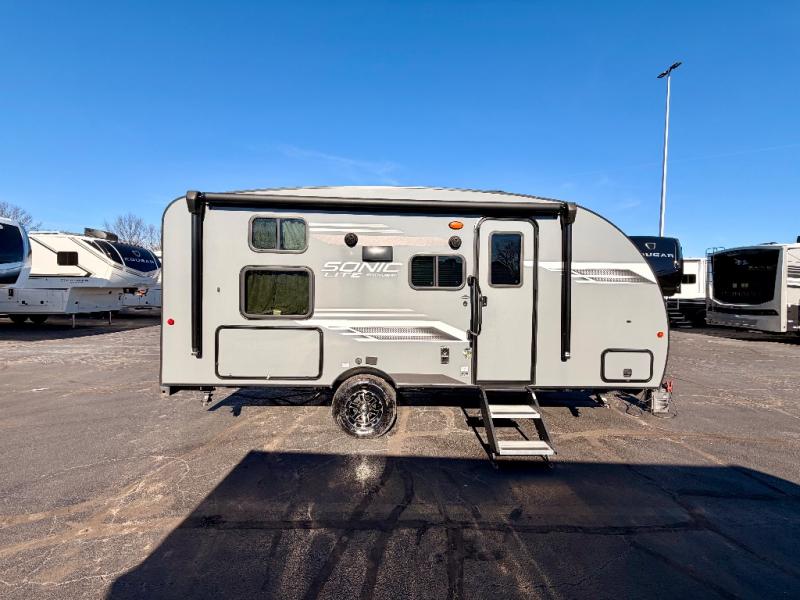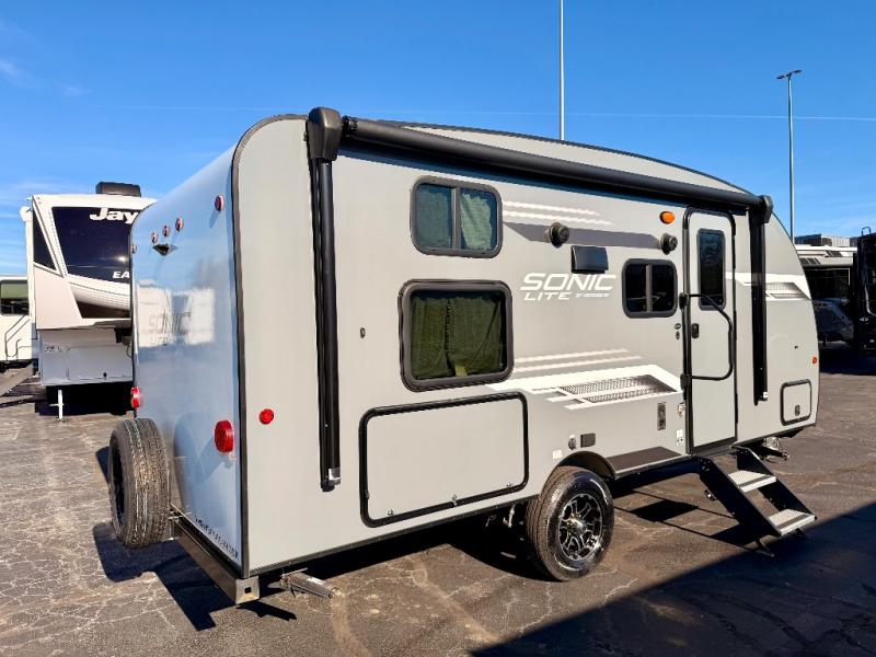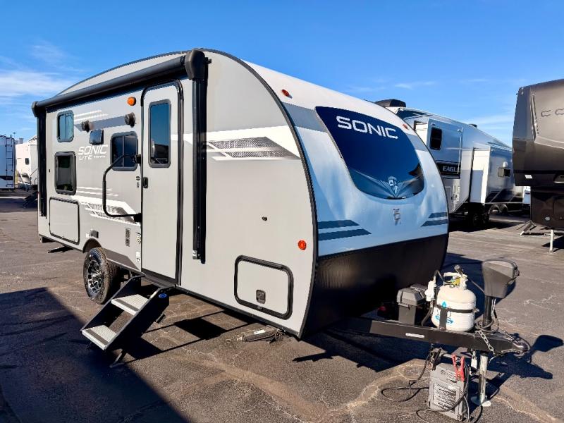 With any Sonic Lite travel trailer by Venture RV, you begin with Next Generation in RV frame technology with the NXG frame, AZDEL Onboard composite panels, tongue and groove plywood floor decking, and a tucked rear bumper. The Blast Package 1.3 provides a motion light in the bathroom, a deep round stainless steel sink with cover in the kitchen, and the Venture LevelMate Pro which allows you to use smartphone technology to level the RV, plus a lighted power tongue jack, and WIFI prep to mention a few features. Get ready for comfort and style in a Sonic Lite ultra-lightweight, single-axle travel trailer of your choice!