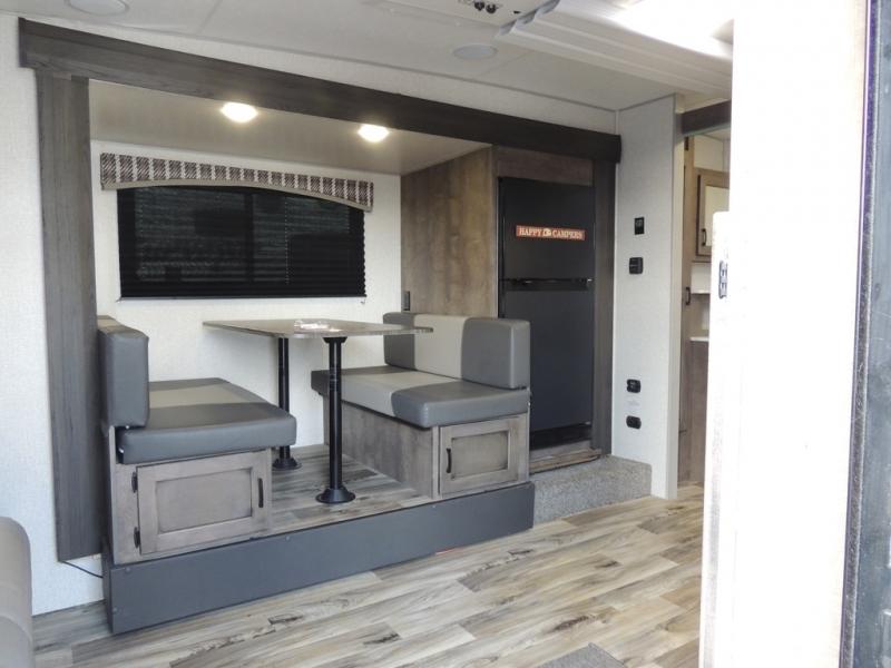 Looking for privacy when you camp? Do you enjoy dining at a booth dinette when you are staying in an RV? This Sonic provides all of that plus more! Starting with the private bedroom with an RV queen bed, StorMore bedside nightstands with a 110V outlet and USB charging to keep the electronics ready, dual wardrobes, and access to the walk-through bathroom through a space savings sliding door. The second entry to the walk-through bath is in the main living and kitchen area where you will find a 65" x 48" booth dinette and an 8 cu. ft. refrigerator slide out for more interior floor space, an L-shaped countertop with a large sink and kitchen amenities, plus an entertainment center and a 64" jiffy sofa. And the furniture doubles as extra sleeping space when needed. Don't forget about the 17' power awning offering an outdoor living area, just add your camp chairs.