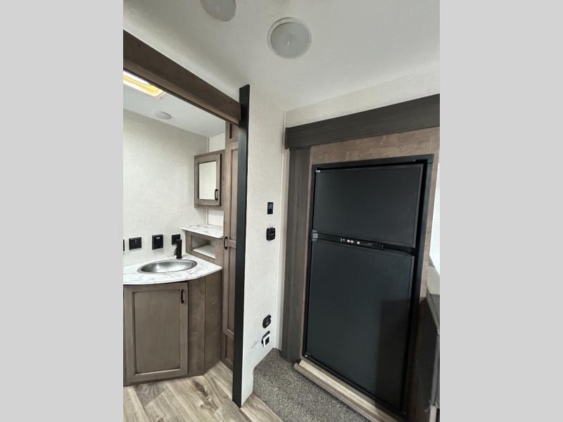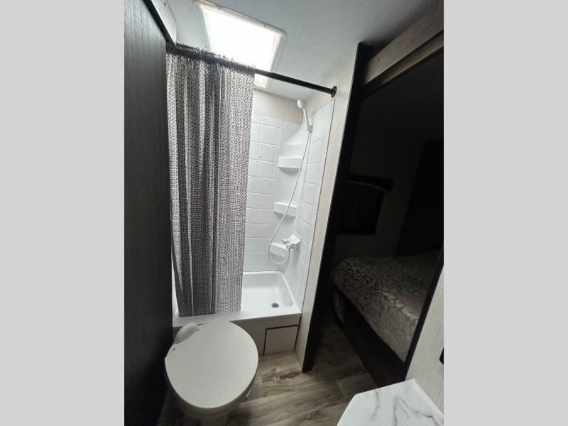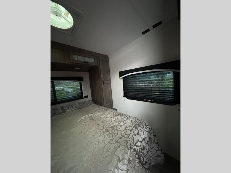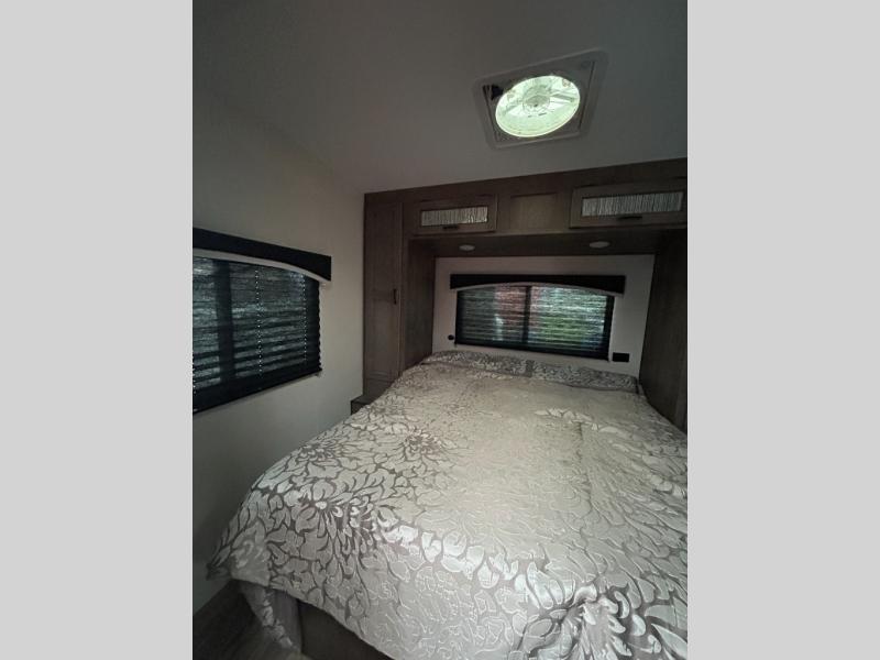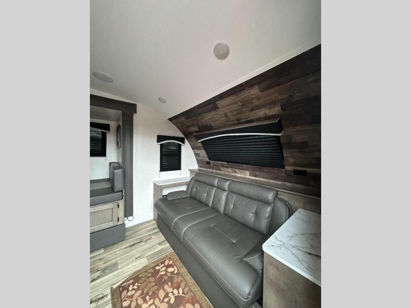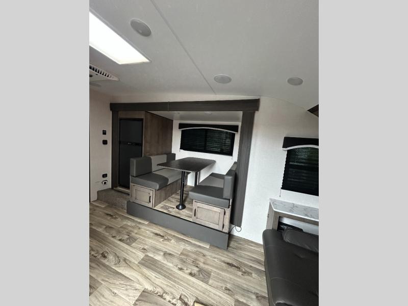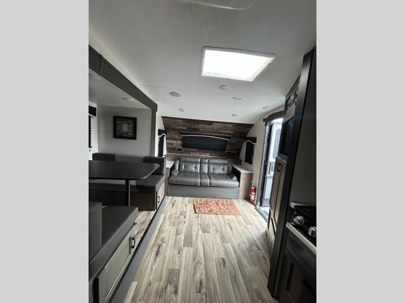You will enjoy relaxing outside and inside with a 17' power awning that provides an outdoor living area protected from the elements, just add your camping chairs that are stowed away in the rear pass-through storage with motion-activated light, and the interior provides a 64" jiffy sofa up front and a booth dinette. Both of these furnishings offer sleeping space for family and friends when you are ready to call it a night. The L-shaped counter in the kitchen area provides a large sink and a three-burner range, and the 8 cu. ft. refrigerator is within the slide out. Easily access the walk-through bath from this area as well as the rear private bedroom which offers an RV queen bed, dual wardrobes, windows and StorMore bedside nightstands with a 110V outlet and USB charging.