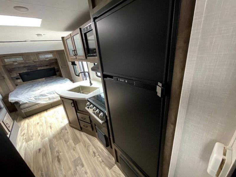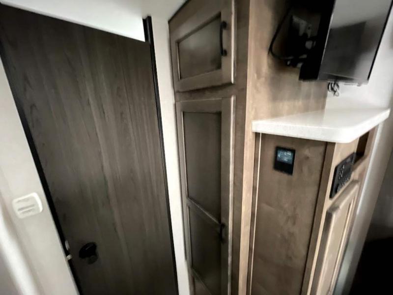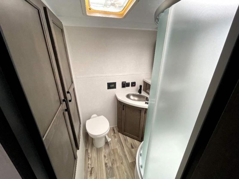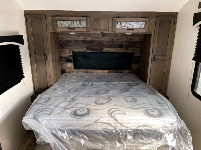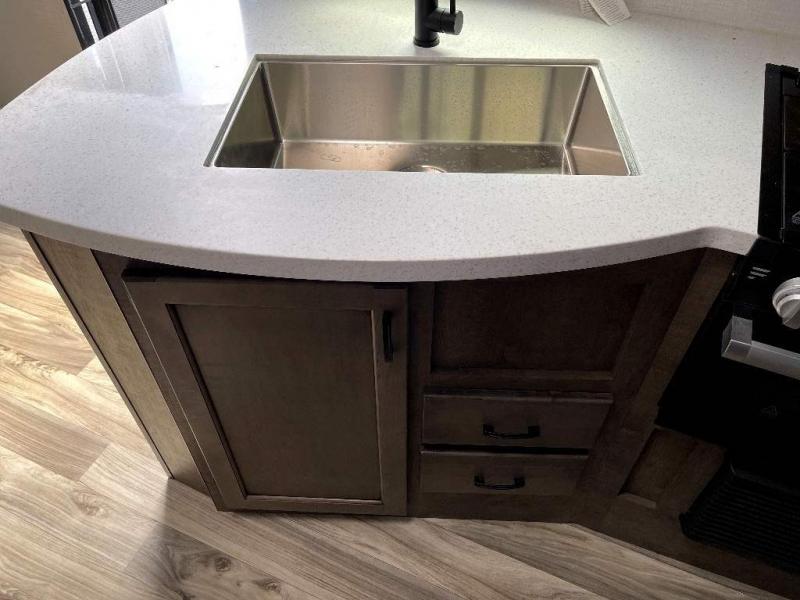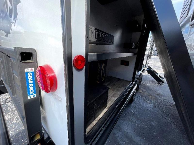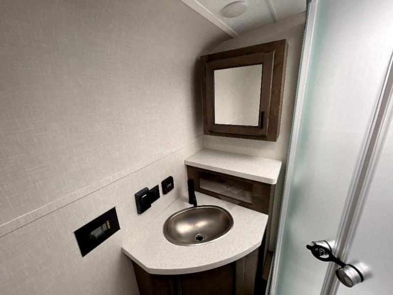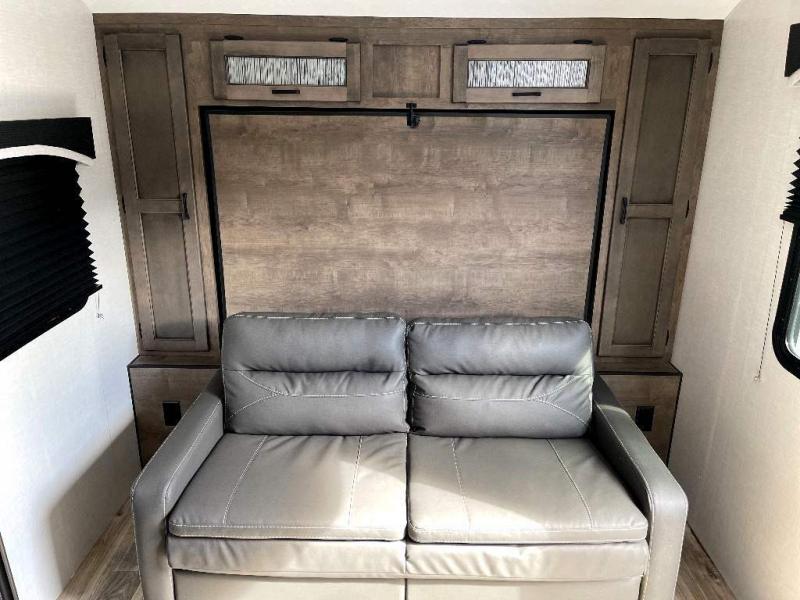 A cook will love this trailer with the choice to make meals inside with full amenities including an 8 cu. ft. refrigerator and a pantry, or outside while using the campfire cafe which offers a griddle and refrigerator, plus counter space to prepare and serve meals. There is sleeping space for four when you utilize the U-shaped dinette slide out that also provides more interior floor space along with the versatile Murphy bed and sofa up front. You will also find a privacy curtain that will section off this area that also features StorMore bedside nightstands with a 110V outlet and USB charging, and two wardrobes.