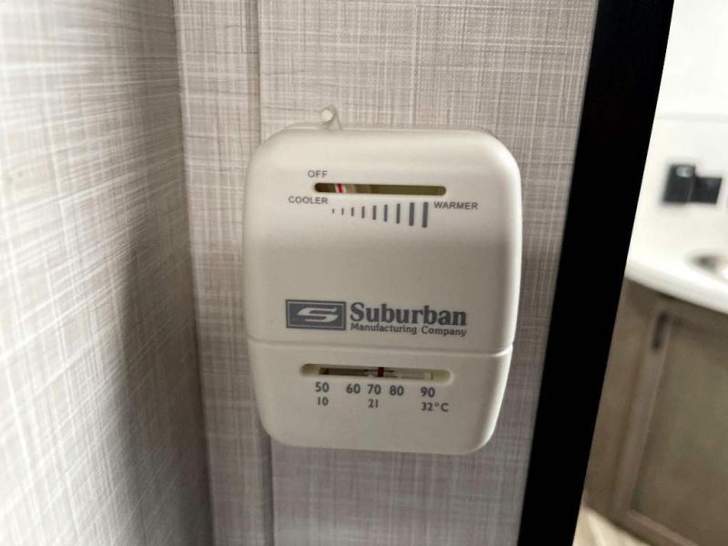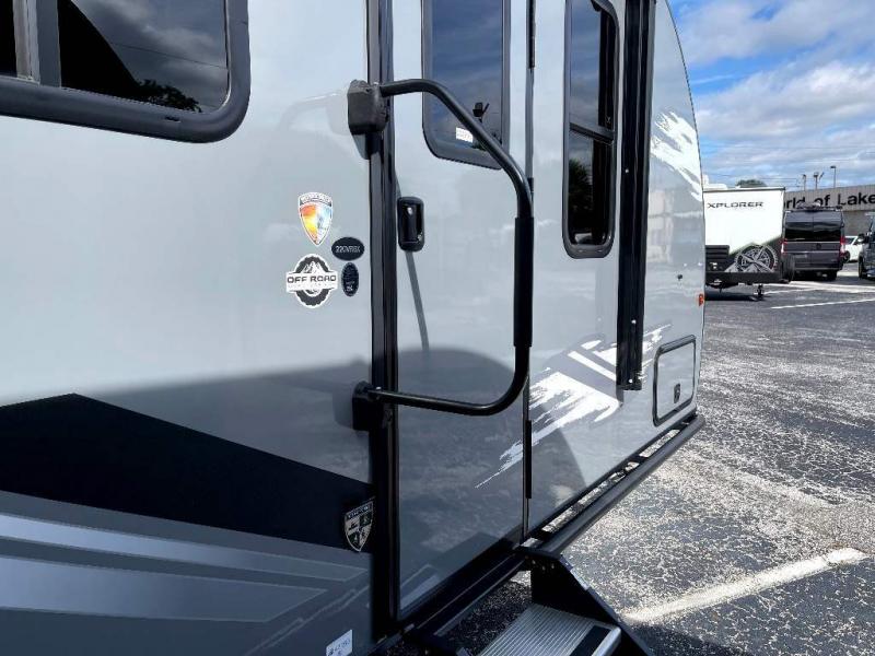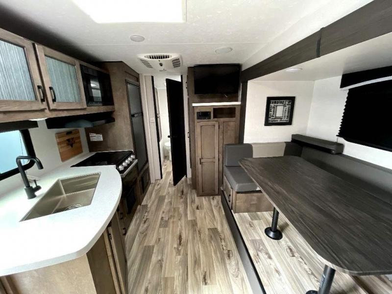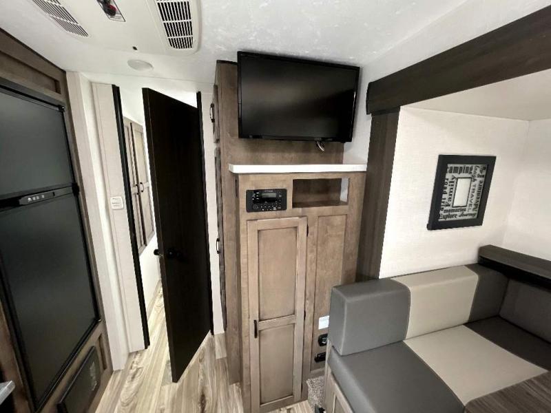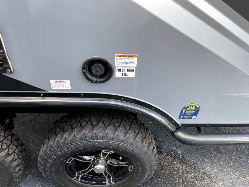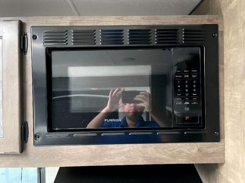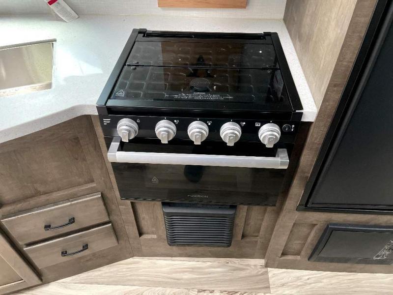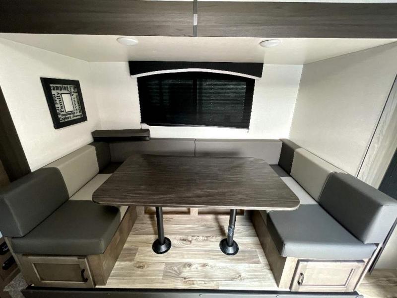A cook will love this trailer with the choice to make meals inside with full amenities including an 8 cu. ft. refrigerator and a pantry, or outside while using the campfire cafe which offers a griddle and refrigerator, plus counter space to prepare and serve meals. There is sleeping space for four when you utilize the U-shaped dinette slide out that also provides more interior floor space along with the versatile Murphy bed and sofa up front. You will also find a privacy curtain that will section off this area that also features StorMore bedside nightstands with a 110V outlet and USB charging, and two wardrobes.