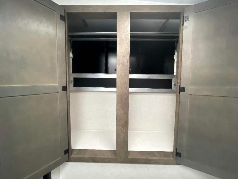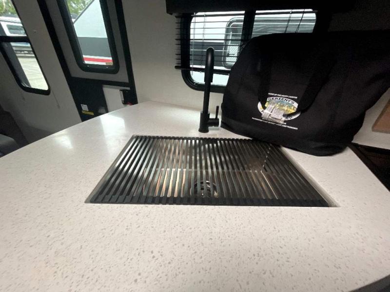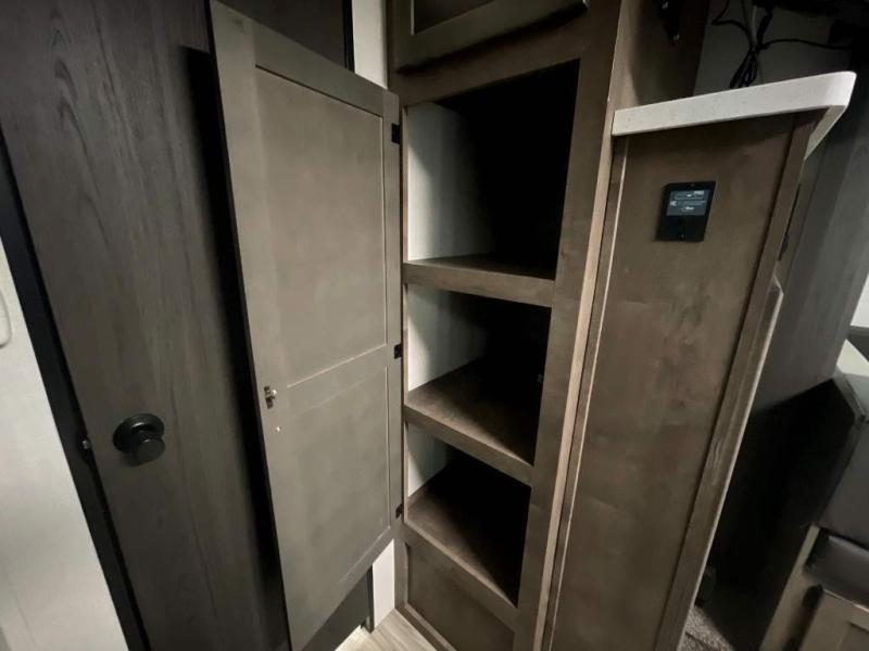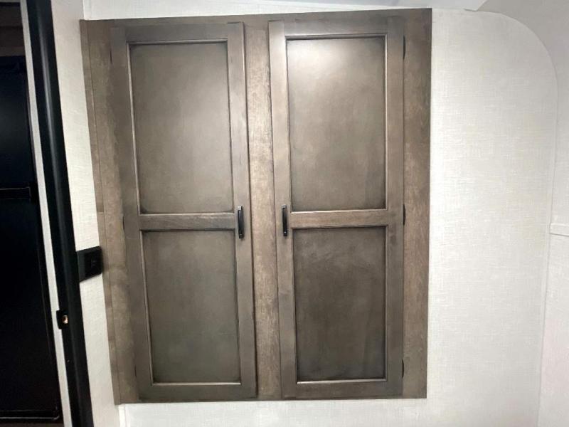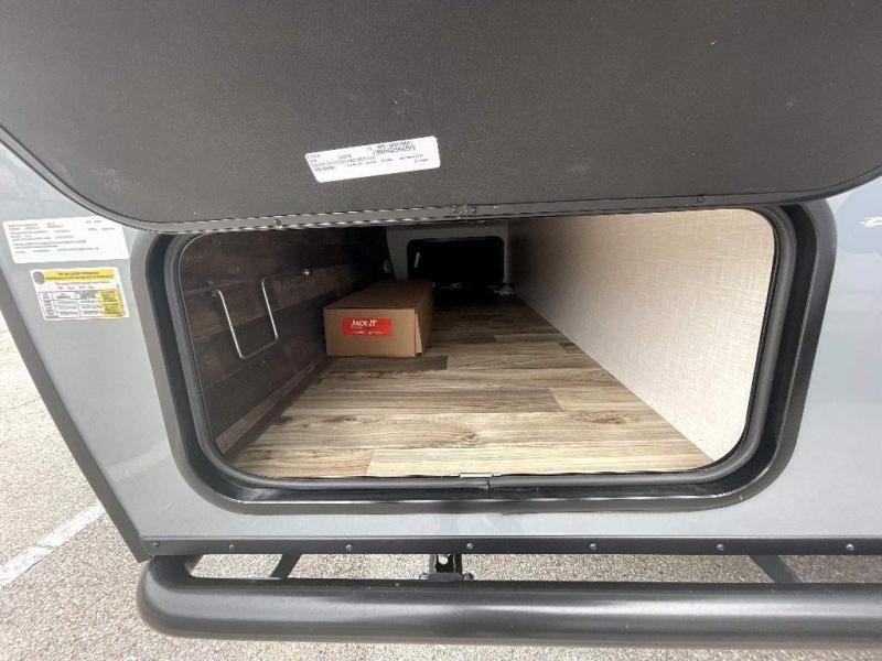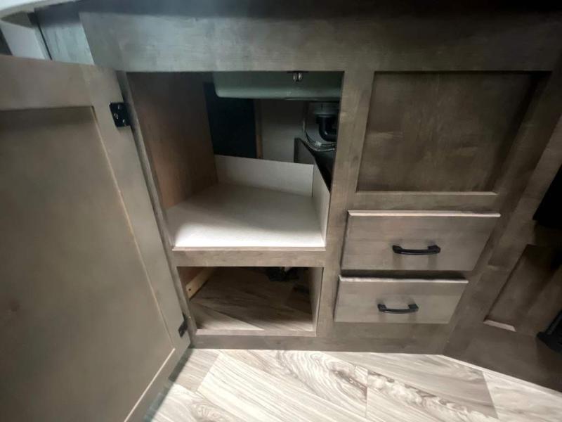 Head to your favorite spot in the woods with this travel trailer! There is a front 60" x 75" queen bed with a privacy curtain to draw at night or you can switch it out for an optional Murphy bed with sofa. Keep your perishables fresh with the 7 cu. ft. refrigerator, prepare your best meals with the three burner cooktop, and enjoy them at the 88" x 47" U-shaped dinette slide which can also transform into an extra sleeping space for a guest or two to tag along. Next to the pantry is an entertainment center and the rear corner bathroom with a glass 34" radius shower to freshen up in each morning. Store all of your outdoor gear either inside the exterior pass-through storage area or in the garage storage system!