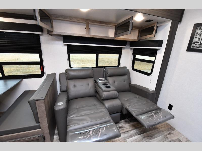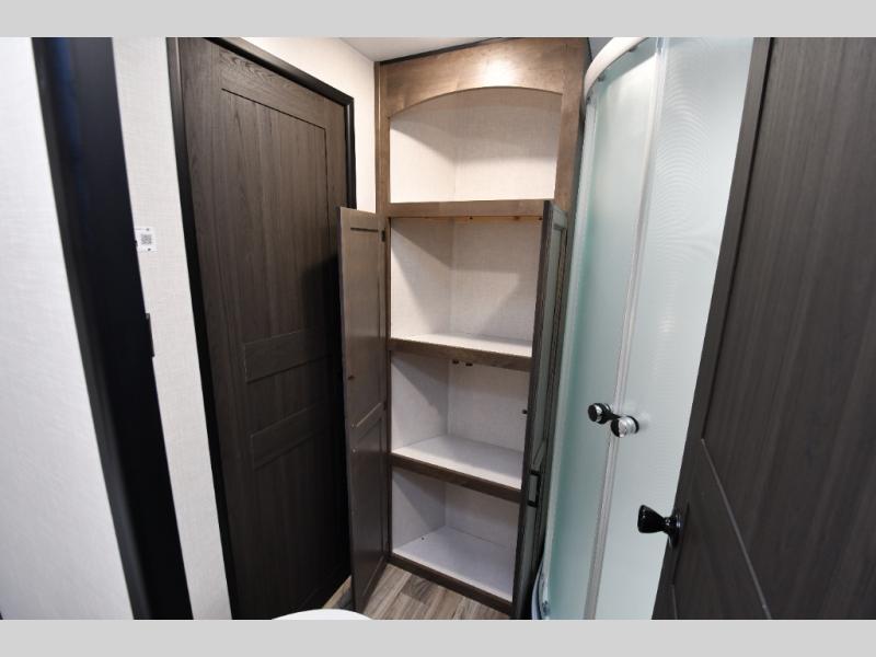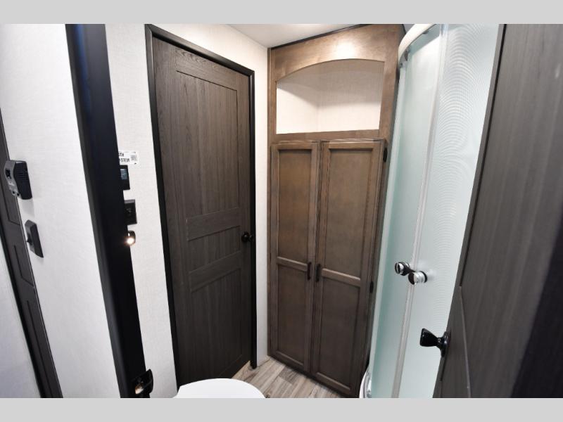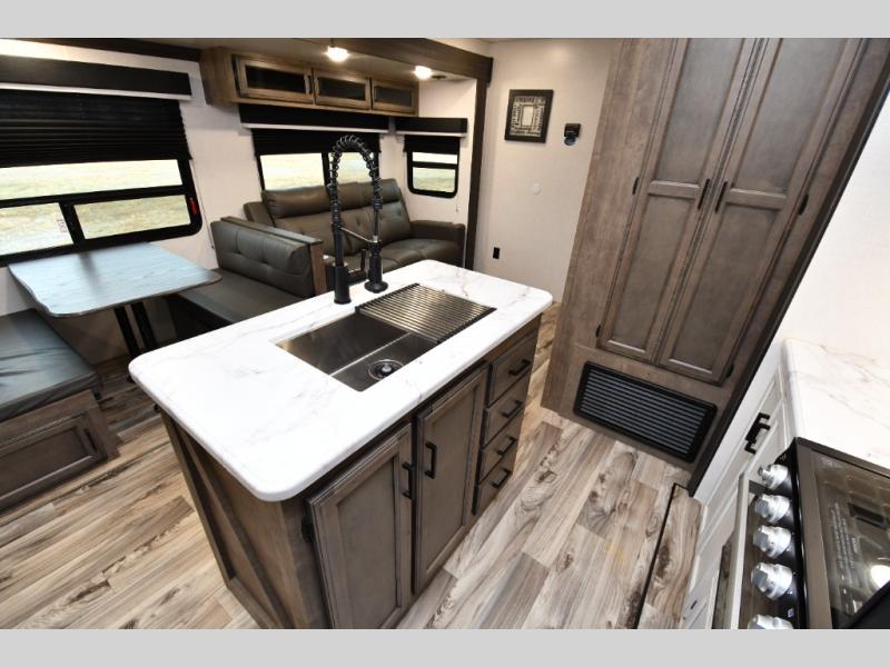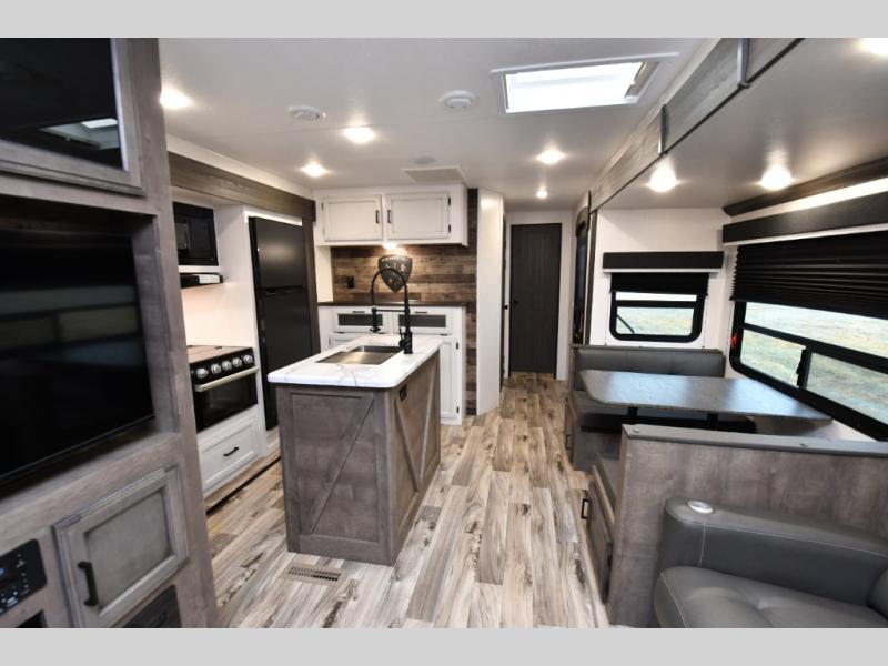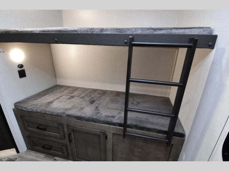 The family-friendly layout truly shines with a private rear bunkhouse that gives kids or guests their own dedicated space, complete with multiple bunks, a sofa with table, and convenient storage. Up front, the private bedroom offers a quiet retreat, while the centrally located dual entry bathroom with a radius shower provides easy access from both the hallway and bedroom. A functional kitchen island adds prep space and storage, and thoughtful construction details like ample pass-through storage and seasonal-ready features make this SportTrek a comfortable, confidence-inspiring choice for your next adventure.