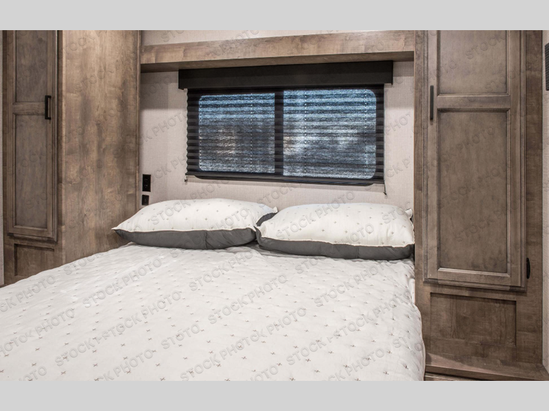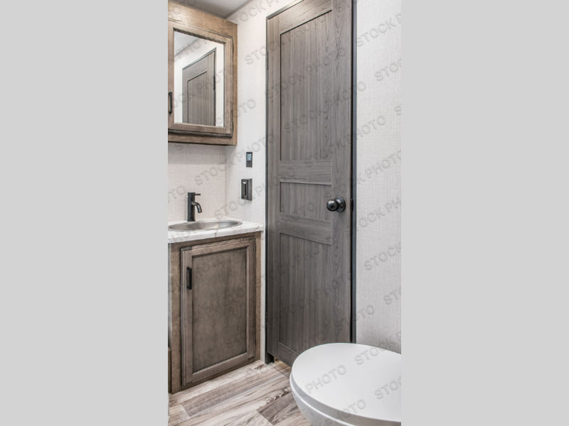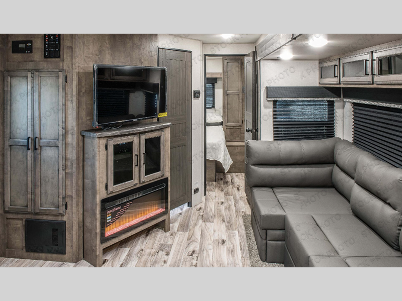 A front kitchen in this travel trailer provides more interior space! Once you have prepared your best meals with the three burner cooktop, you can head to the 42" grand dinette and enjoy dining comfortably. The 70" sofa also offers a comfortable place to take an afternoon nap or sit while enjoying the entertainment center with a 5,000 BTU frameless fireplace and 40" TV on a swing arm. A dual entry bathroom makes it easy for all to enter and has a 34" radius shower to freshen up in each morning. The rear private bedroom has a Sleep Tight queen bed for a good night's rest, wardrobes on either side of it, and an entrance into the bathroom too!
