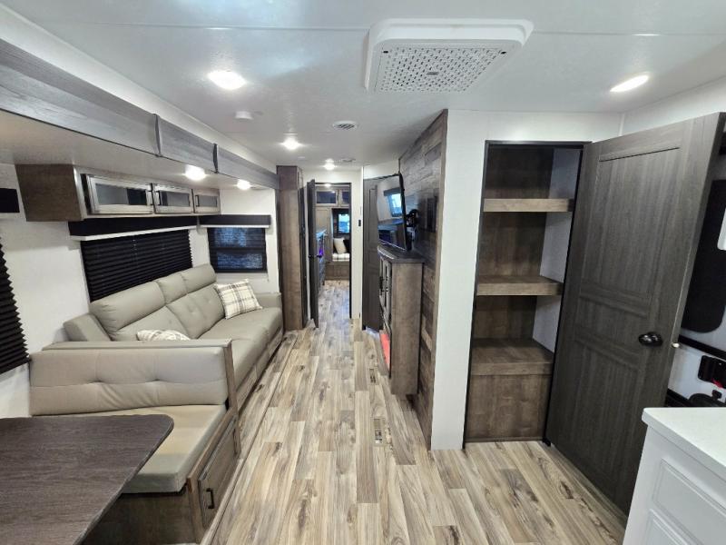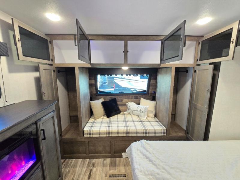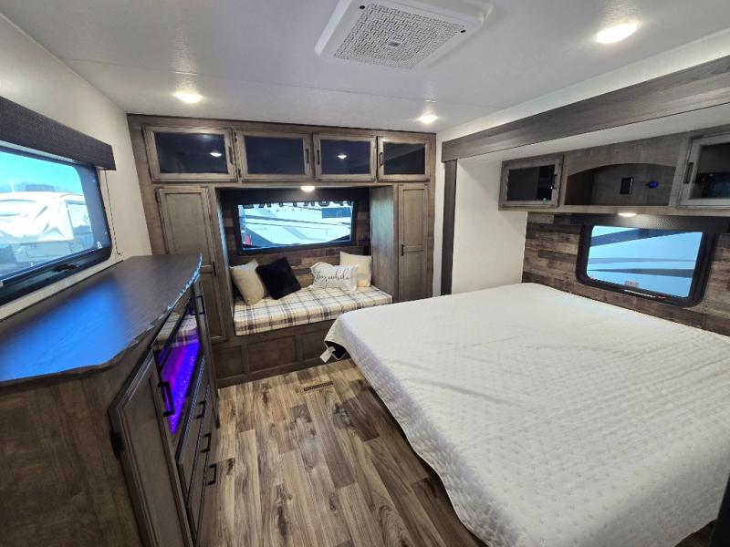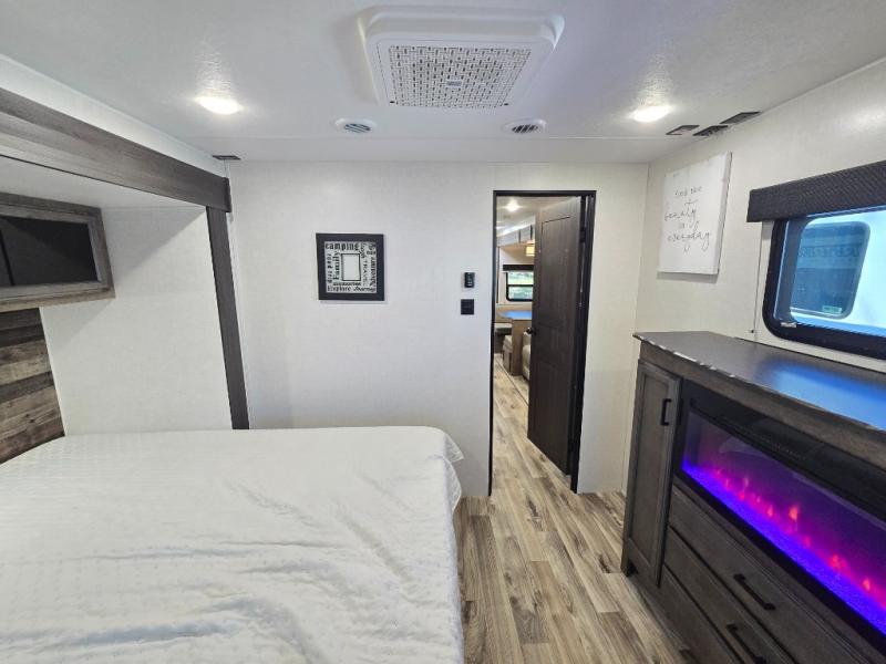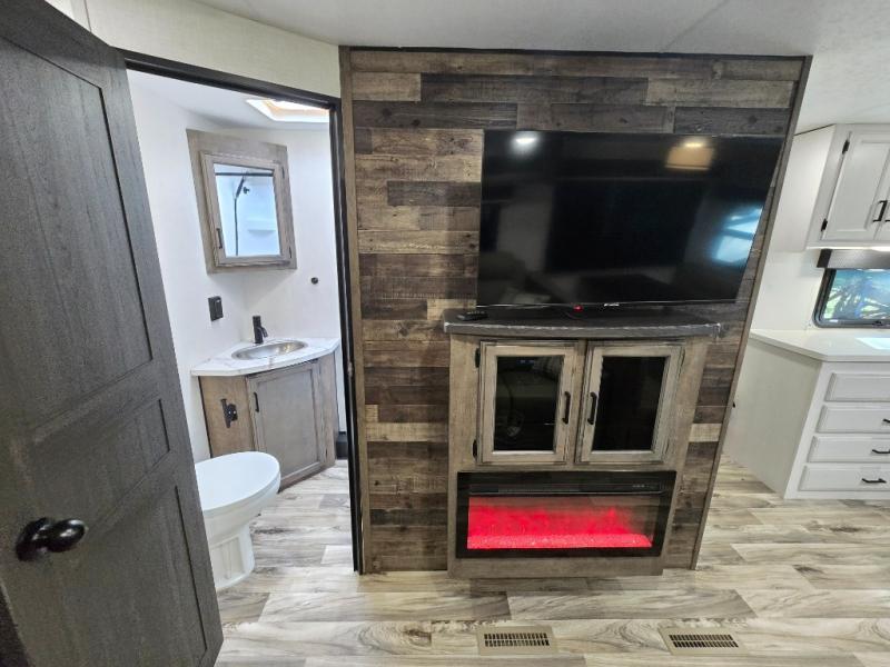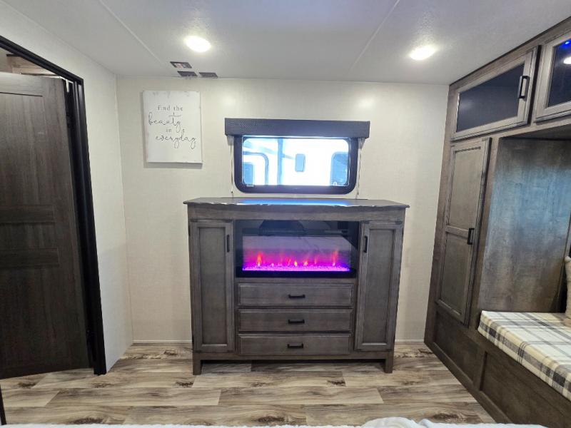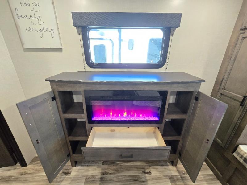 This travel trailer is perfect for two people who want to escape from everyday life! The front private bedroom has a 70" x 80" Sleep Tight king bed slide for more interior space, a dresser with a 30" frameless fireplace and TV, and a window seat to read a book with a view. Freshen up each morning in the full bathroom with the 30" x 36" shower then head to the rear kitchen to fry up some eggs on the three burner cooktop. The 42" grand dinette offers a comfortable place to enjoy your meals, play card games, and even transform into an extra sleeping space. Grab a snack from the walk-in pantry and relax on the 70" tri-fold sofa across from the entertainment center with a 30" frameless fireplace!