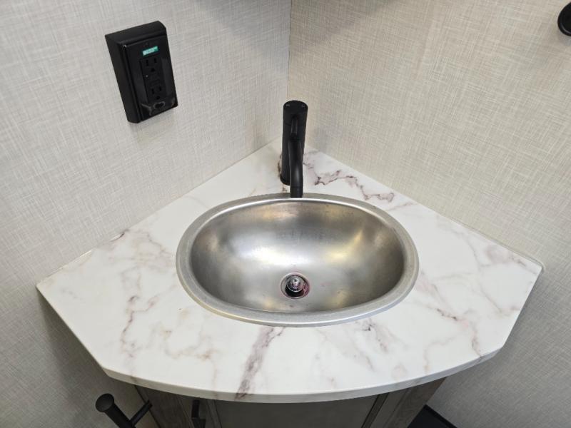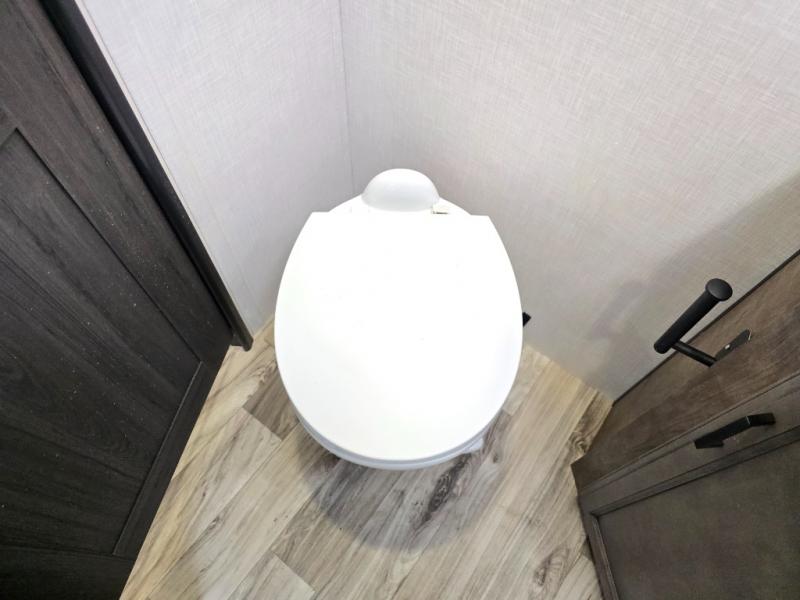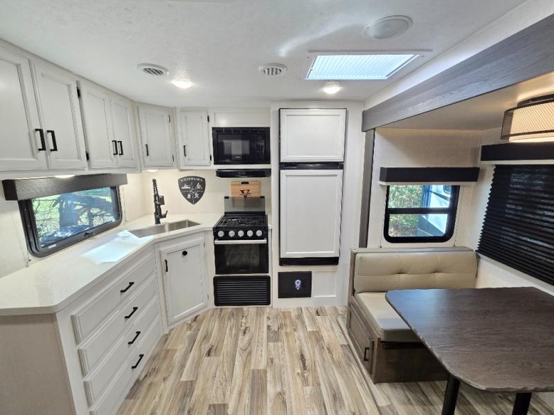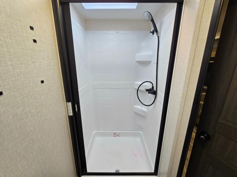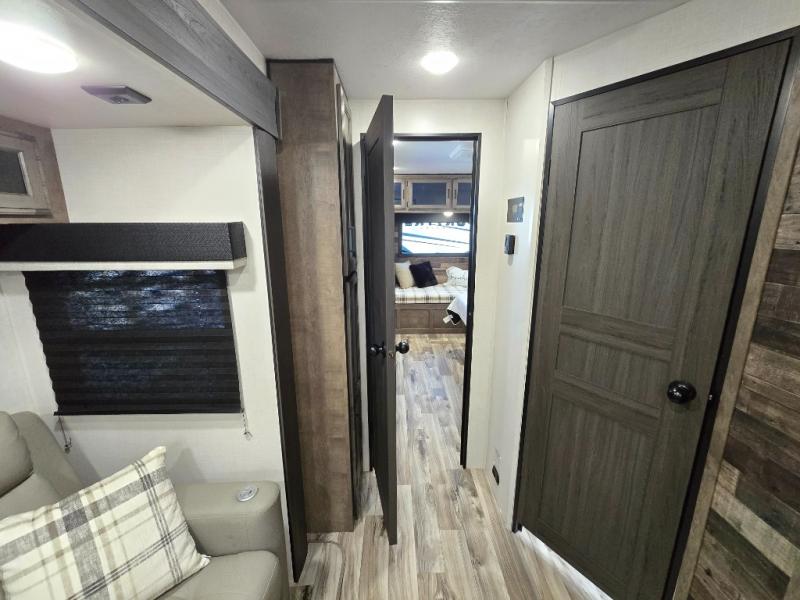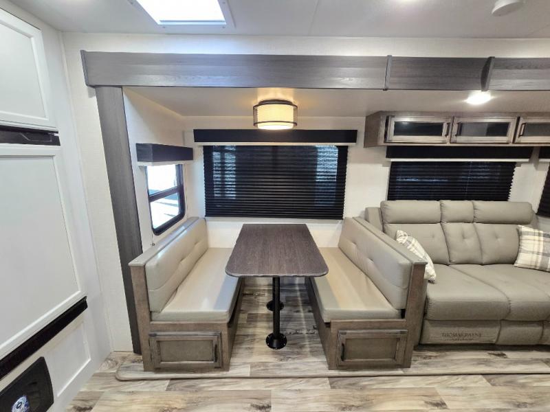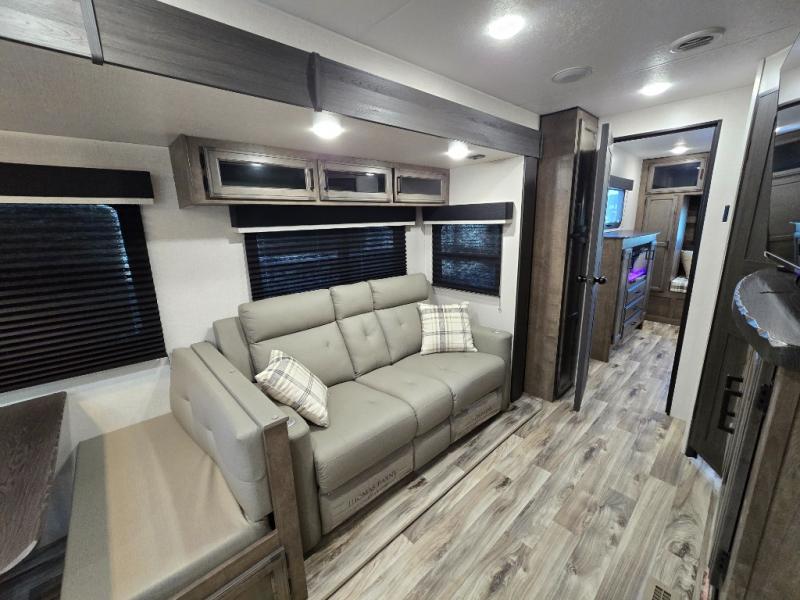 This travel trailer is perfect for two people who want to escape from everyday life! The front private bedroom has a 70" x 80" Sleep Tight king bed slide for more interior space, a dresser with a 30" frameless fireplace and TV, and a window seat to read a book with a view. Freshen up each morning in the full bathroom with the 30" x 36" shower then head to the rear kitchen to fry up some eggs on the three burner cooktop. The 42" grand dinette offers a comfortable place to enjoy your meals, play card games, and even transform into an extra sleeping space. Grab a snack from the walk-in pantry and relax on the 70" tri-fold sofa across from the entertainment center with a 30" frameless fireplace!