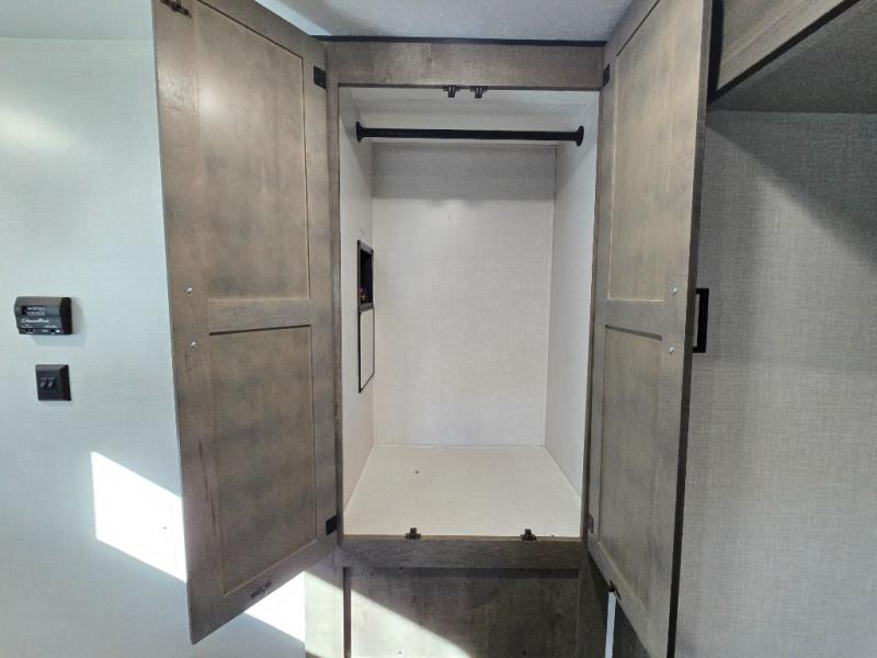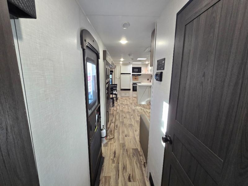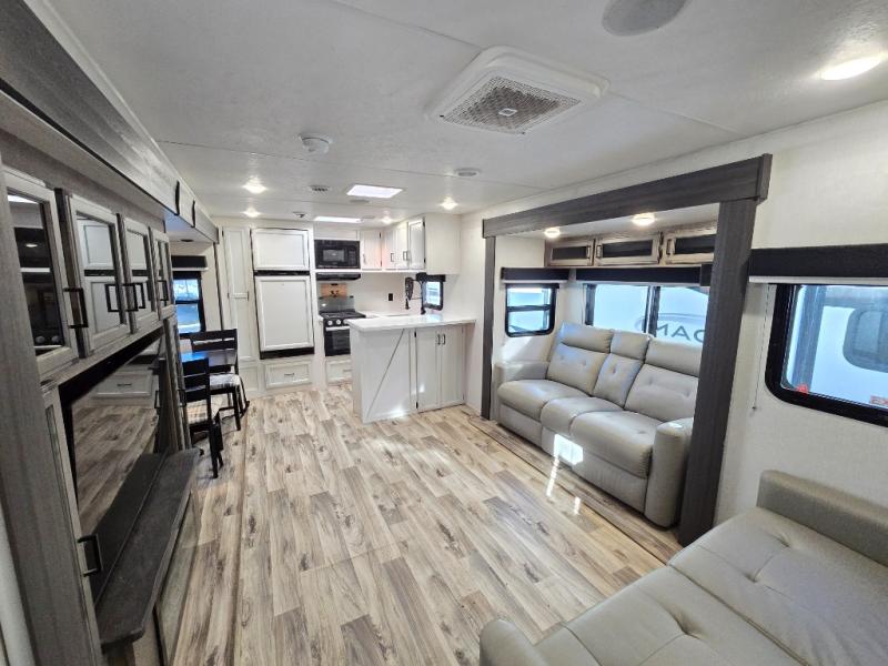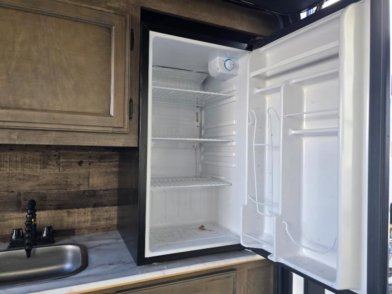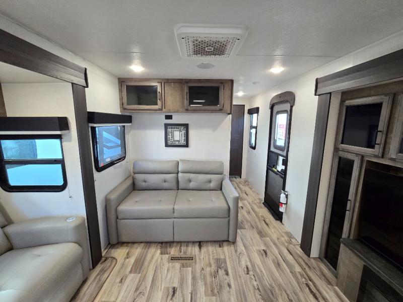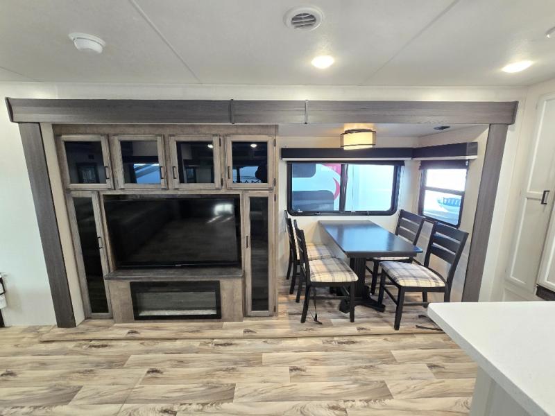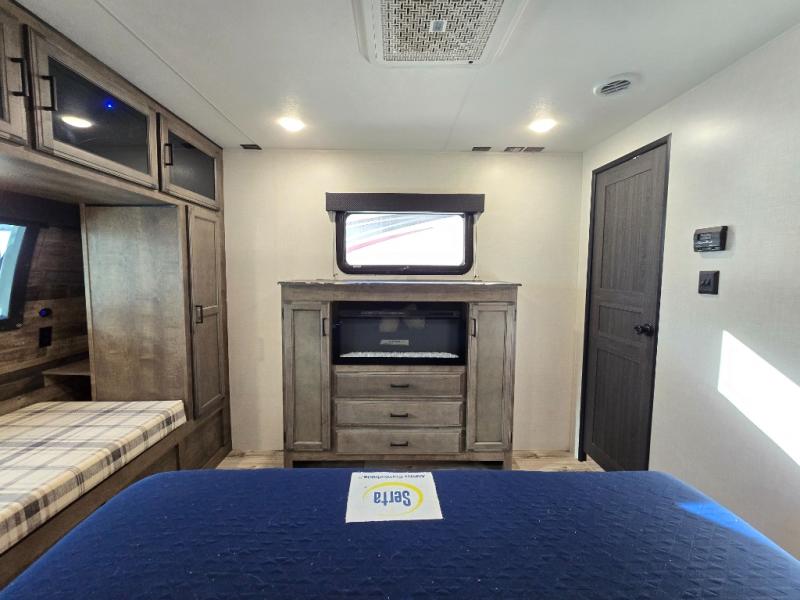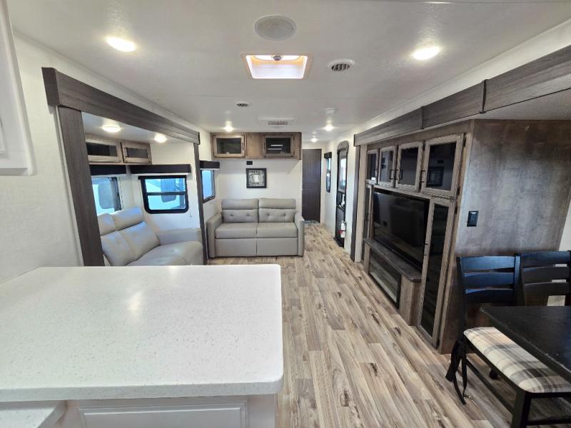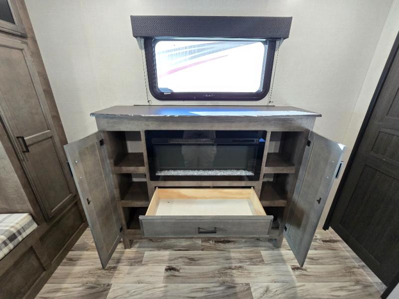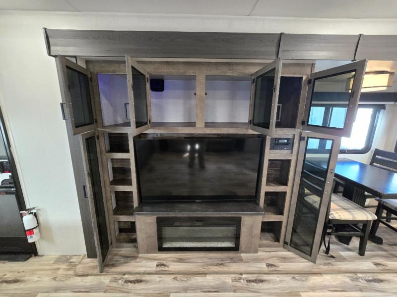 The chef will feel right at home cooking in the rear kitchen with all of the countertop space in this travel trailer! They can even head outside to breathe in some fresh air while cooking at the exterior campfire café with a refrigerator, a sink with countertop space, and a griddle. Relax each night in the middle living area with the 64" sofa and the slide that has theater seating with USB charging across from the entertainment center with a TV and 30" frameless fireplace. When you're ready to wind down your nights, take a hot shower in the full bathroom with the 30" x 36" shower then head to the front private bedroom and either read a book at the window seat or lay in the 70" x 80" sleep tight king bed slide while watching a movie with the TV or watch the 30" frameless fireplace!
