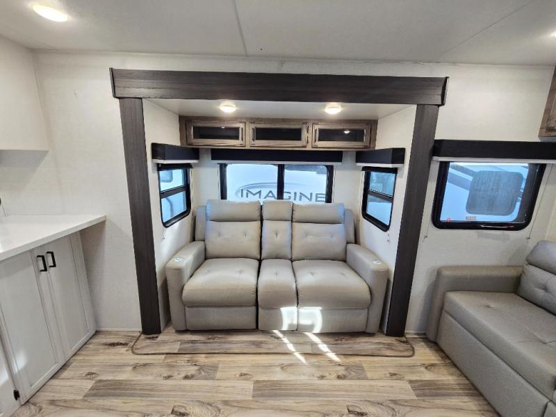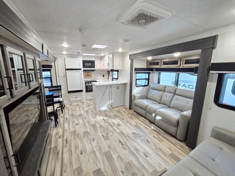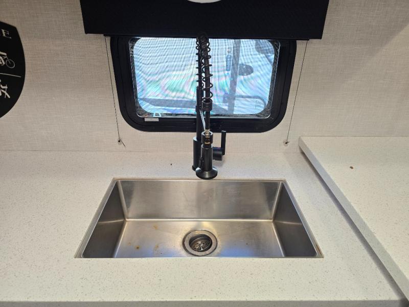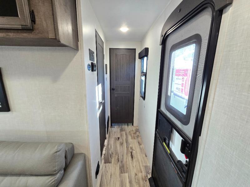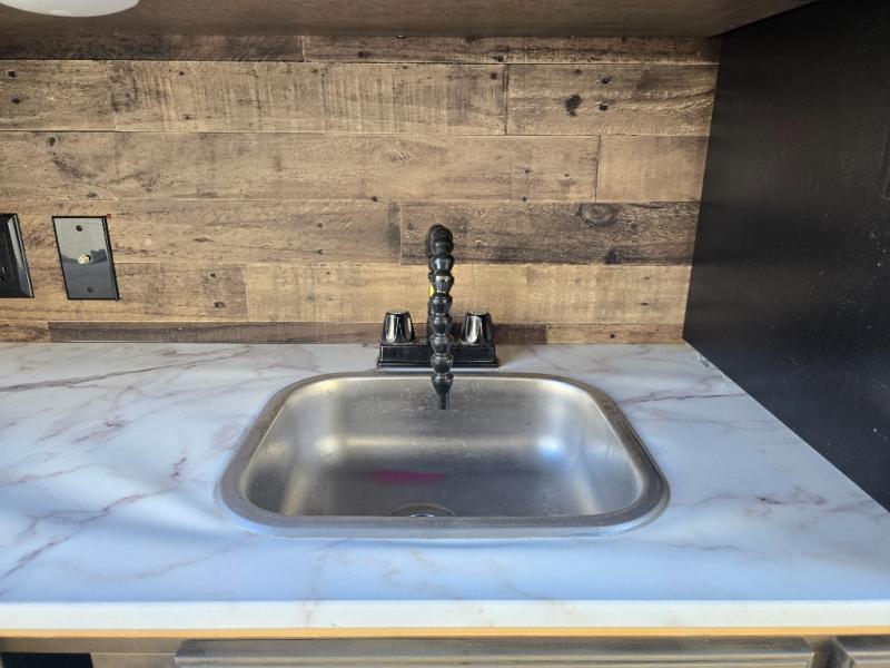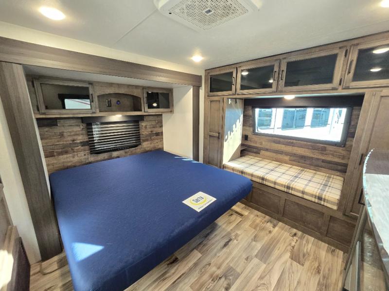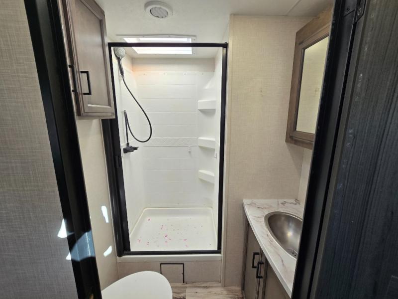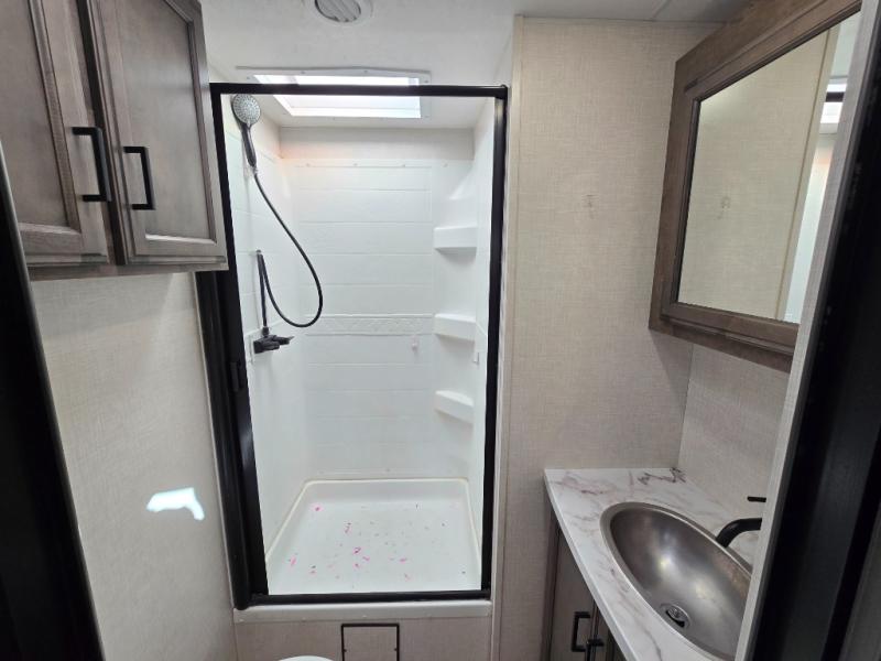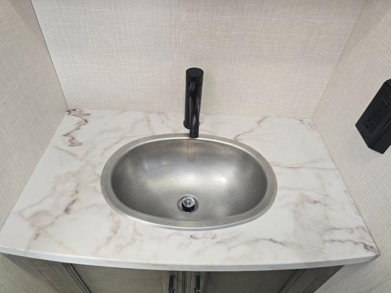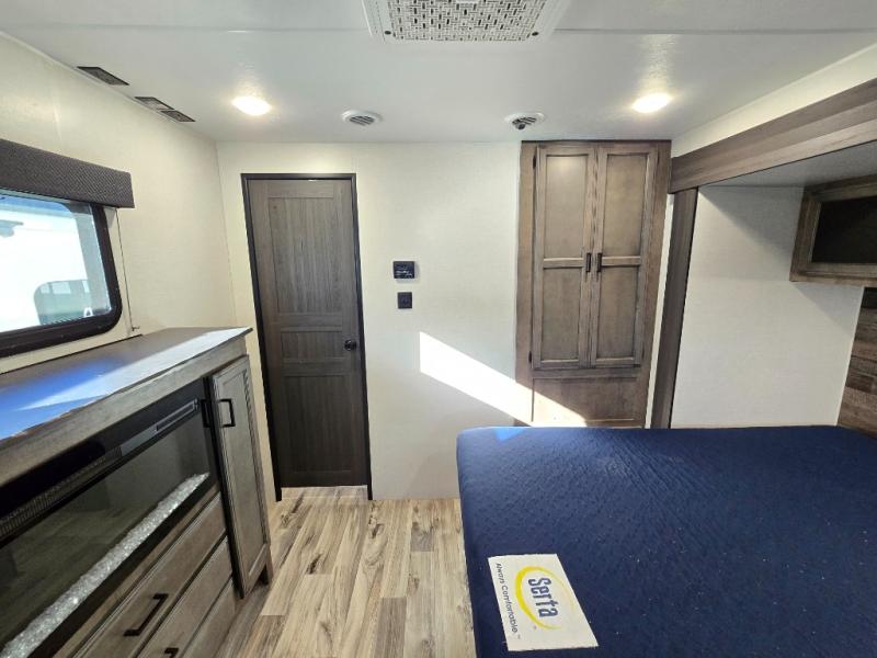 The chef will feel right at home cooking in the rear kitchen with all of the countertop space in this travel trailer! They can even head outside to breathe in some fresh air while cooking at the exterior campfire café with a refrigerator, a sink with countertop space, and a griddle. Relax each night in the middle living area with the 64" sofa and the slide that has theater seating with USB charging across from the entertainment center with a TV and 30" frameless fireplace. When you're ready to wind down your nights, take a hot shower in the full bathroom with the 30" x 36" shower then head to the front private bedroom and either read a book at the window seat or lay in the 70" x 80" sleep tight king bed slide while watching a movie with the TV or watch the 30" frameless fireplace!