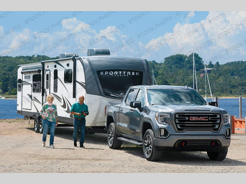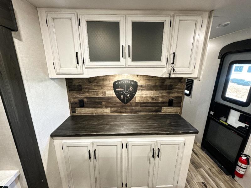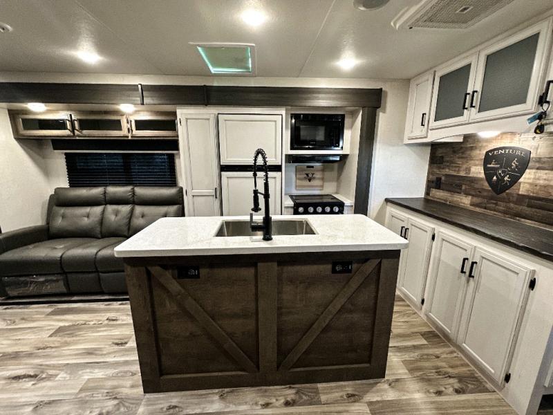 An elegant design and new features come with every one of these Venture RV SportTrek Touring Edition travel trailers! The NXG Huck bolt frame holds these units together and a walkable roof covers them. Heads will turn down the highway and at the campsite with an upgraded graphics package and a painted fiberglass front cap with integrated LED light. The exterior pass-through storage area has slam latch baggage doors with magnetic catches so you don't have to worry about them closing on you and a motion activated light to see your items clearly even at night. Luxury abounds throughout these units, especially with the mandatory Interior Luxury package which comes solid surface kitchen countertops, designer valances with fabric nightshades, two 30" frameless fireplaces, and Beauflor wood plank flooring that is easy to clean. Come find your favorite model today!