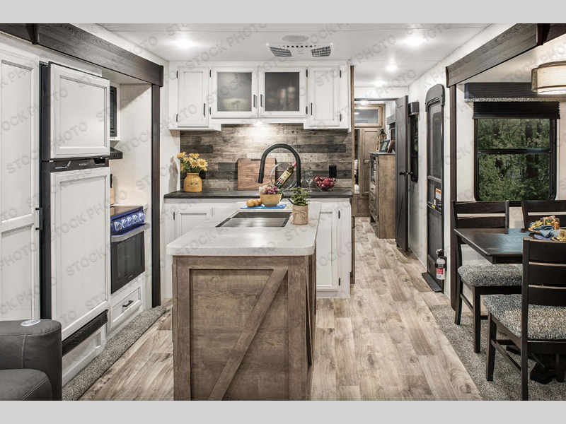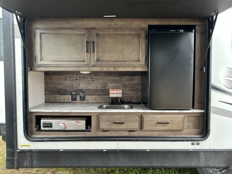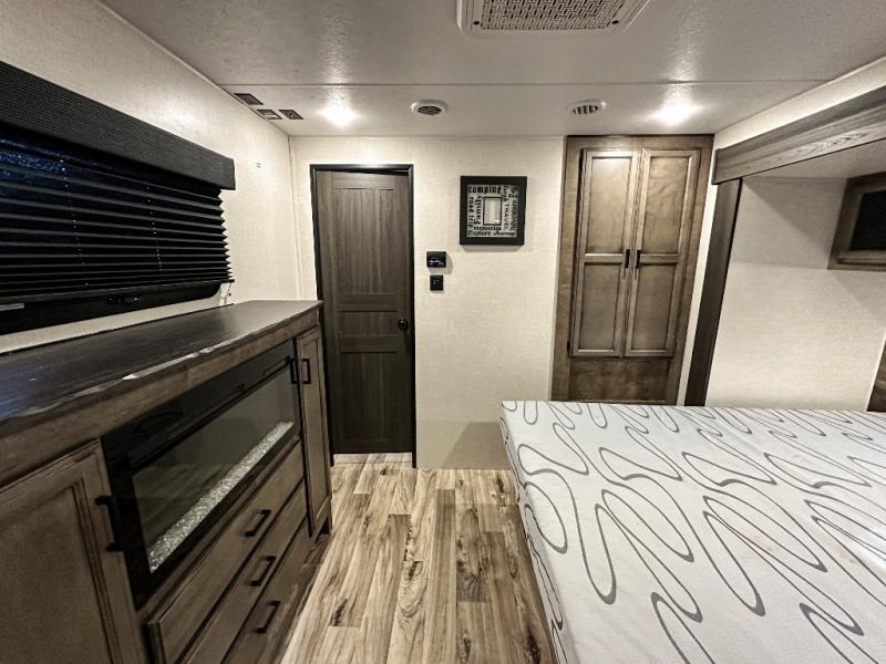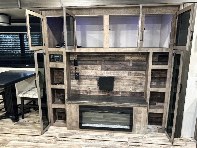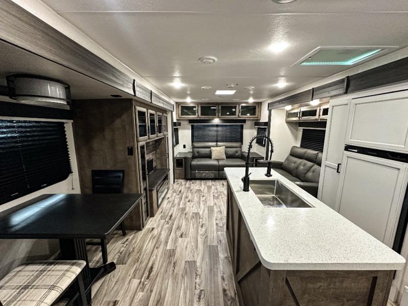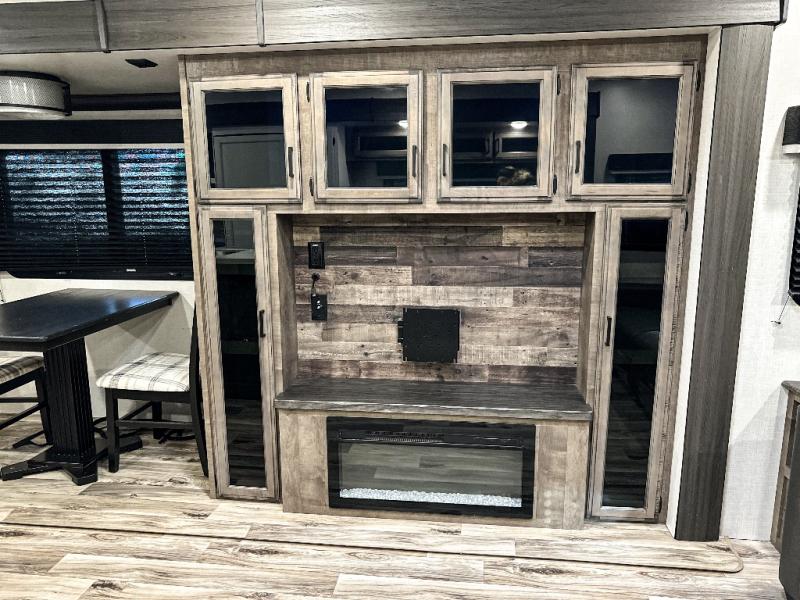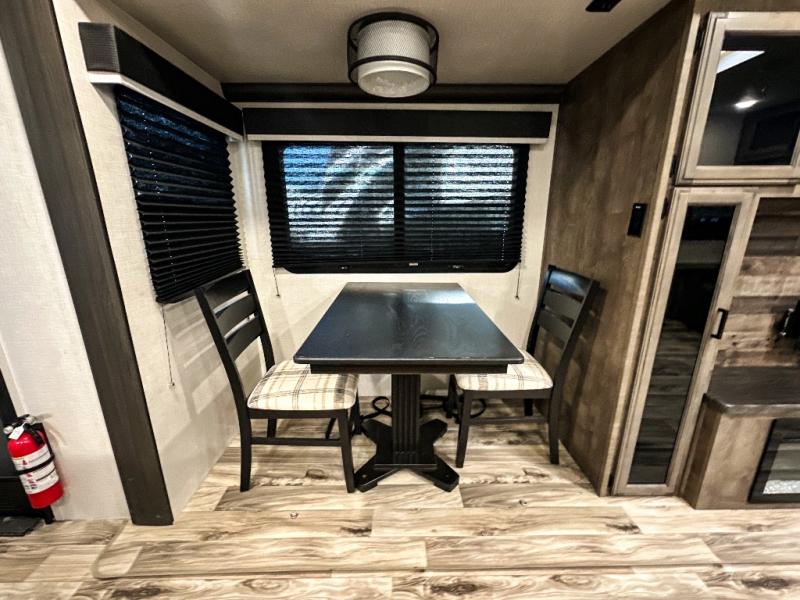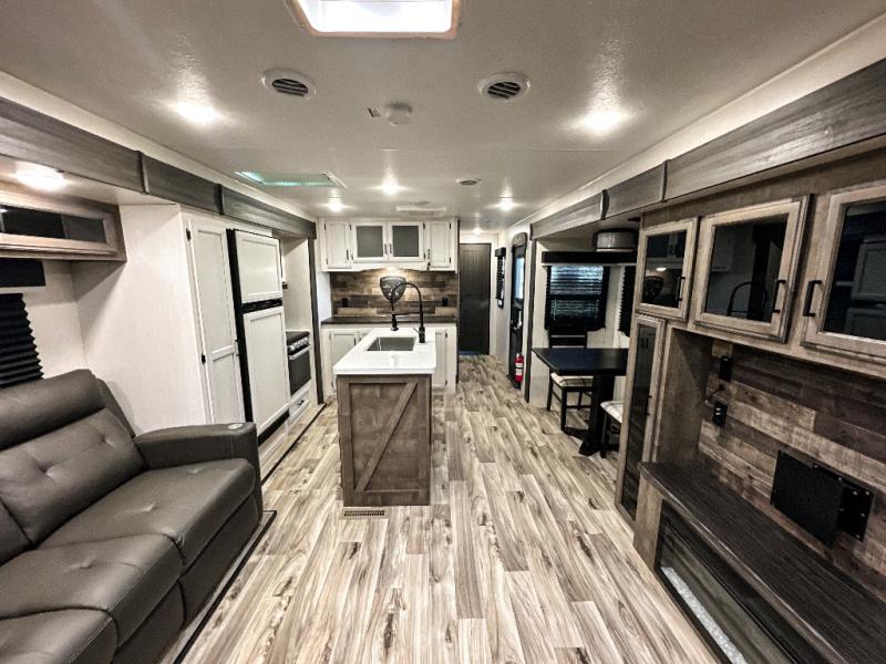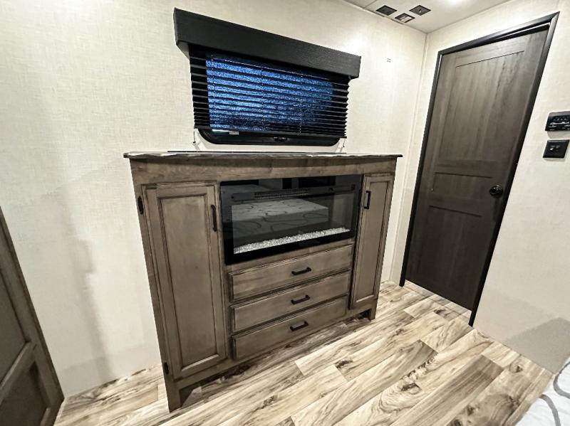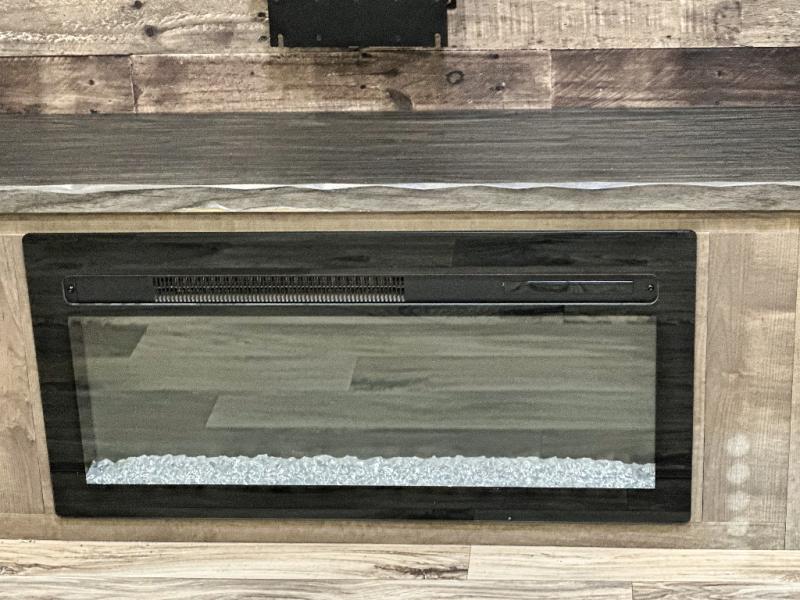Pack your bags and hitch up this travel trailer for a great weekend camping trip! The front private bedroom has a 70" x 80" Sleep Tight king bed slide to lay your head at night, a dresser with a 30" frameless fireplace, a window seat with shelves on either side for your books, and a wardrobe with washer and dryer prep. Freshen up each morning in the full bathroom with the 30" x 36" shower then head to the kitchen to fry up some eggs on the three burner cooktop and pour a cold glass of orange juice stored in the 10 cu. ft. refrigerator. The kitchen island will make your meal prepping easier and the table and chairs offer a comfortable place to enjoy your meals or play card games. You could even cook your meals at the exterior campfire café and set up a table underneath one of the two power awnings!