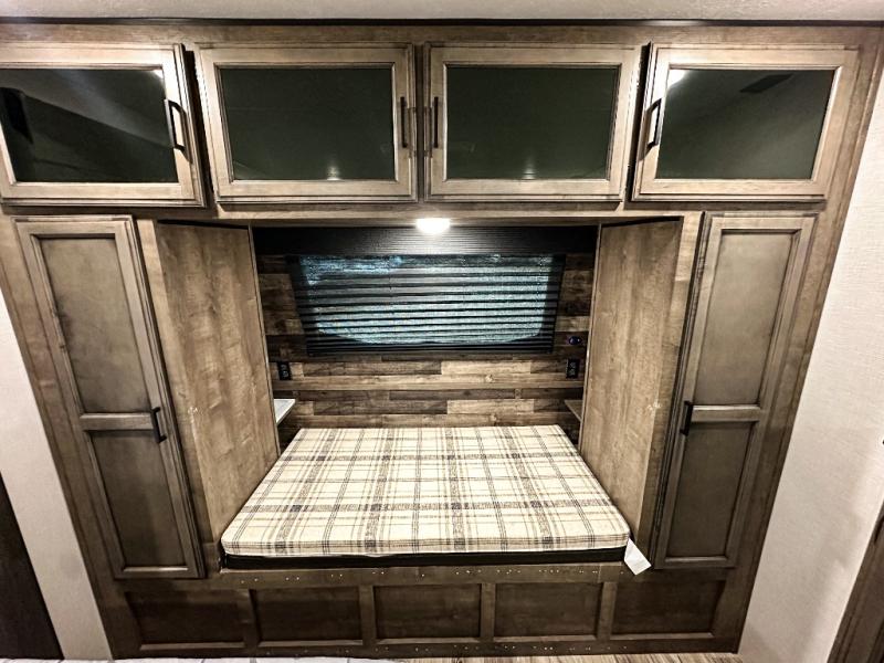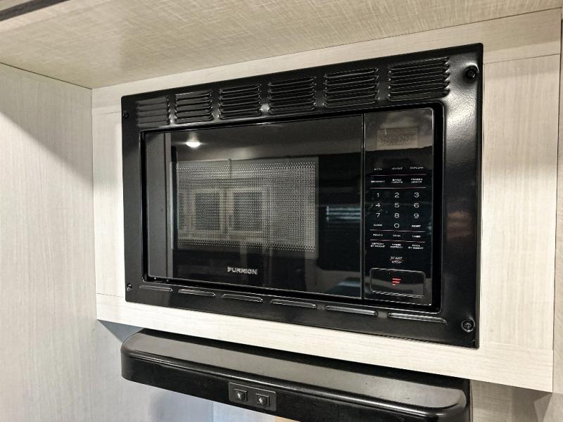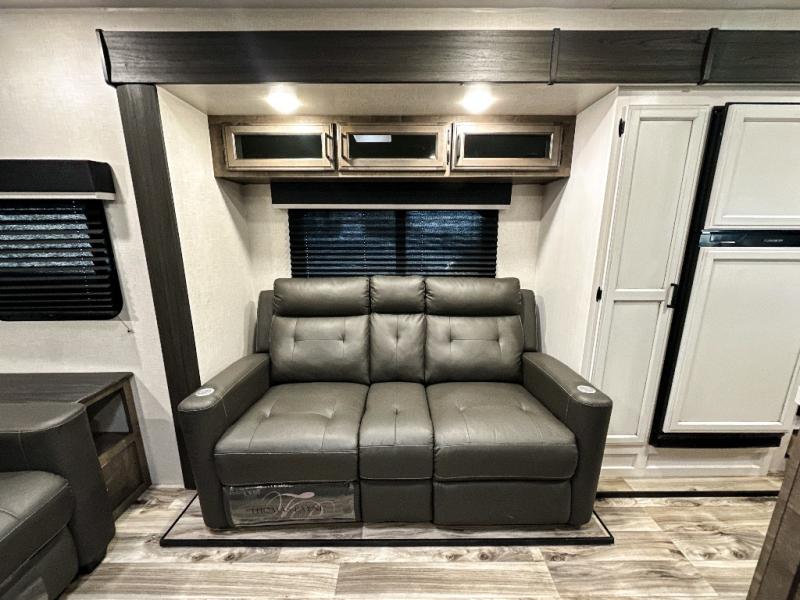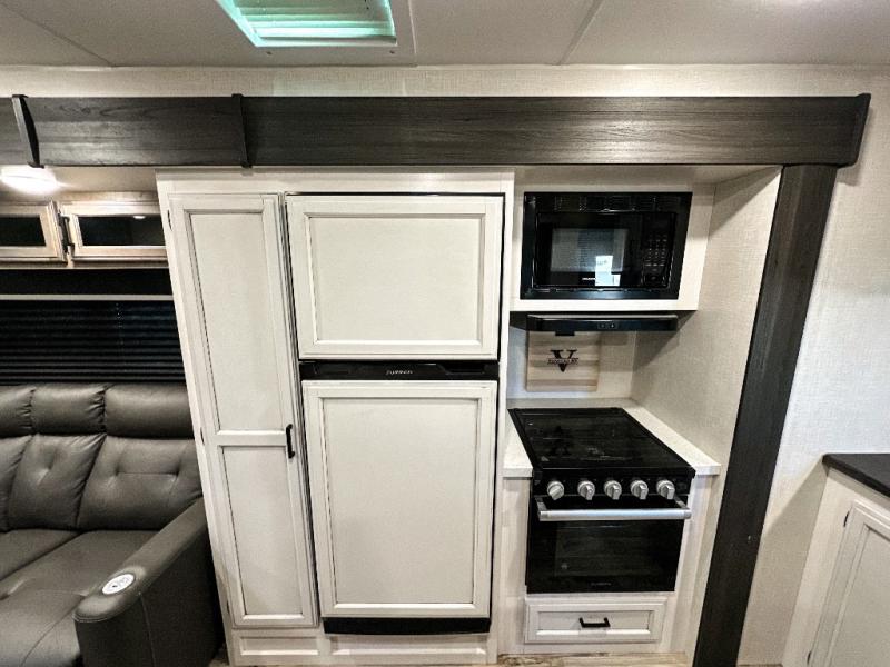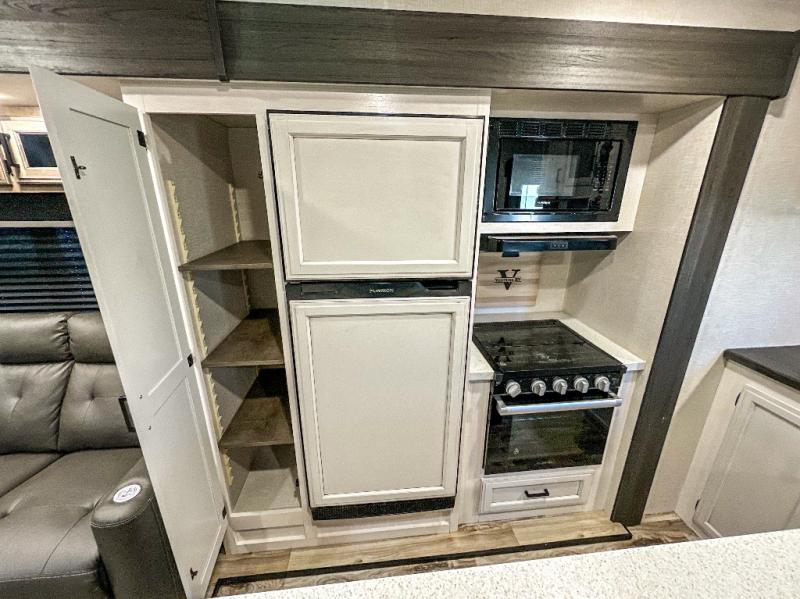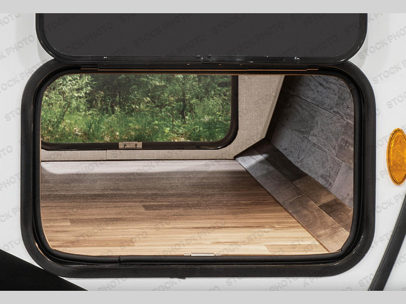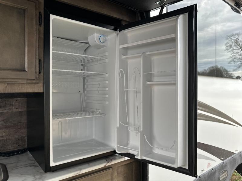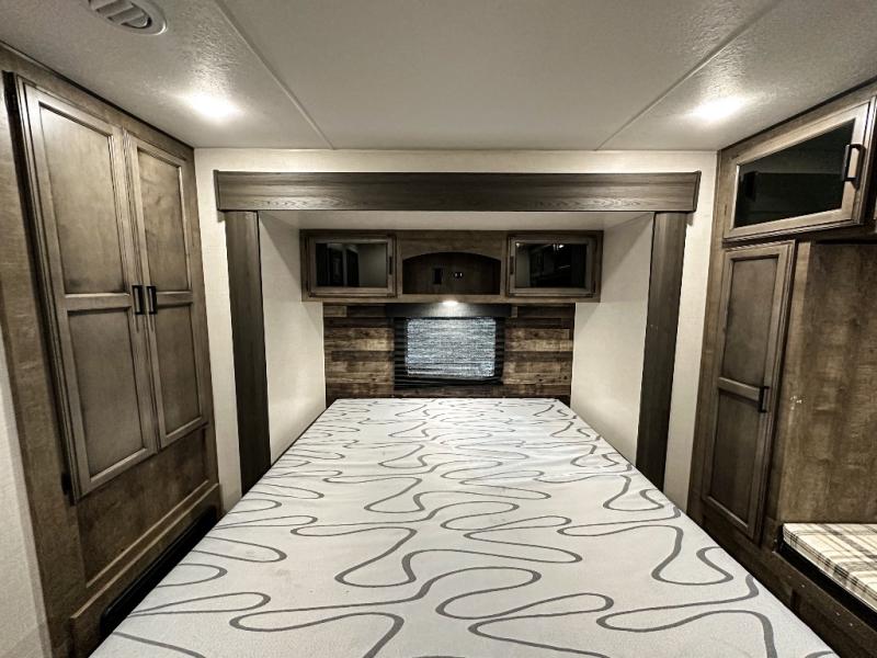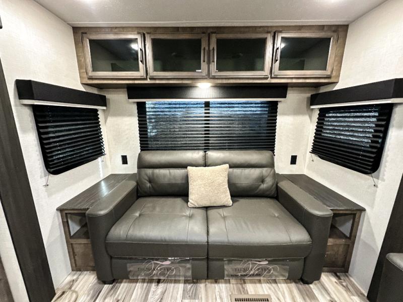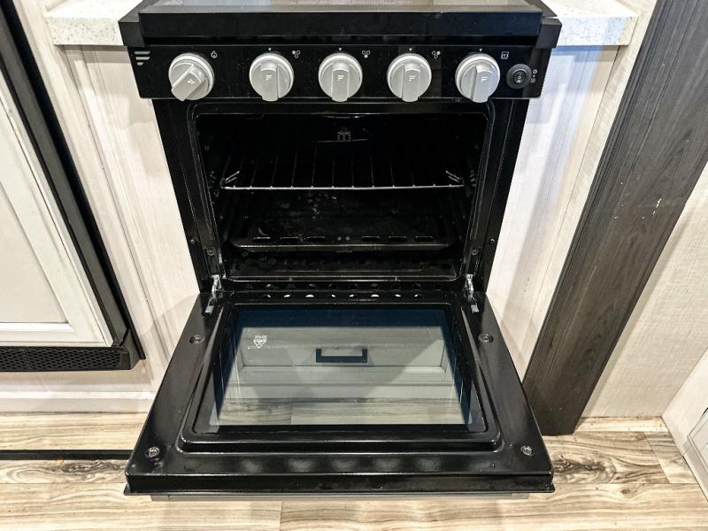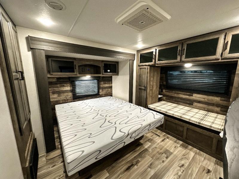 Pack your bags and hitch up this travel trailer for a great weekend camping trip! The front private bedroom has a 70" x 80" Sleep Tight king bed slide to lay your head at night, a dresser with a 30" frameless fireplace, a window seat with shelves on either side for your books, and a wardrobe with washer and dryer prep. Freshen up each morning in the full bathroom with the 30" x 36" shower then head to the kitchen to fry up some eggs on the three burner cooktop and pour a cold glass of orange juice stored in the 10 cu. ft. refrigerator. The kitchen island will make your meal prepping easier and the table and chairs offer a comfortable place to enjoy your meals or play card games. You could even cook your meals at the exterior campfire café and set up a table underneath one of the two power awnings!
